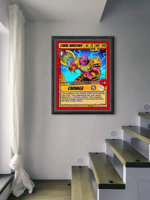 The elaborate golden spiked armor reads clearly from across the room. This cabal warchief trading card canvas print appeals to Ward TCG collectors who display their favorite cards. Furthermore, the stormy blue sky with white lightning bolts provides dramatic backdrop contrast.