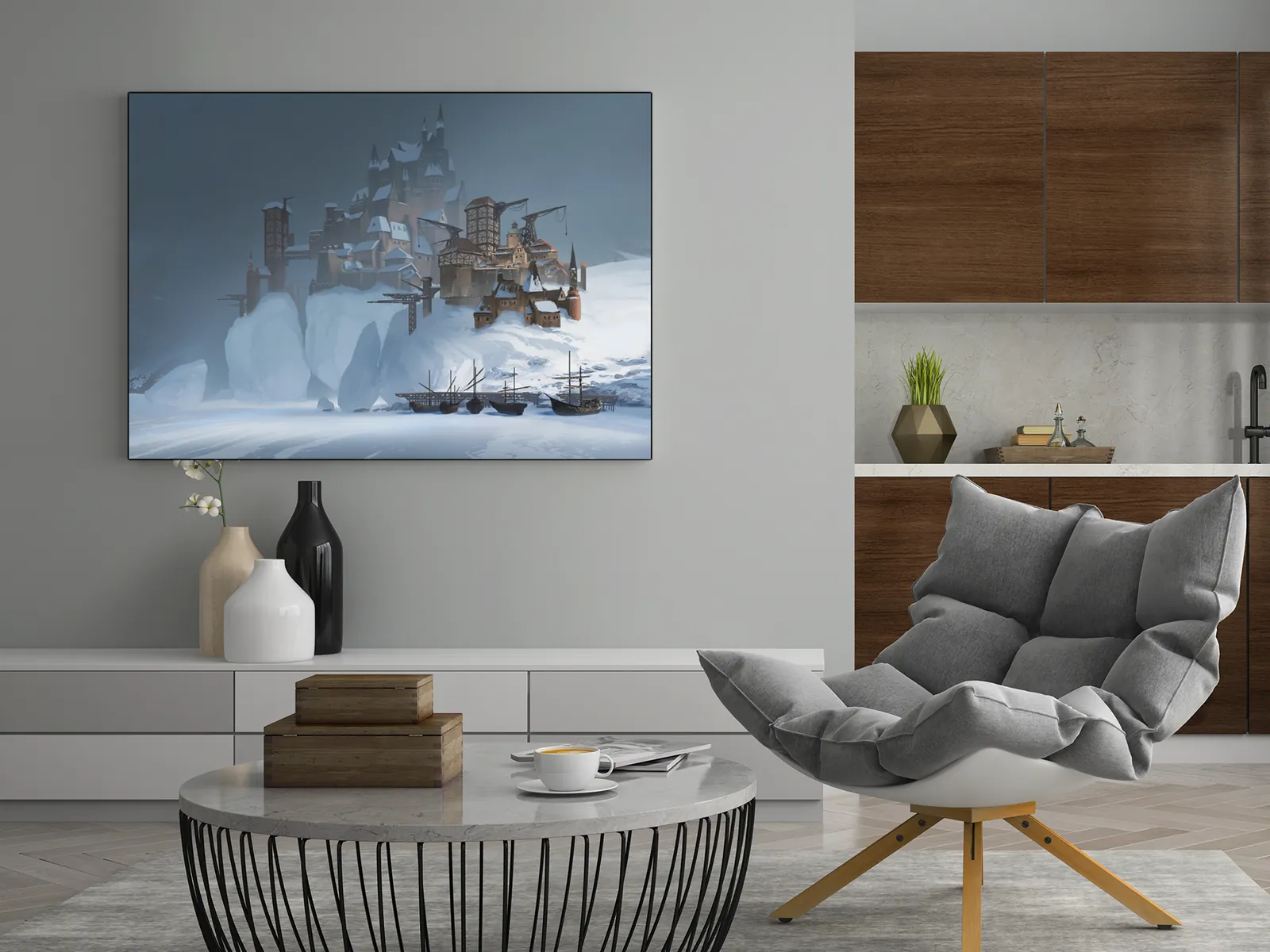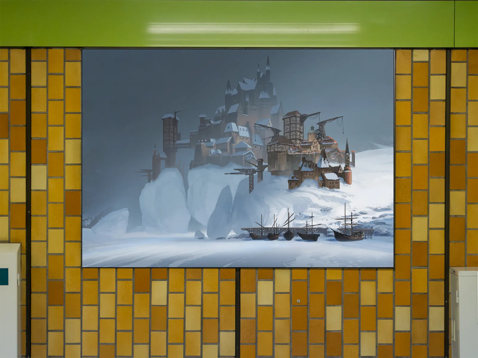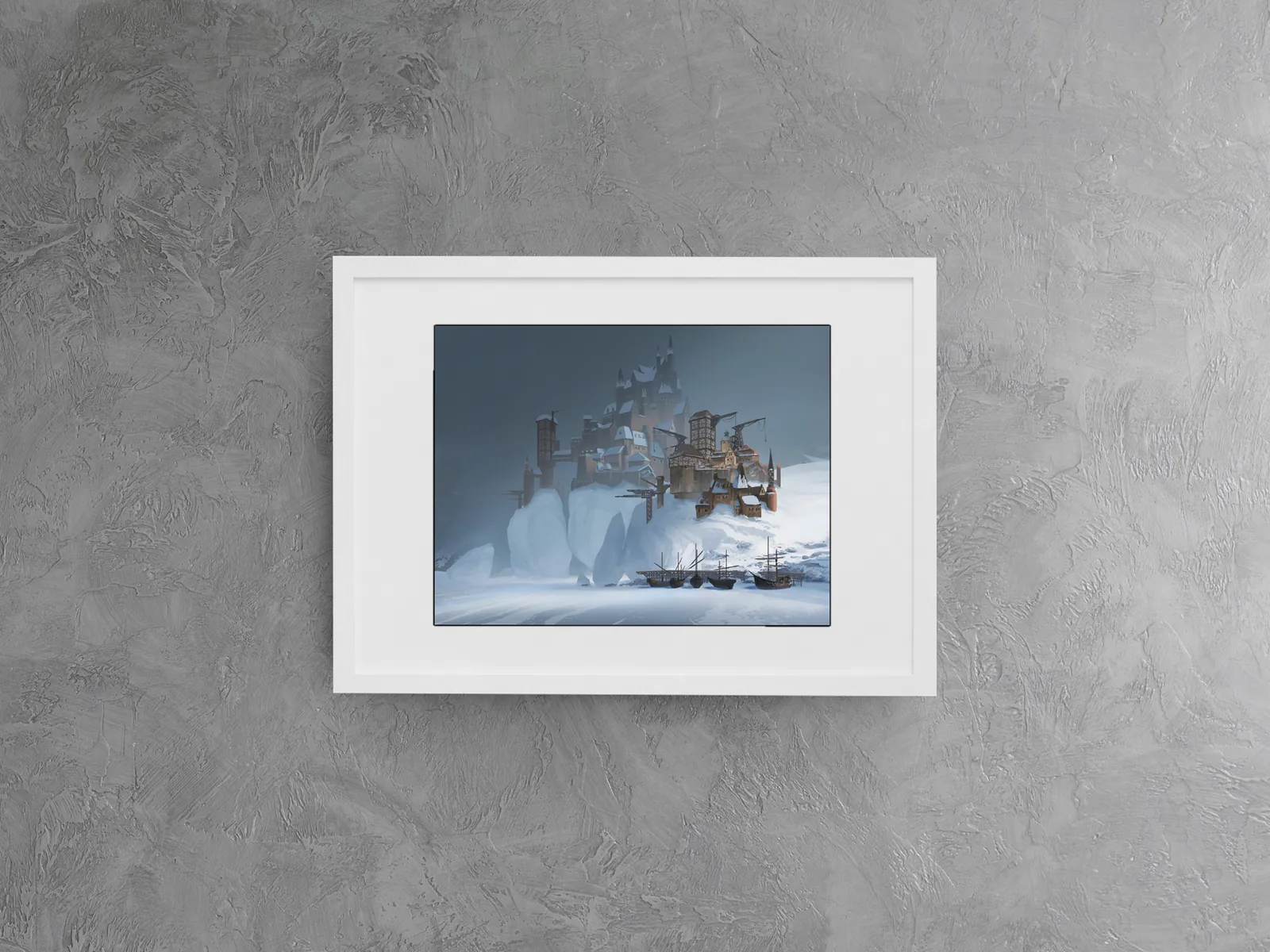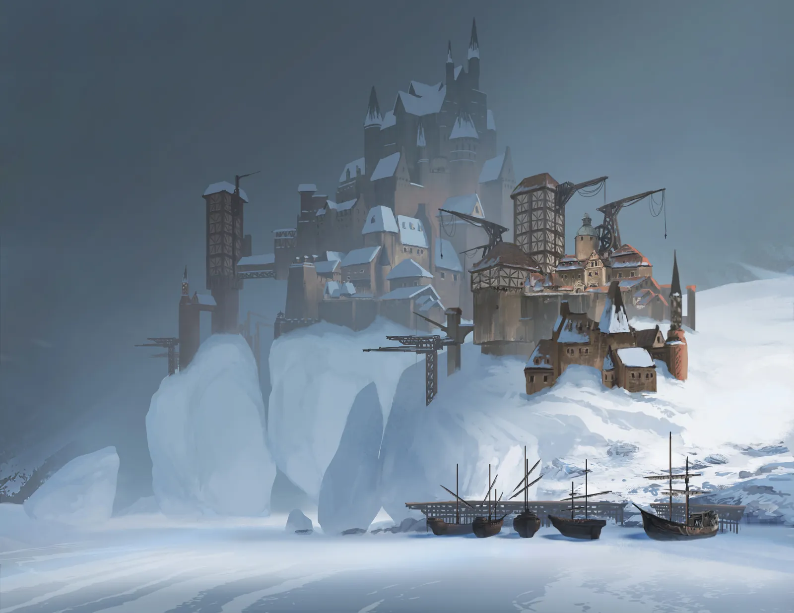 Moreover, cranes, towers, and layered stonework suggest constant construction and survival. However, the muted light and snow-softened edges temper the severity. Consequently, the settlement feels enduring rather than abandoned. Additionally, the scene communicates Smunchy Games world-building through architecture, weather, and geography instead of characters.