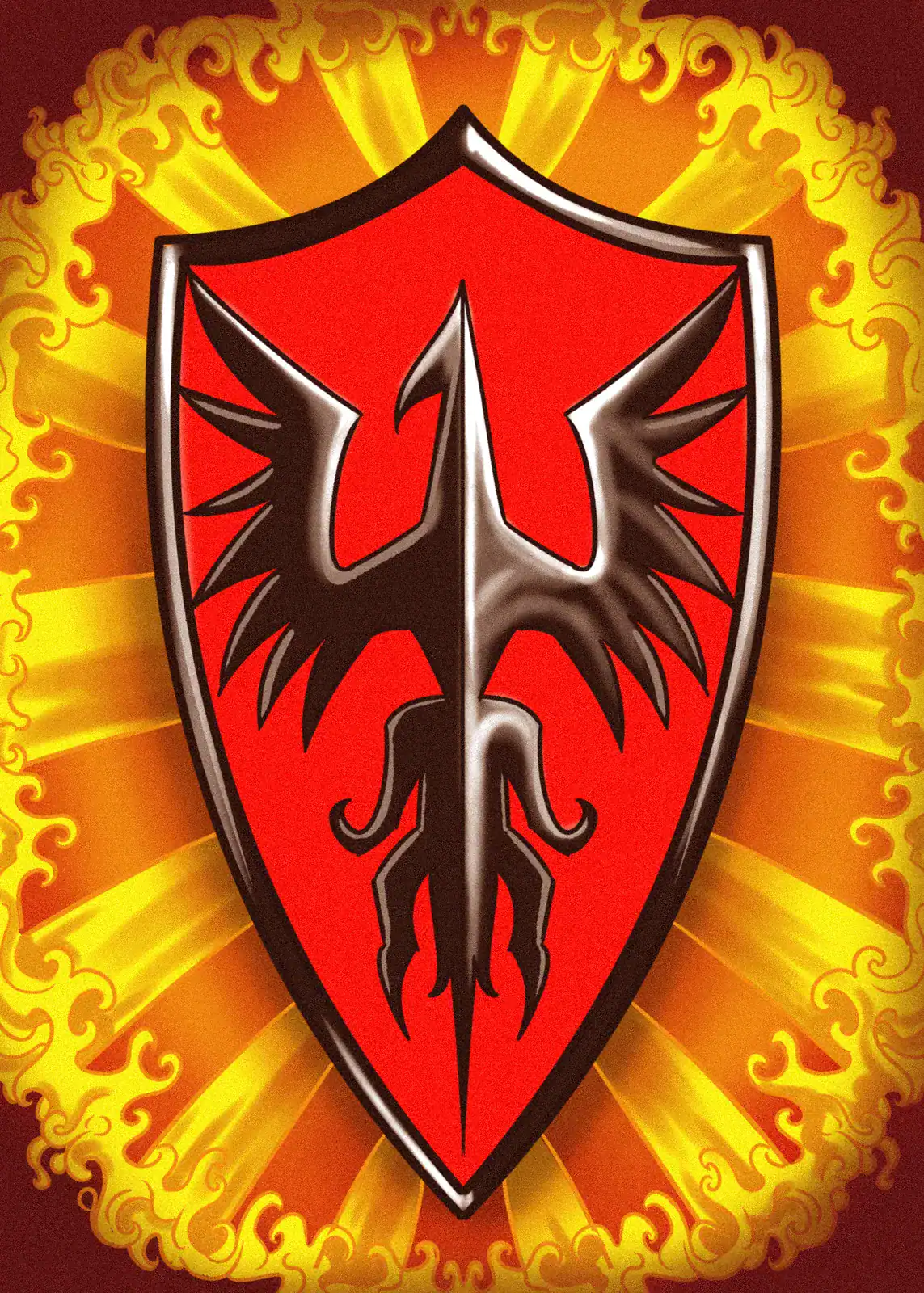 Also, swirling filigree patterns frame the composition in ornate circular borders. The background transitions from deep red edges to golden yellow center. Meanwhile, the phoenix’s body forms a dramatic downward point with curved tail elements.