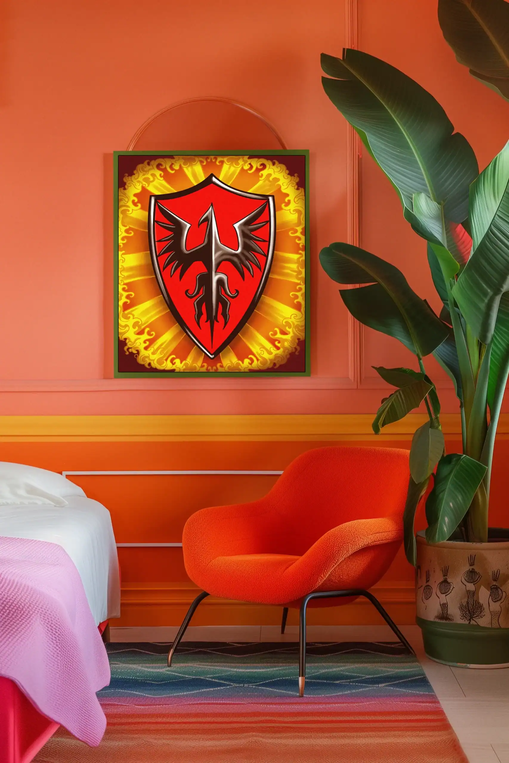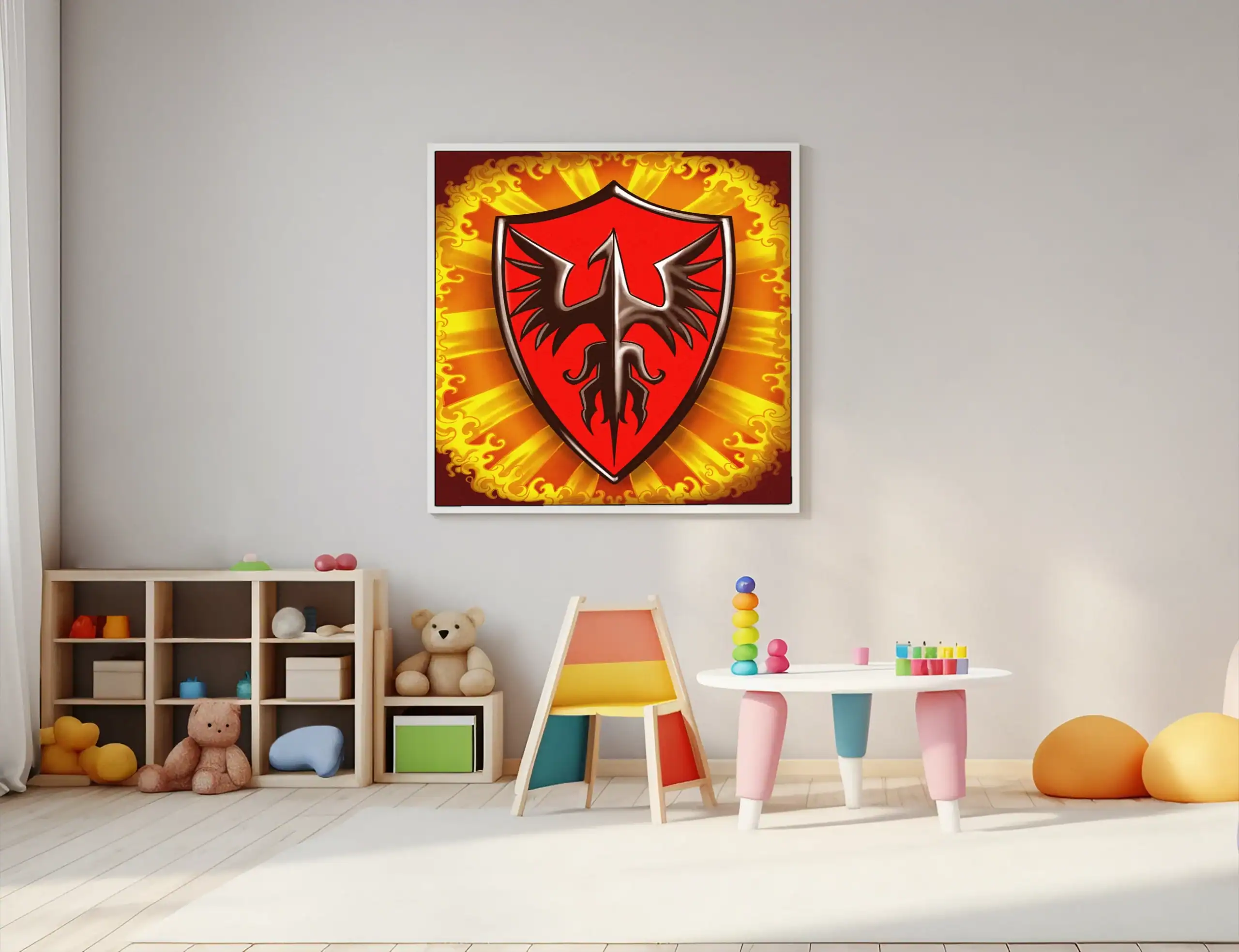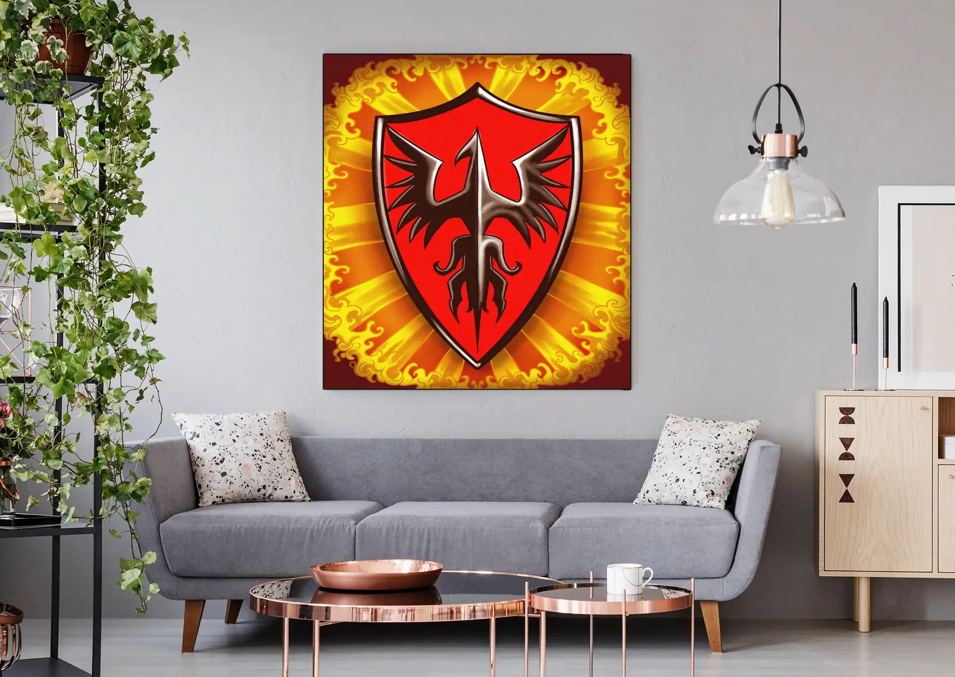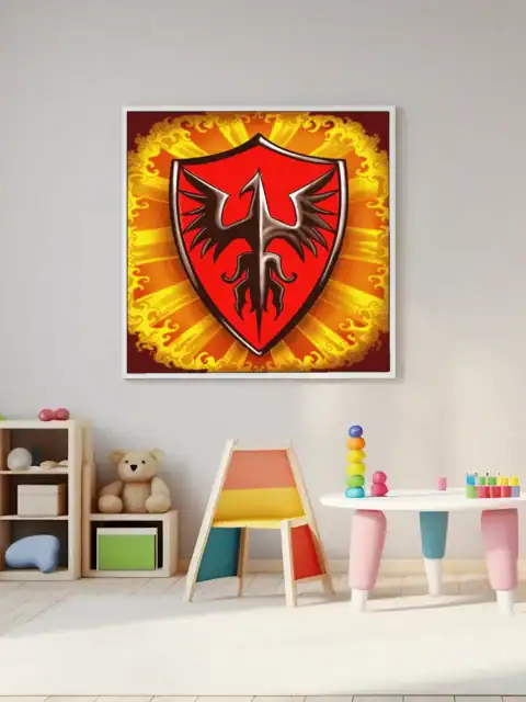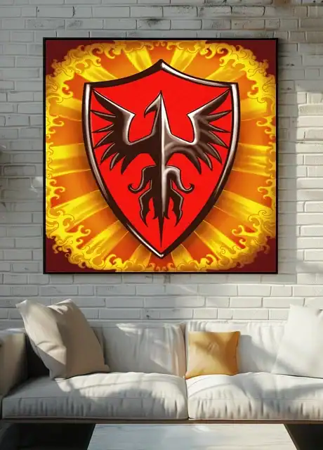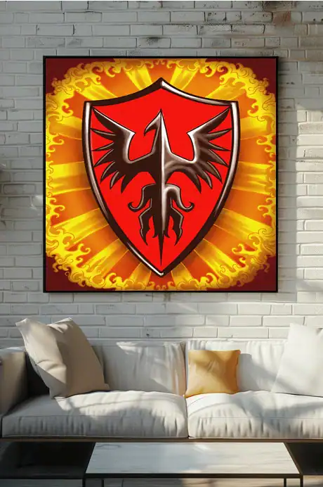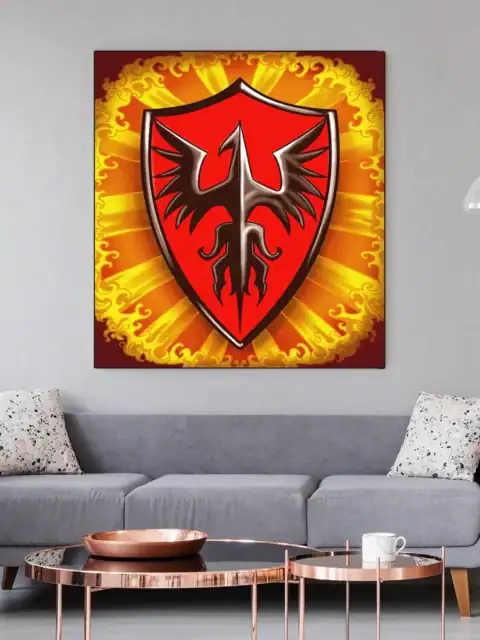 Game rooms gain focus when this heraldic artwork sits beside a campaign journal or reference binder. Moreover, the phoenix emblem reinforces the fantasy atmosphere during extended play sessions.