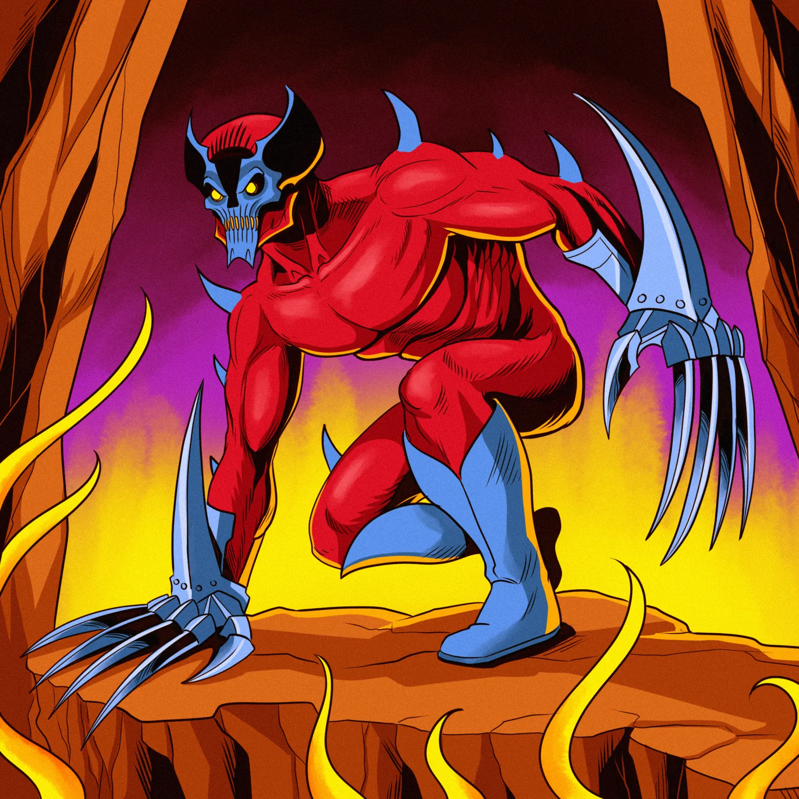 A crimson-skinned demon stands armed with massive silver claw gauntlets. This carus demon art trading card art canvas print captures Fabricio Vainer’s bold cel-shaded illustration. The skeletal blue-grey face features glowing yellow eyes, notably framed by black horns.