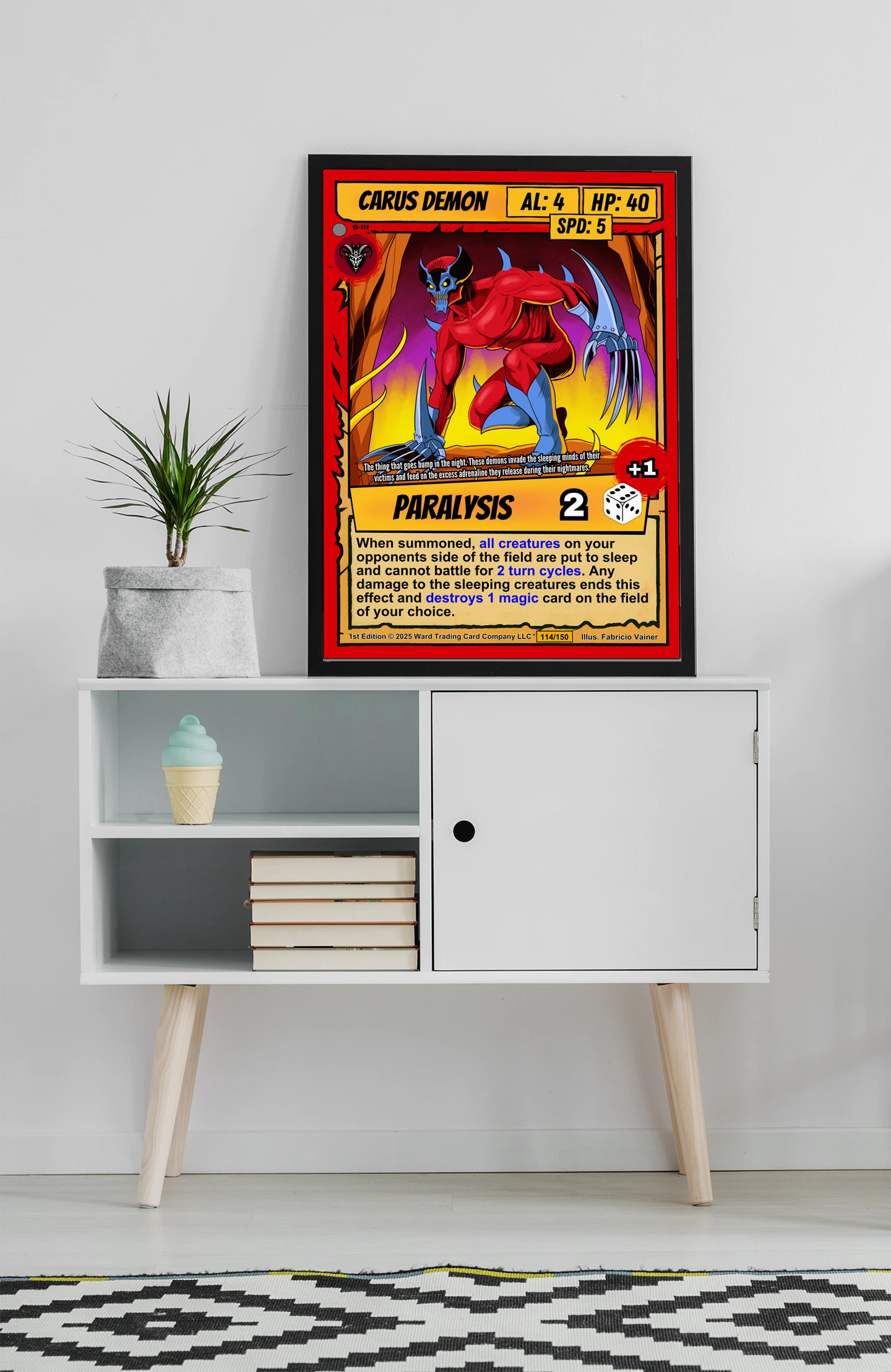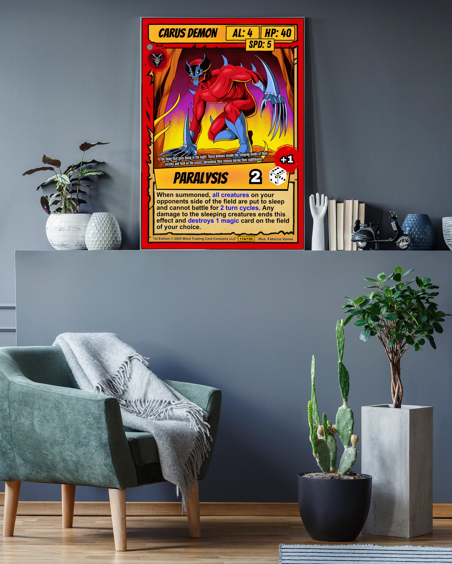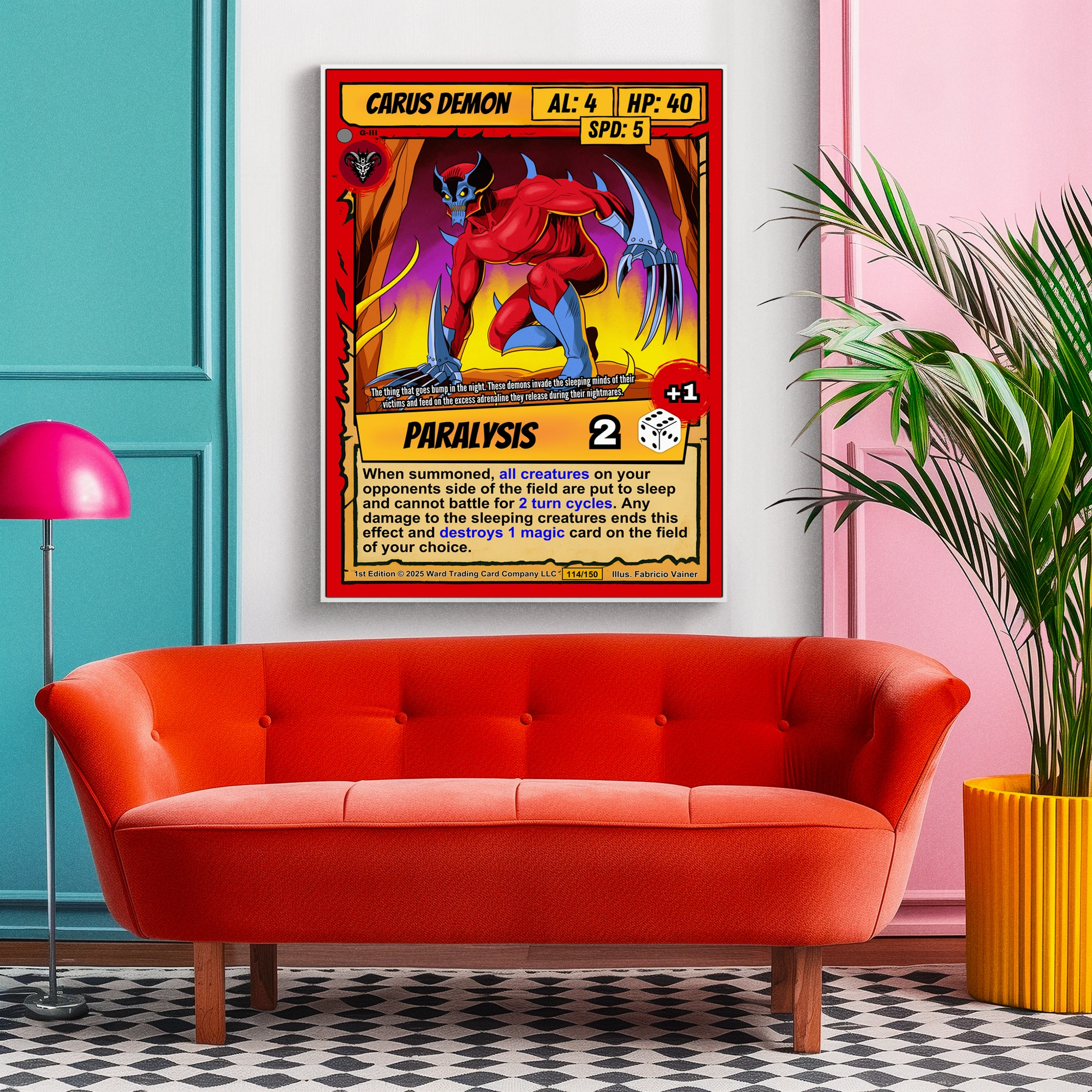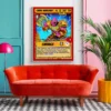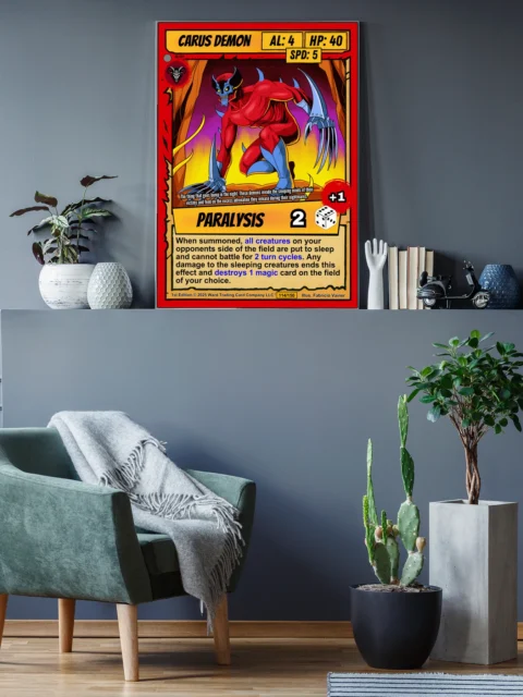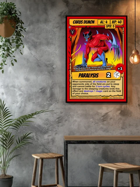 At room scale, the saturated reds and yellows create immediate visual impact. Comic book collectors and TCG players recognize the cel-shaded illustration style instantly. This carus demon trading card canvas print delivers authentic card artwork without reflective surface glare.