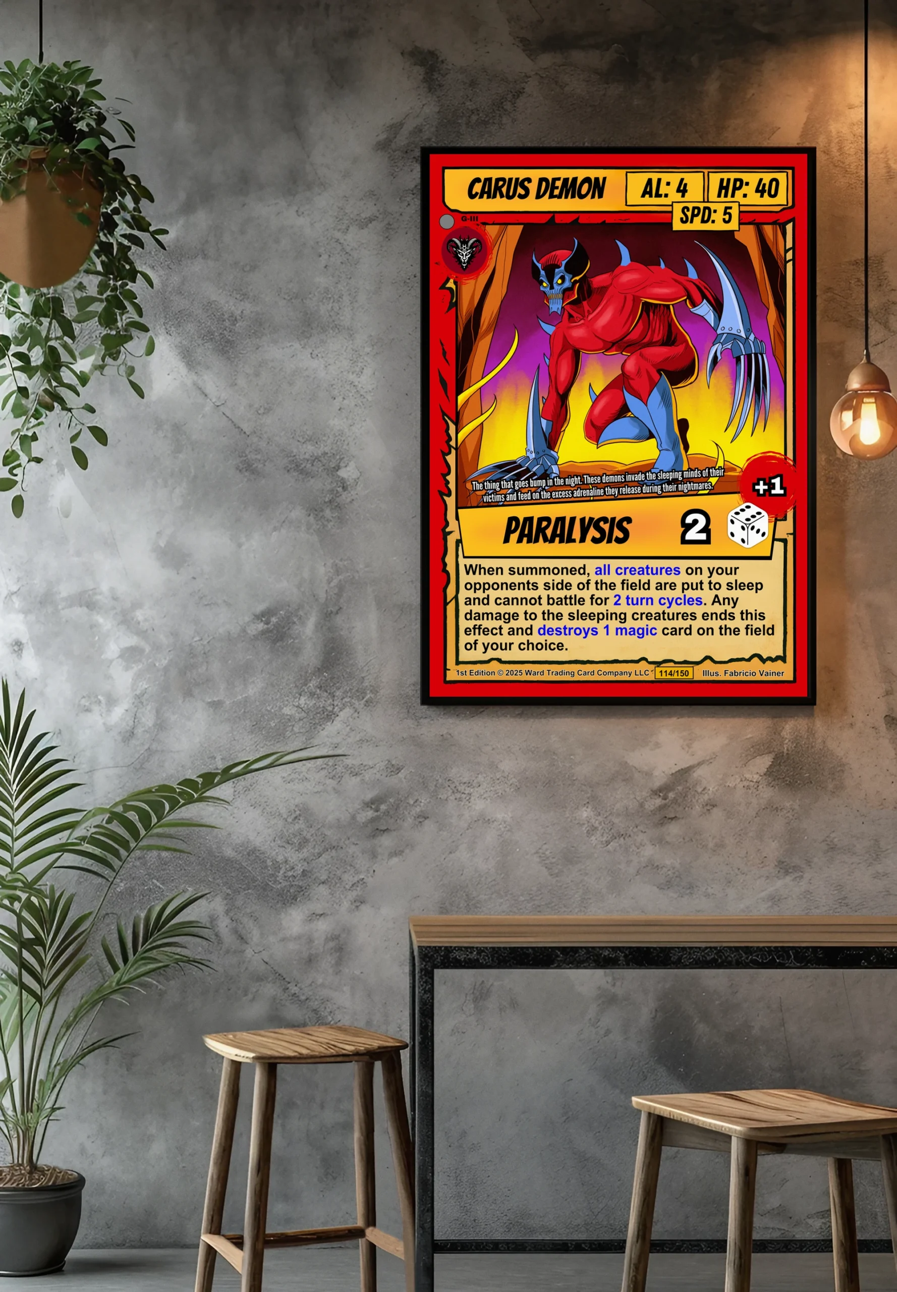 Works best in game rooms where the fiery background complements darker walls. Alternatively, position it above card storage displays for thematic continuity.