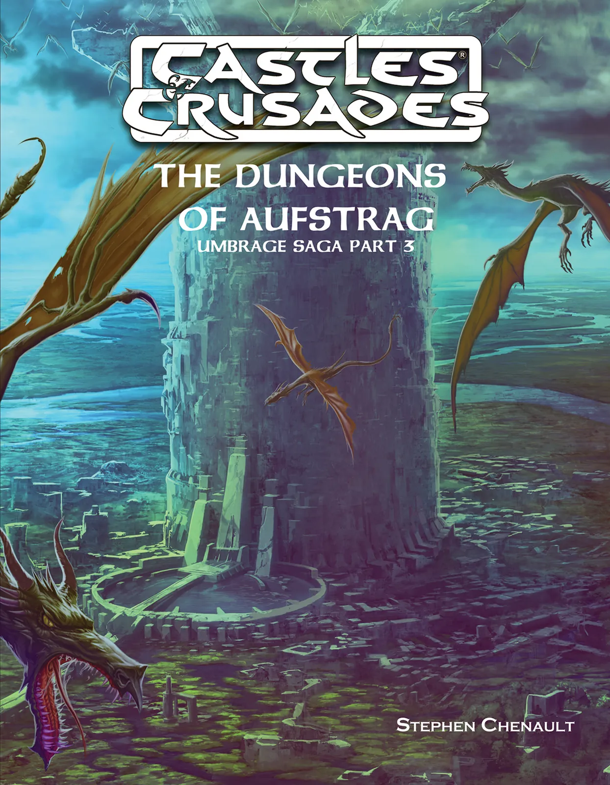Castles & Crusades Aufstrag Cover Art showcases a monumental fantasy tower rising from a shattered landscape while dragons circle overhead. The presence of the official title design and typography firmly establishes this piece as a published cover, reinforcing its role as an iconic visual from the Castles & Crusades line. As a result, the artwork immediately conveys epic scale and narrative weight.