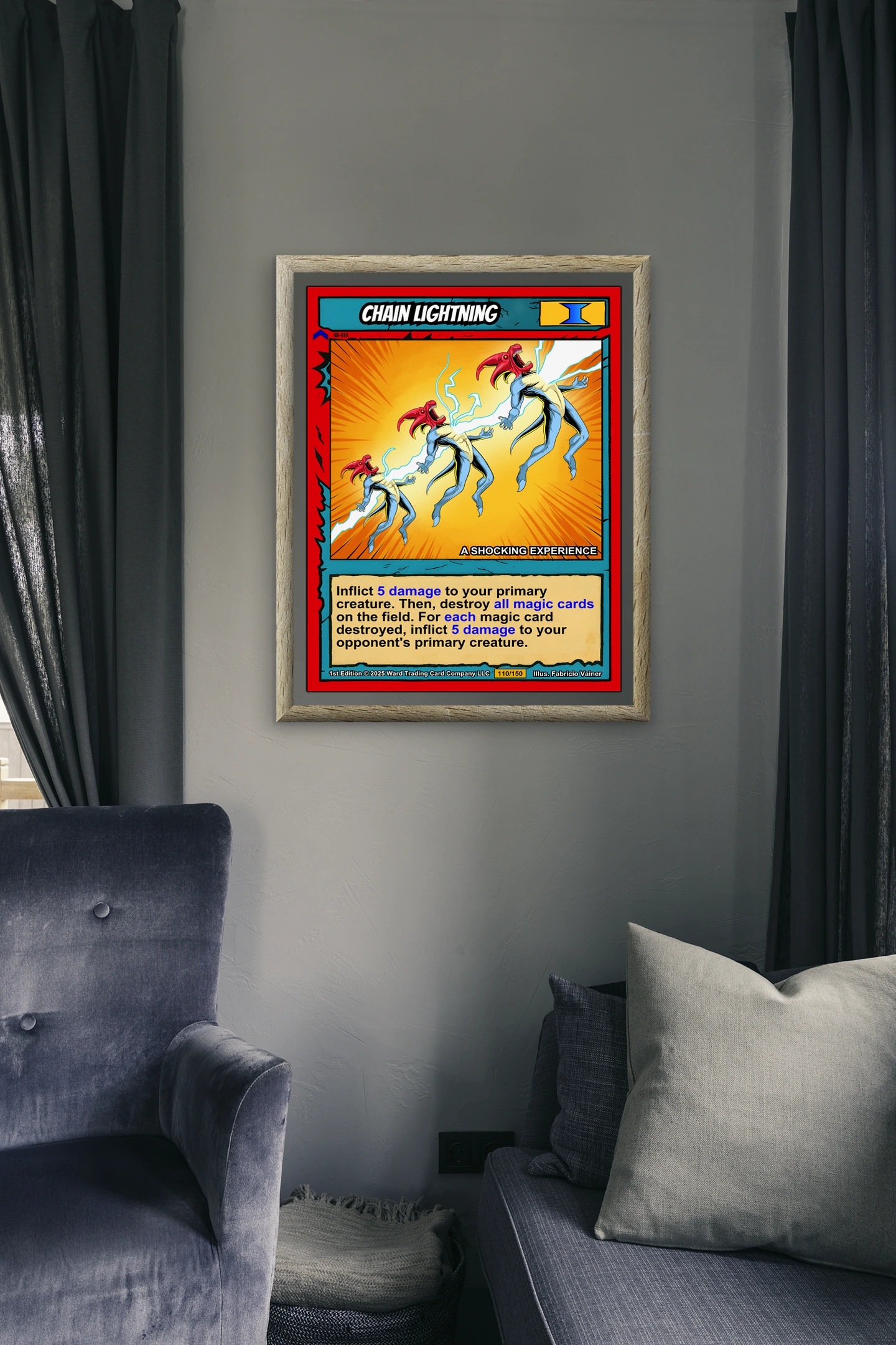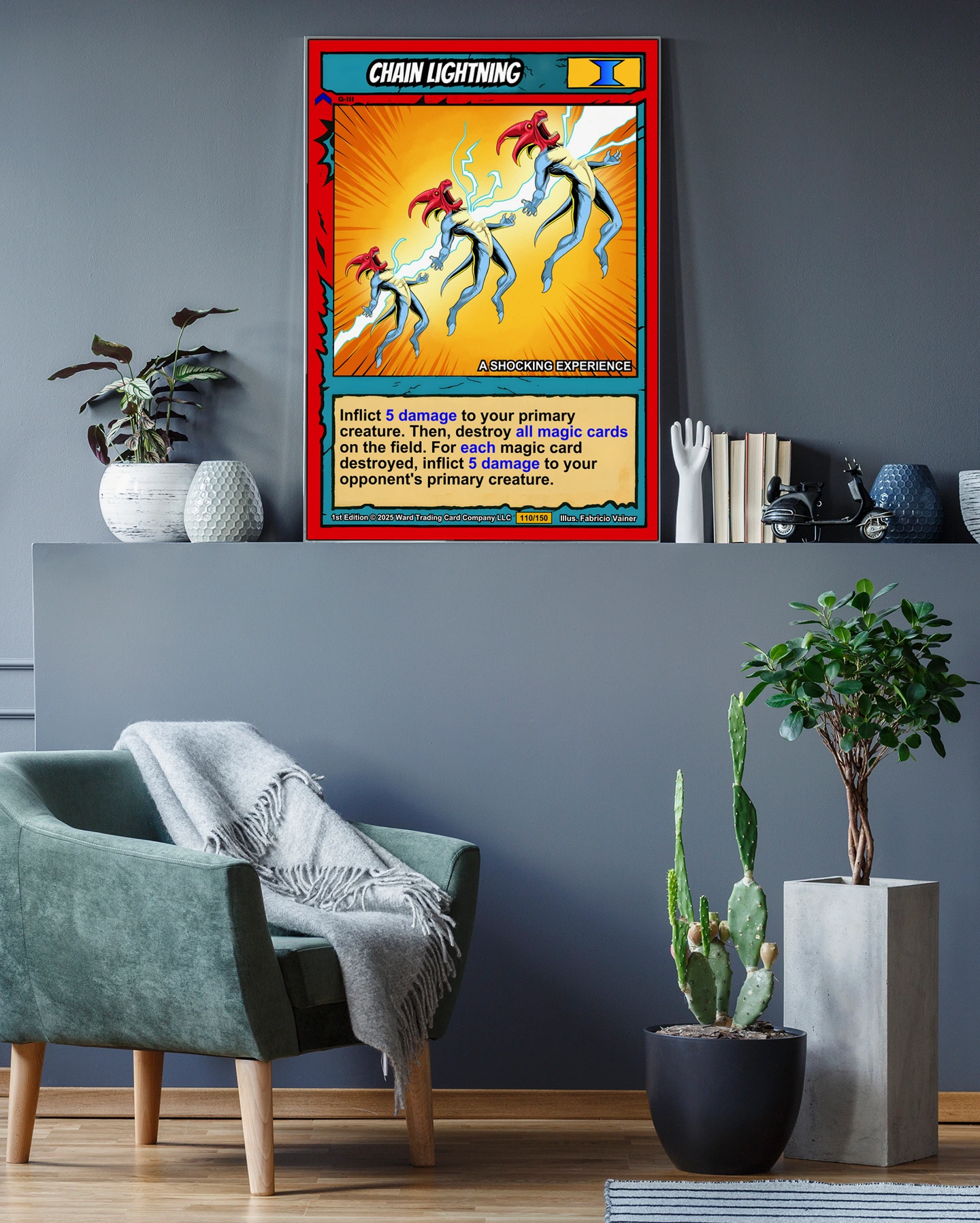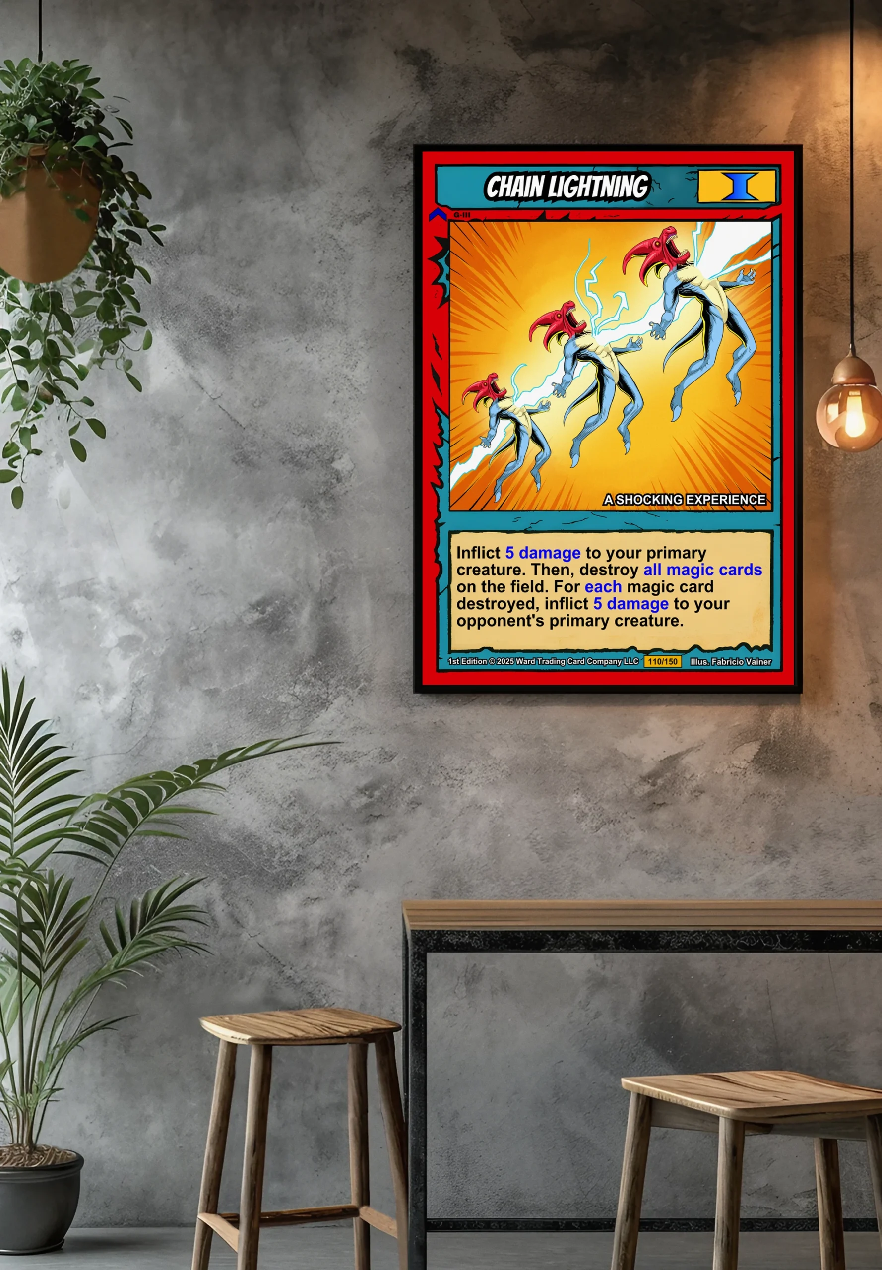 At room scale, the explosive energy composition and high-contrast color blocking create immediate visual impact. Ward TCG collectors recognize this as a signature offensive card from the lightning archetype. The chain lightning trading card canvas print preserves every design element from border to card number.