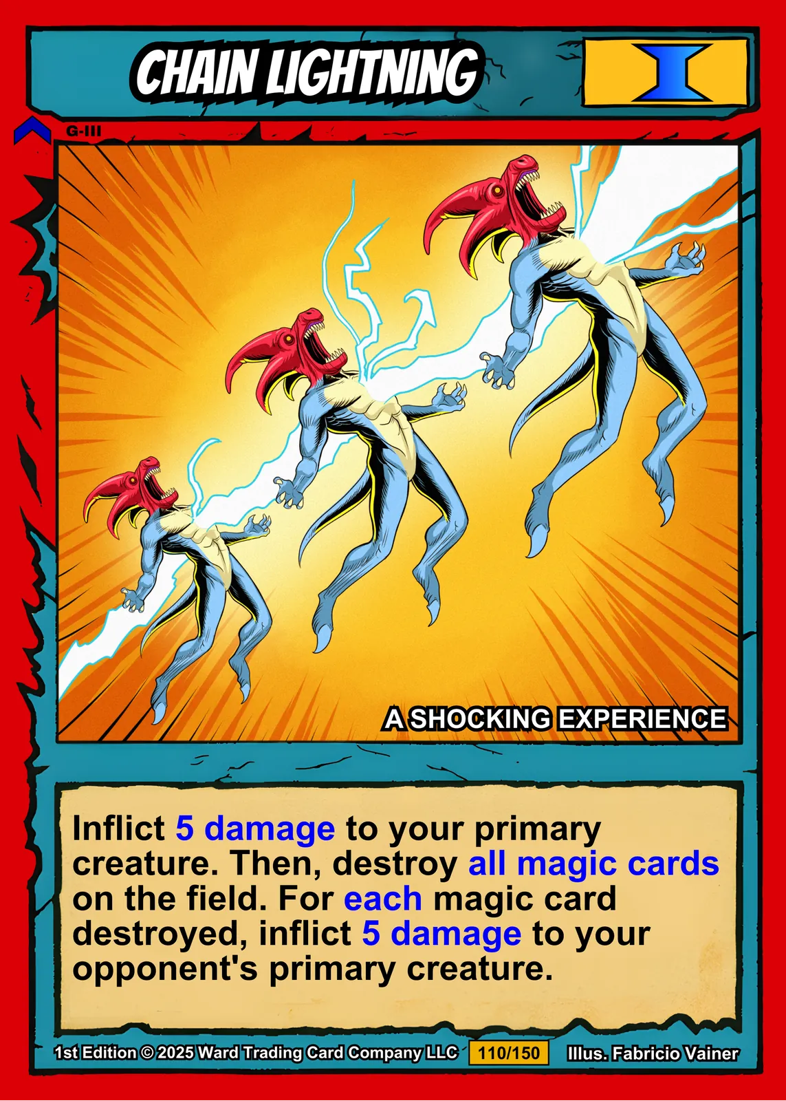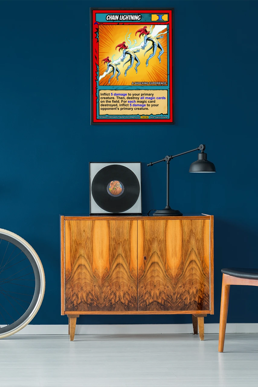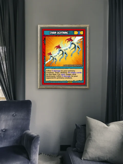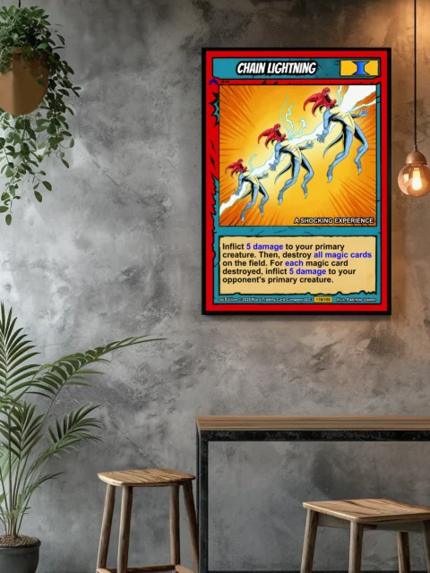 At room scale, the explosive energy composition and high-contrast color blocking create immediate visual impact. Ward TCG collectors recognize this as a signature offensive card from the lightning archetype. The chain lightning trading card canvas print preserves every design element from border to card number.
