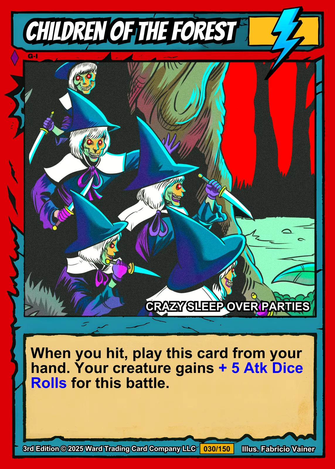 The cream text box preserves the original game rules and ‘CRAZY SLEEP OVER PARTIES’ subtitle. Collectors recognize the comic book linework and flat color palette immediately. This children of the forest trading card canvas print appeals specifically to Ward TCG enthusiasts who value macabre humor.