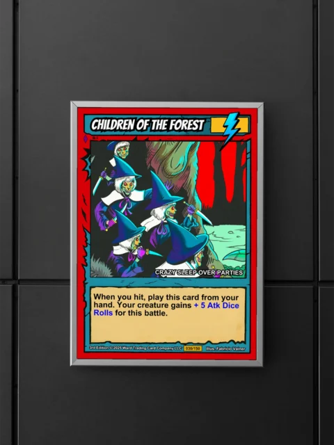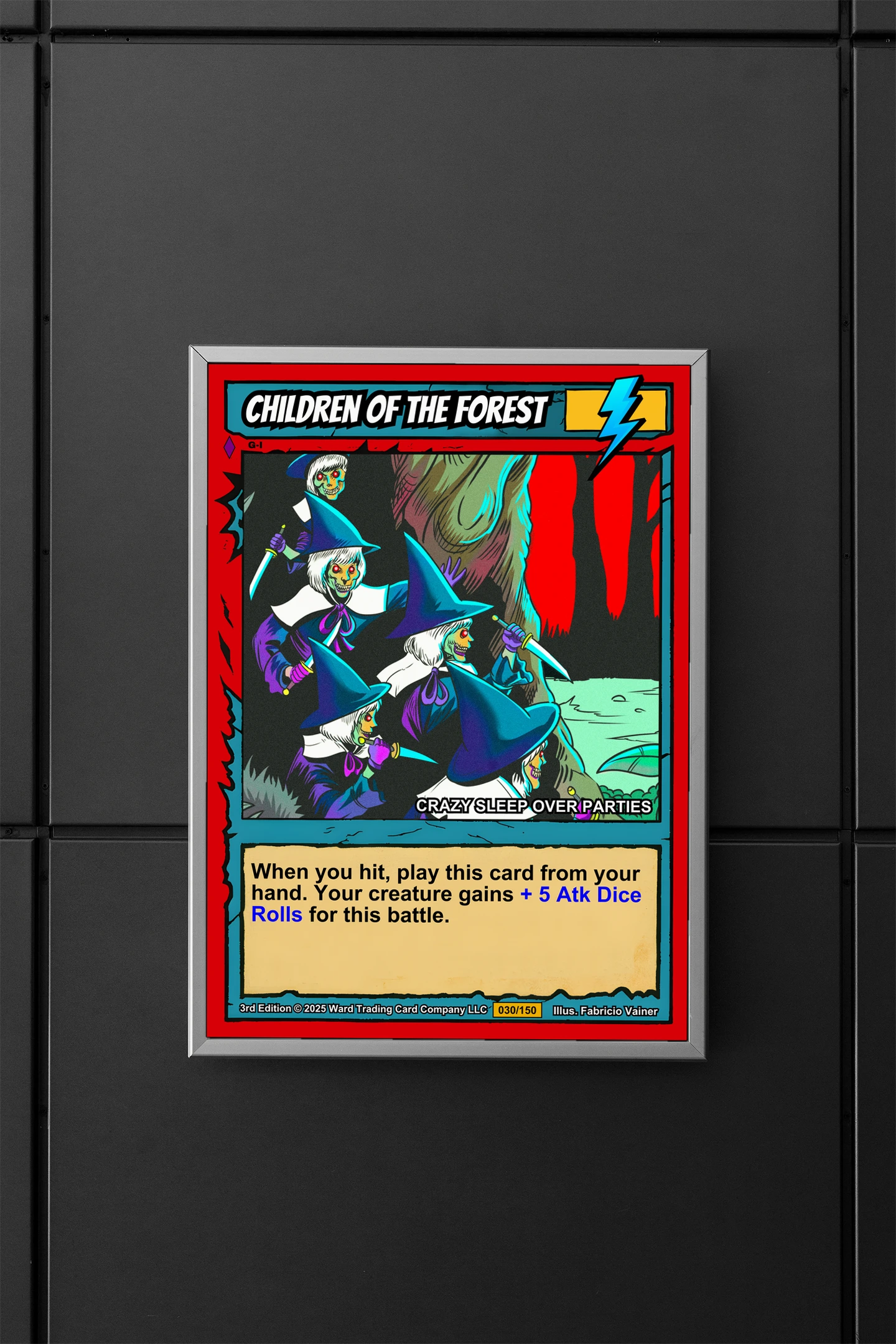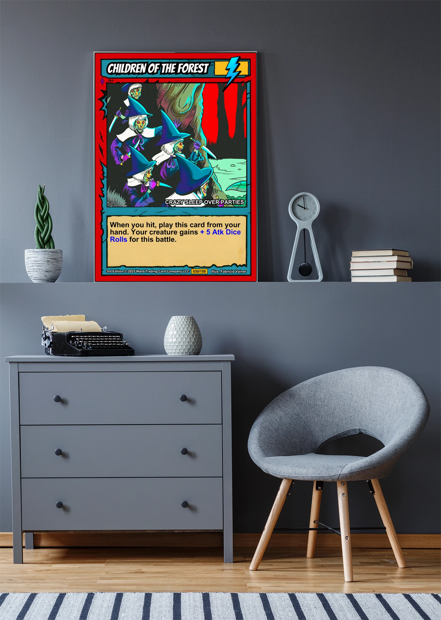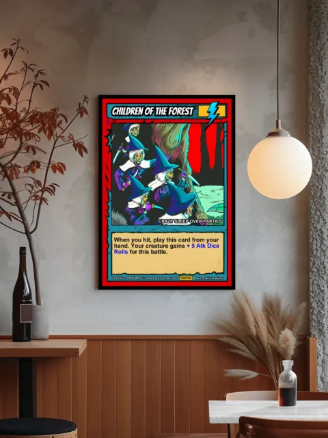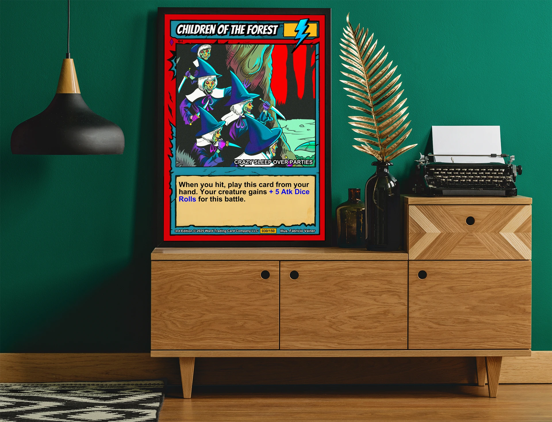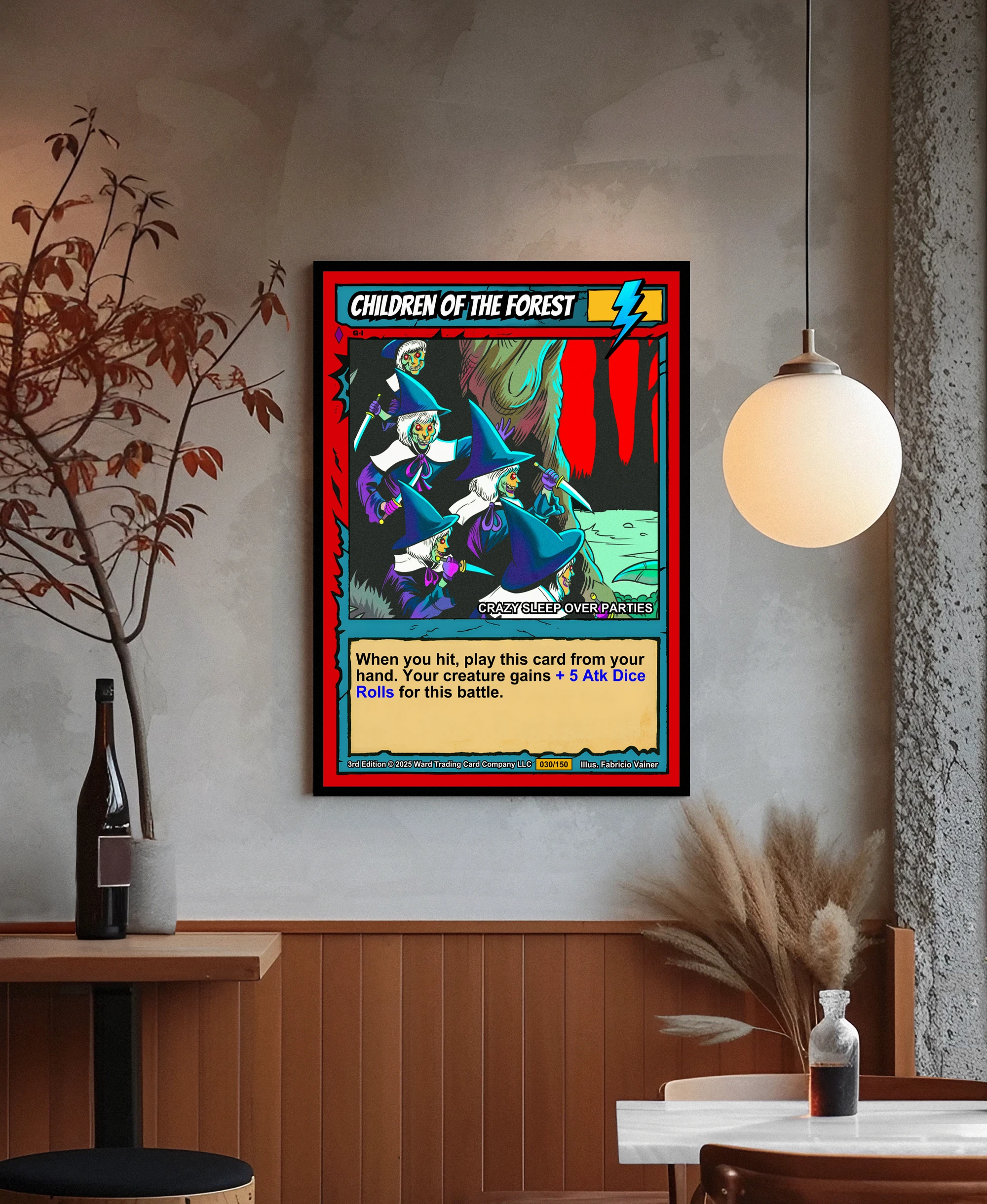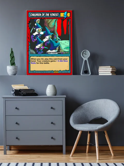 Dungeon masters appreciate Ward TCG’s whimsical take on undead forest dwellers. Fantasy collectors value Vainer’s bold cel-shaded character work and nostalgic comic styling. This children of the forest trading card canvas print particularly appeals to retro gaming enthusiasts.