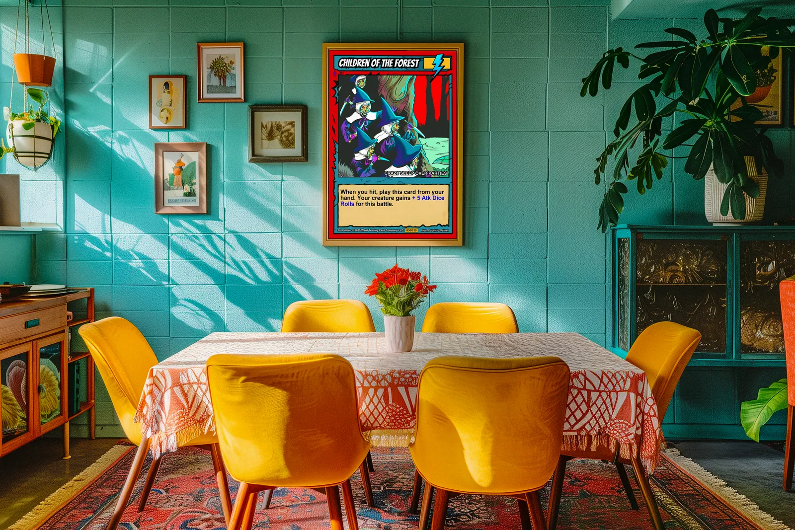 This piece works in game rooms where horror aesthetics meet trading card nostalgia. The bold red border commands attention on darker walls, particularly near display shelves.