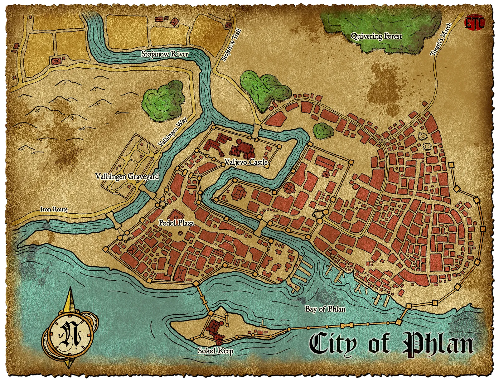 Red-roofed buildings cluster along waterways that divide Phlan into medieval districts. This city of phlan fantasy battle map canvas print shows the Stojanow River splitting through the settlement. Aged brown staining spreads across the parchment surface, notably along the eastern edge.