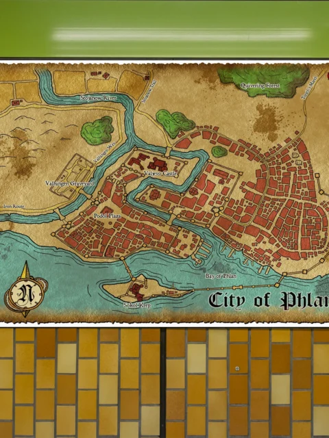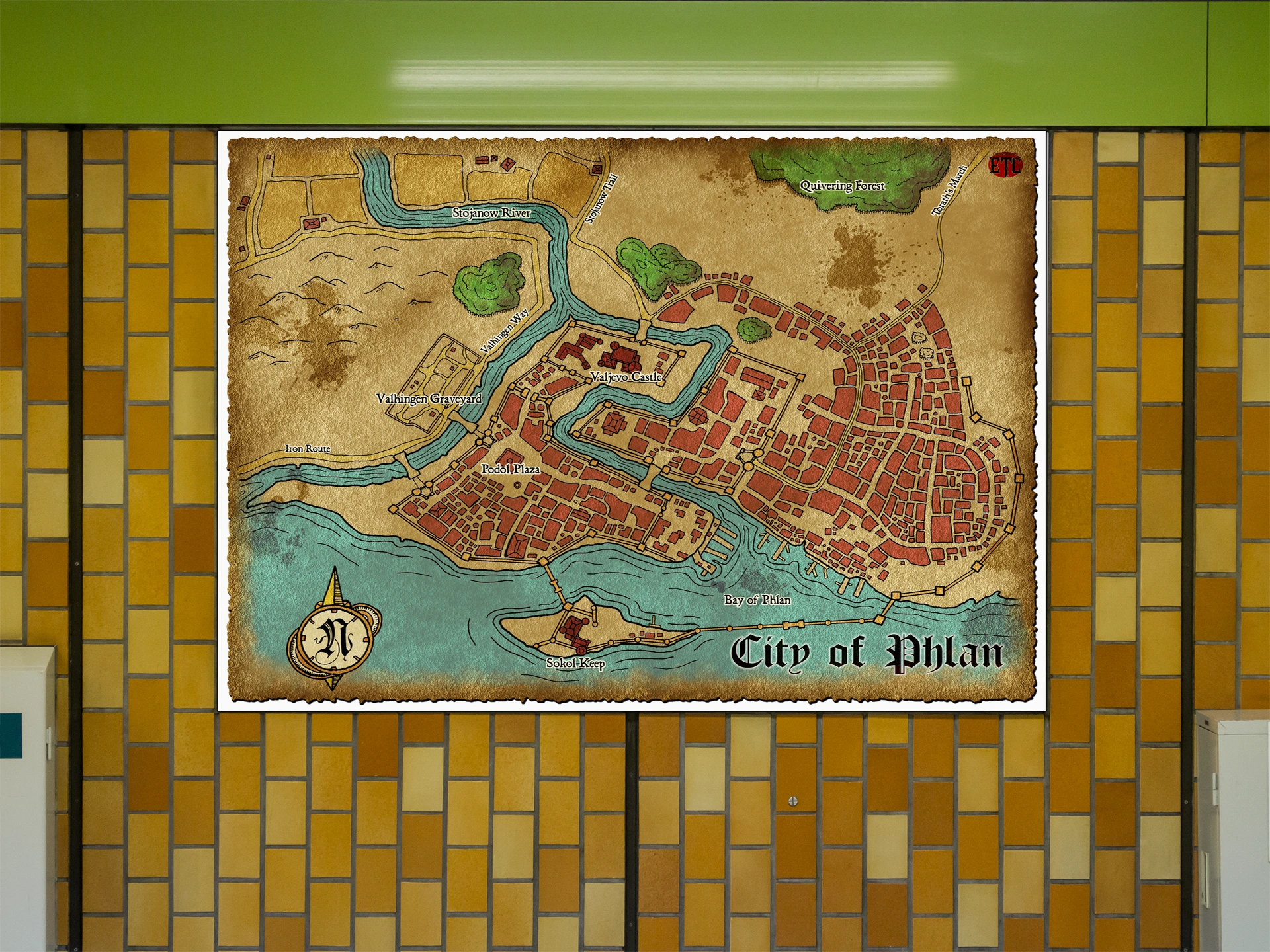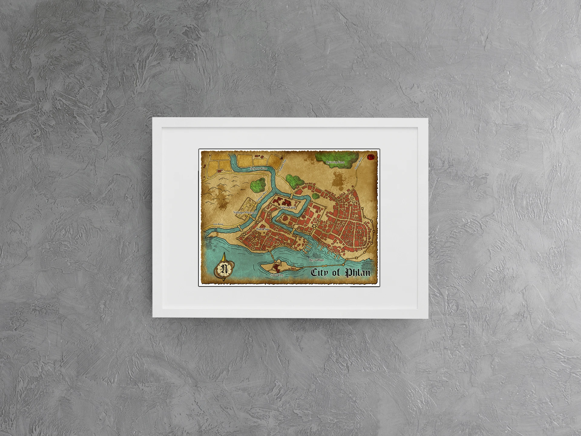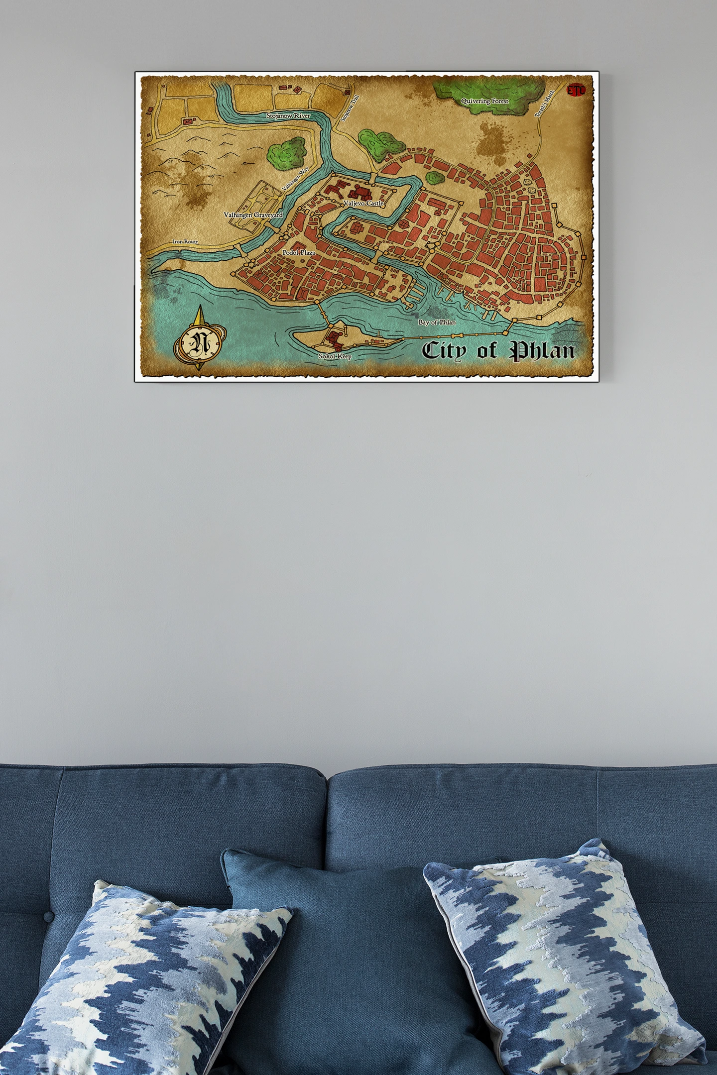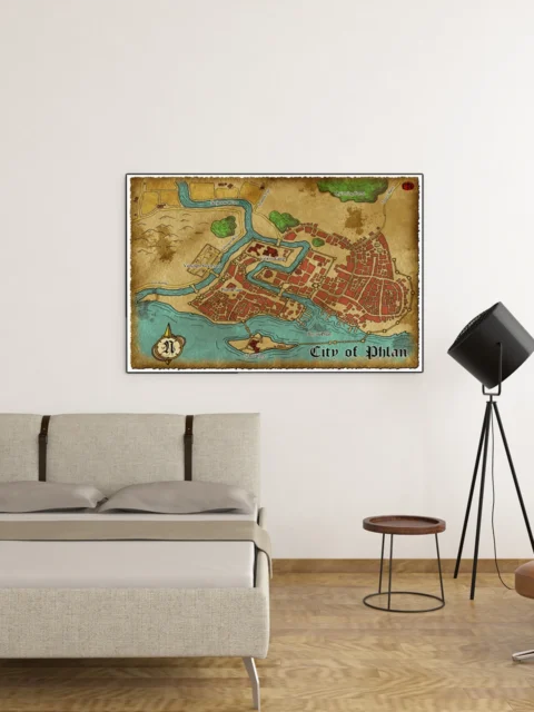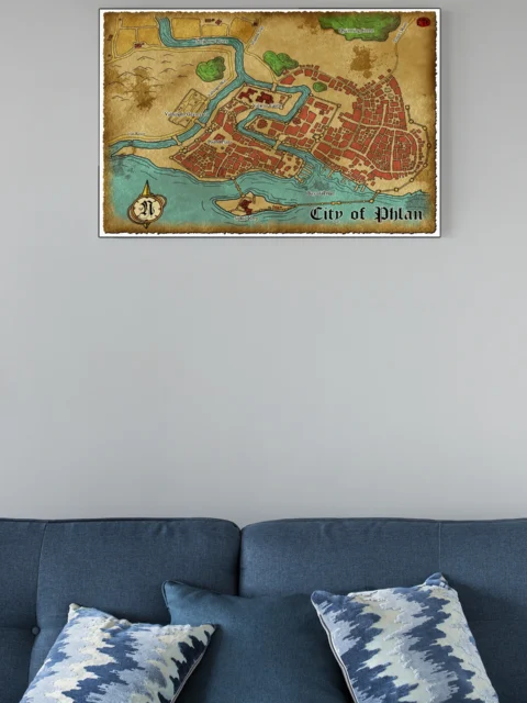 Phlan’s district layout gives dungeon masters immediate spatial awareness for urban encounters. Players who run Forgotten Realms campaigns recognize these labeled landmarks as campaign anchors. This city of phlan fantasy battle map canvas print works particularly well for DMs planning faction intrigue.