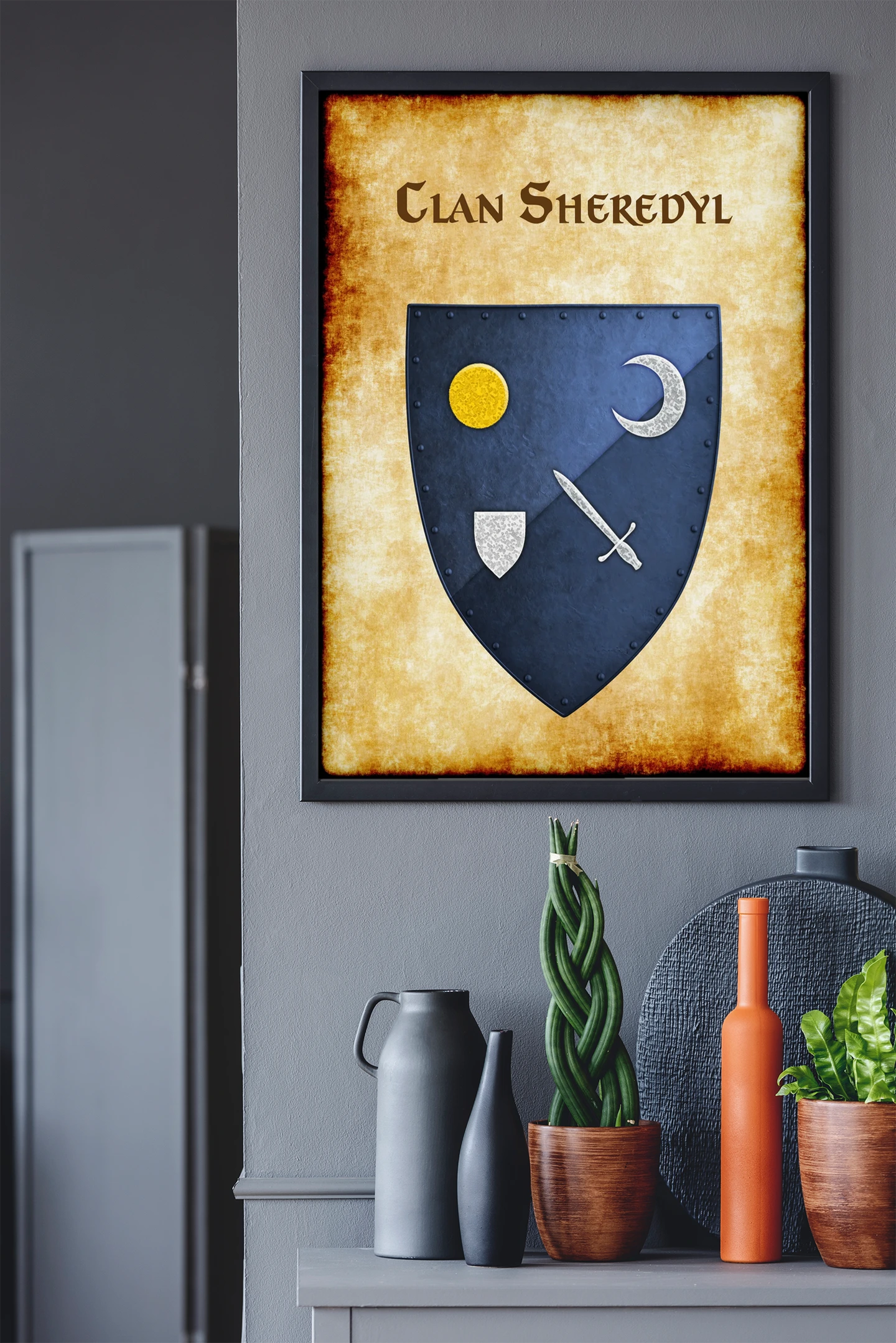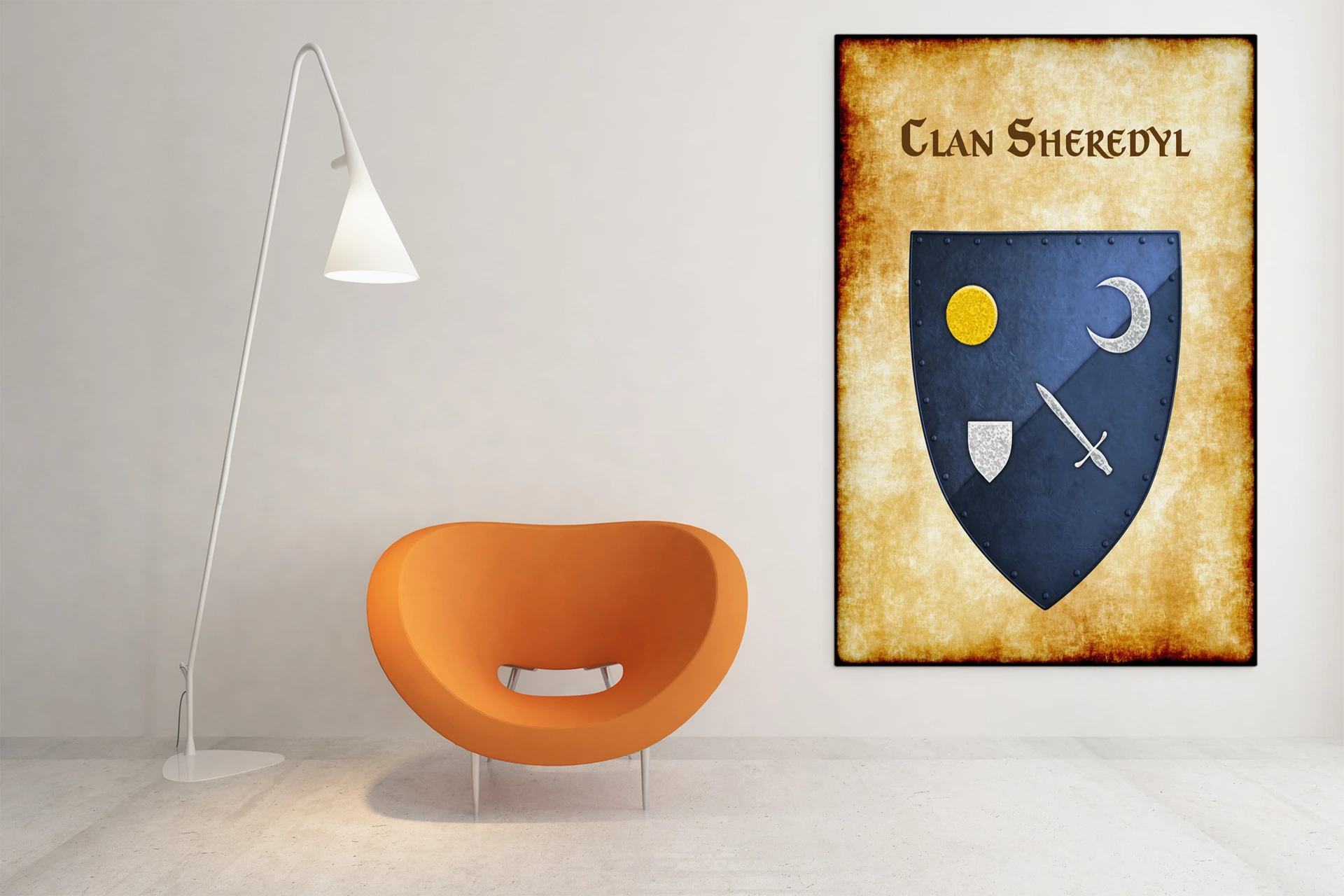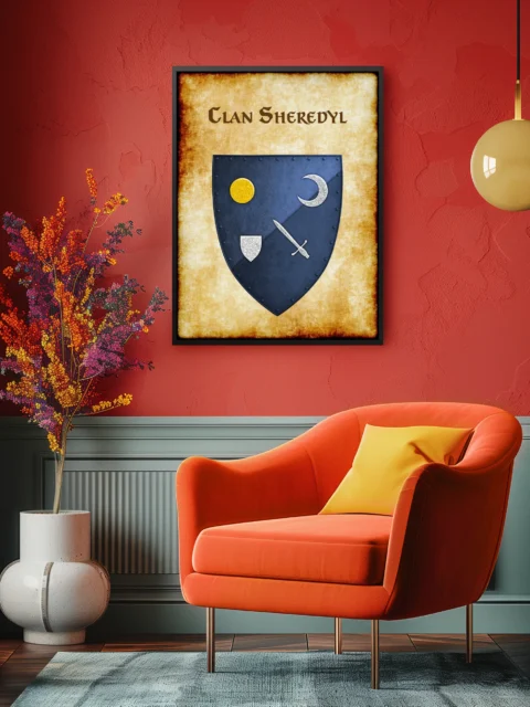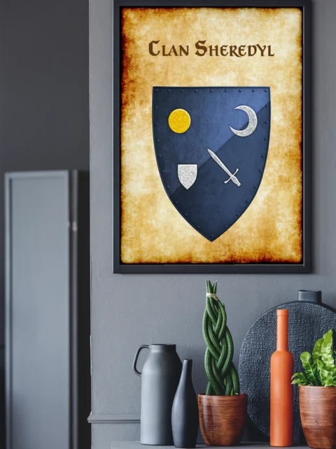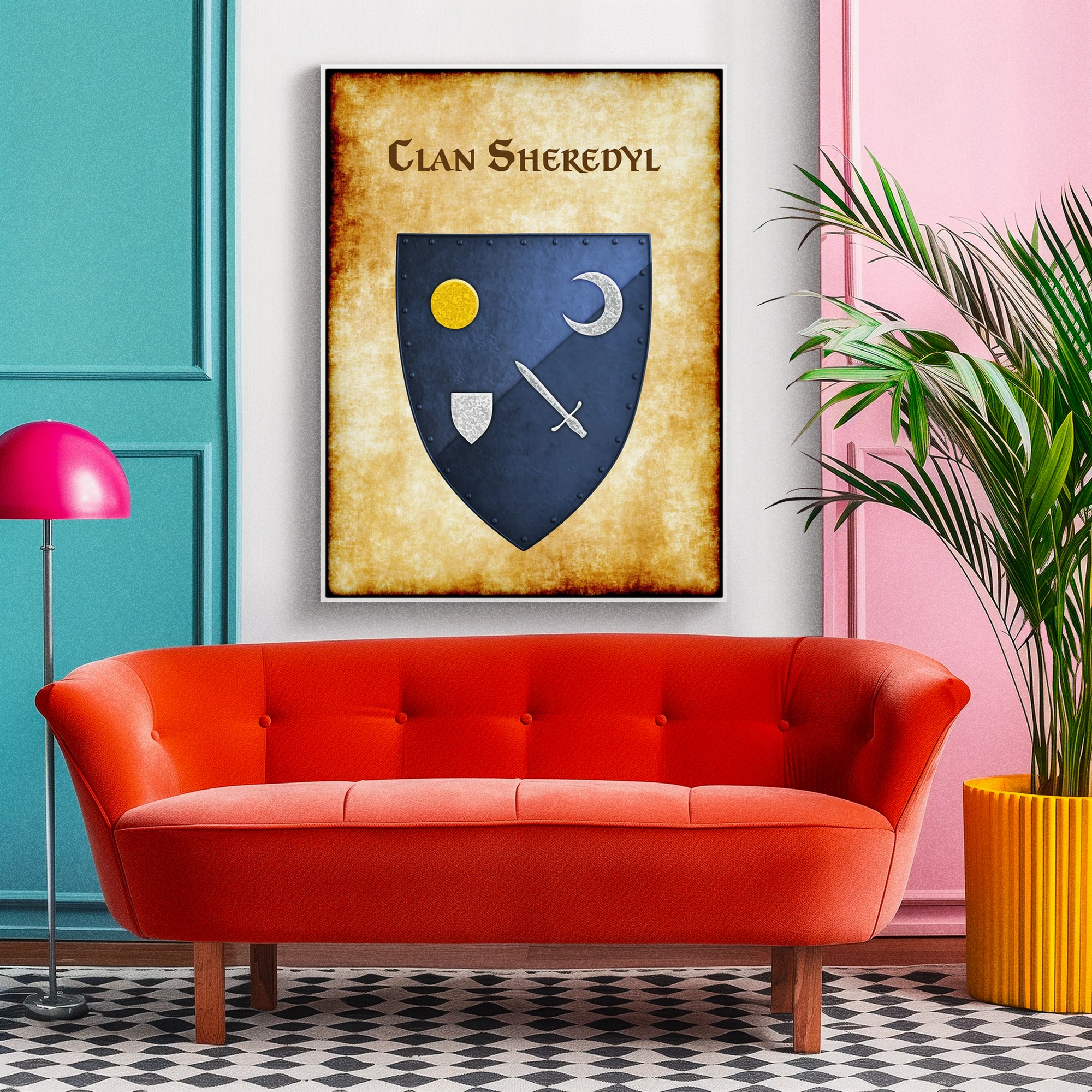 Sun and moon symbolism suggests celestial authority beyond typical heraldic devices. Greyhawk collectors appreciate authentic faction heraldry for their campaign libraries. This clan sheredyl Greyhawk heraldry canvas print particularly honors the setting’s noble traditions.