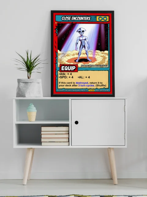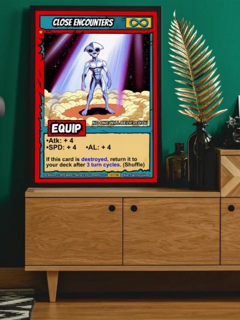 The comic book illustration style and dramatic spotlight read clearly from across the room. Collectors of sci-fi trading card art and retro UFO imagery recognize the campy ominous tone immediately. This close encounters trading card canvas print appeals to Ward TCG players and vintage alien encounter fans alike.