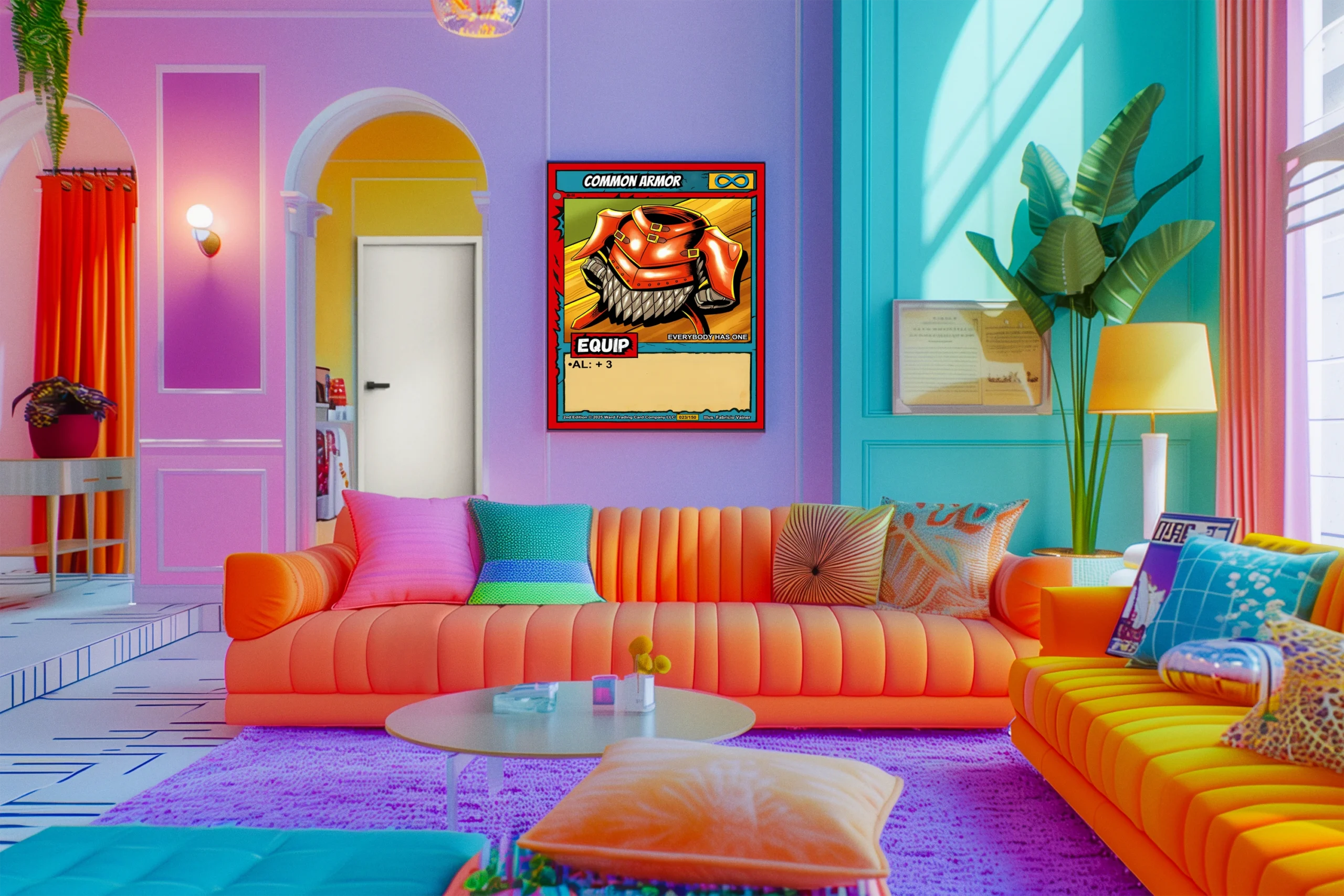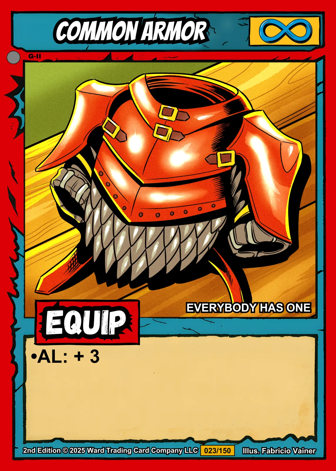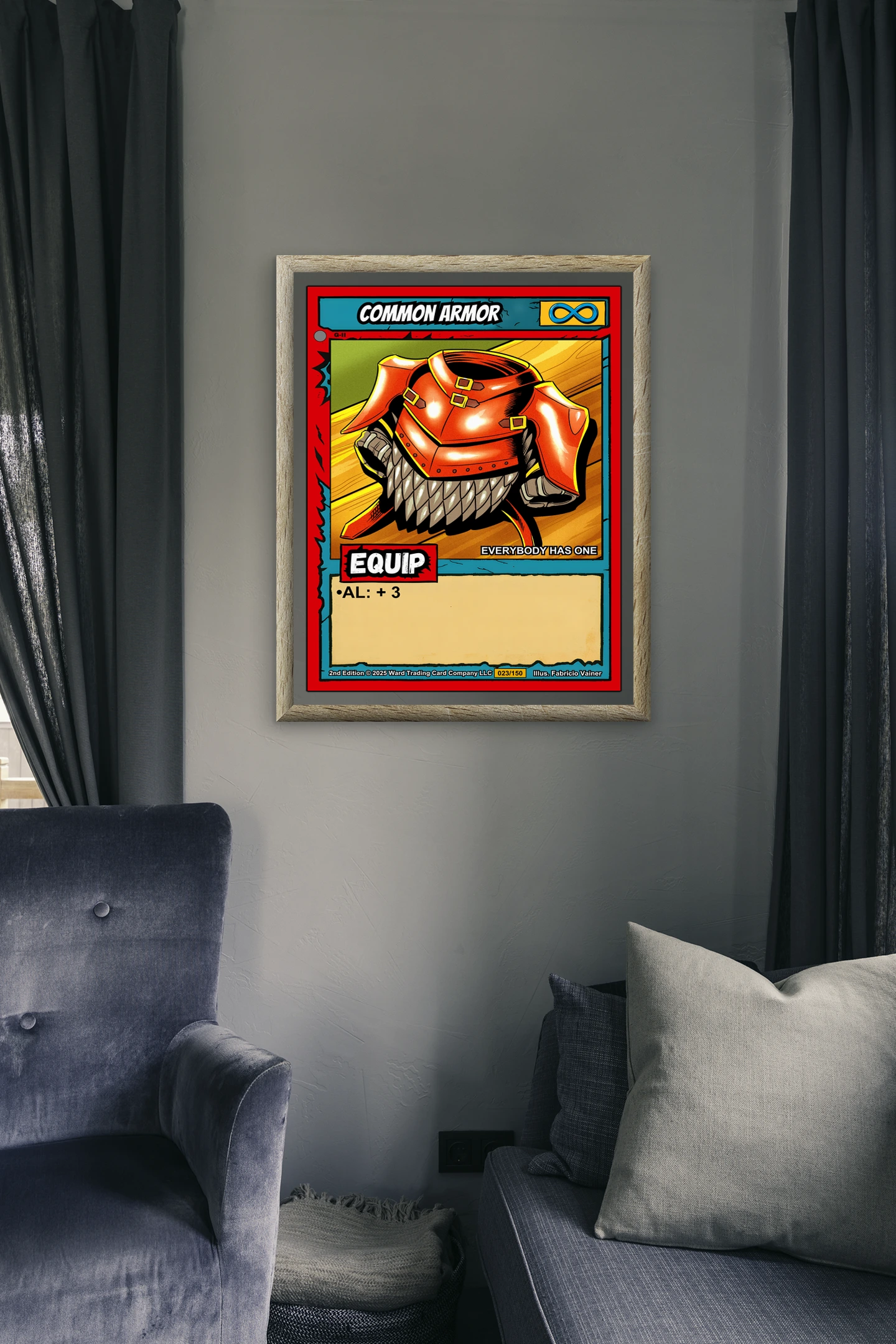 At room scale, the cel-shaded armor pops with high saturation and thick black outlines. Ward collectors recognize the 023/150 card number and Fabricio Vainer credit line immediately. This common armor trading card canvas print delivers nostalgic game energy for tabletop enthusiasts and TCG fans.