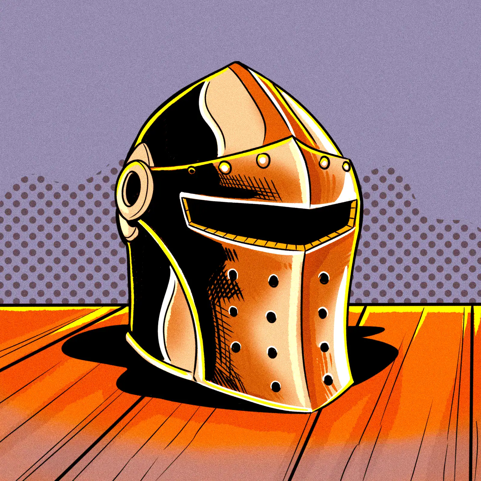 Notably, orange wooden planks beneath suggest medieval armory floors. Cross-hatching adds depth while radiating lines imply energy or dramatic lighting. The stark black shadow grounds the helmet in comic book reality.