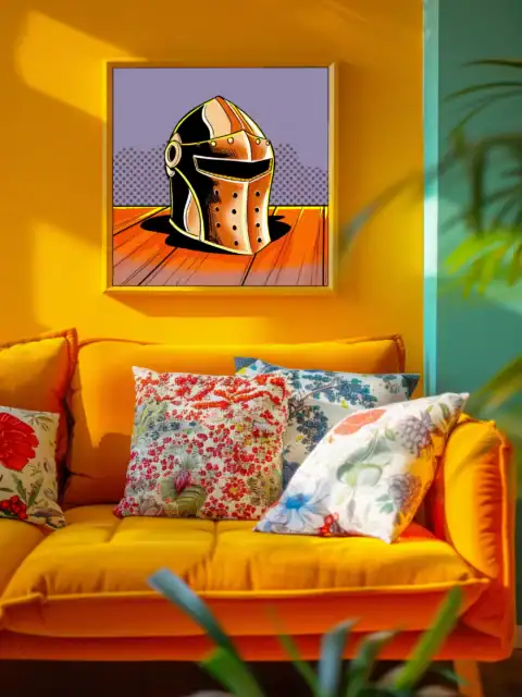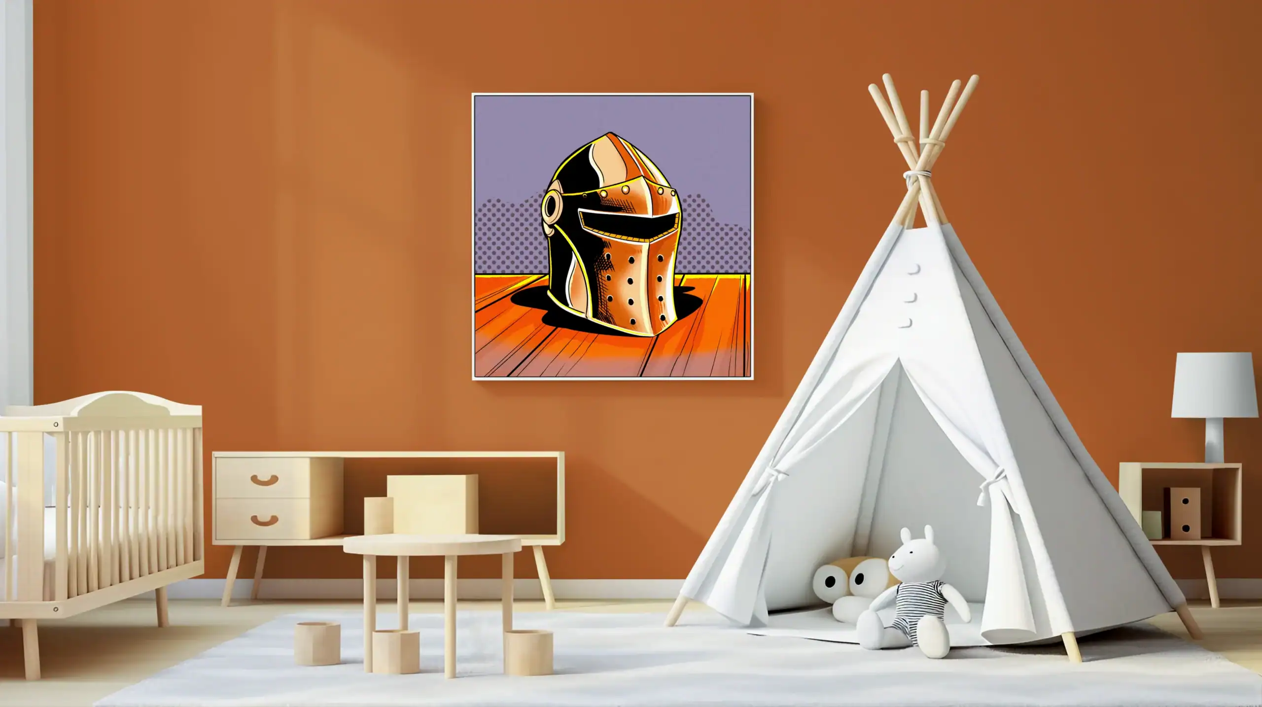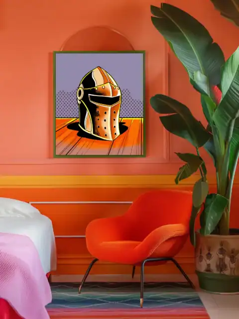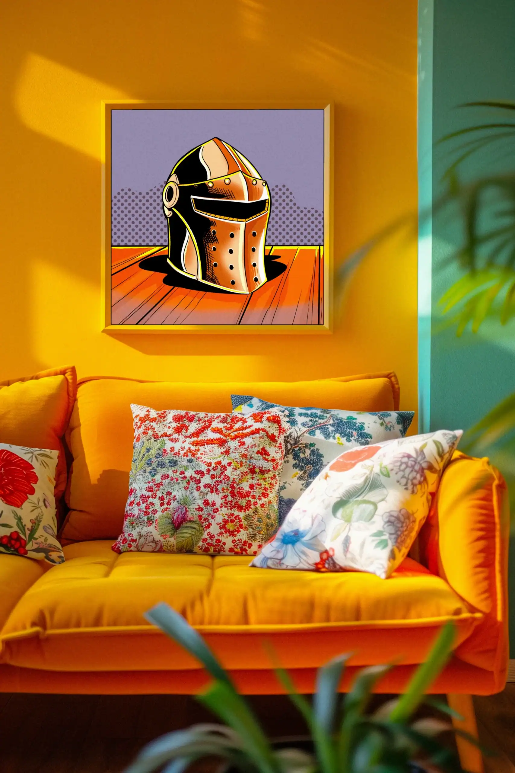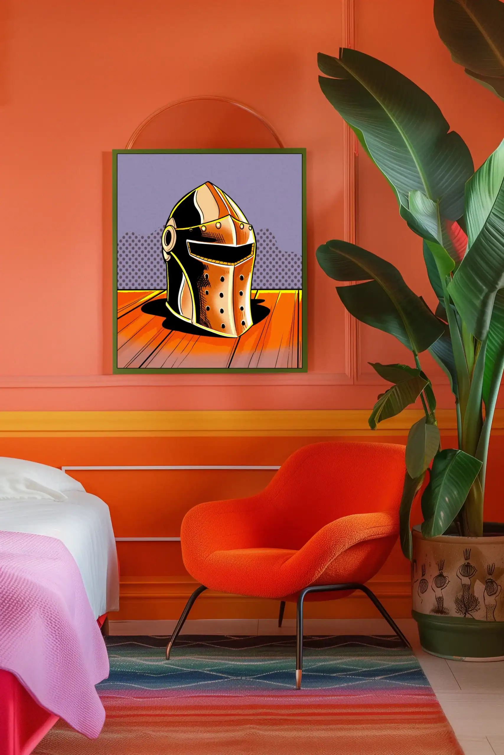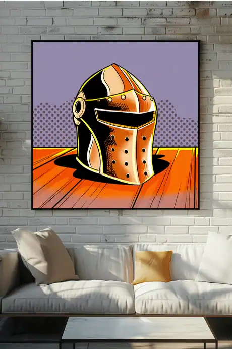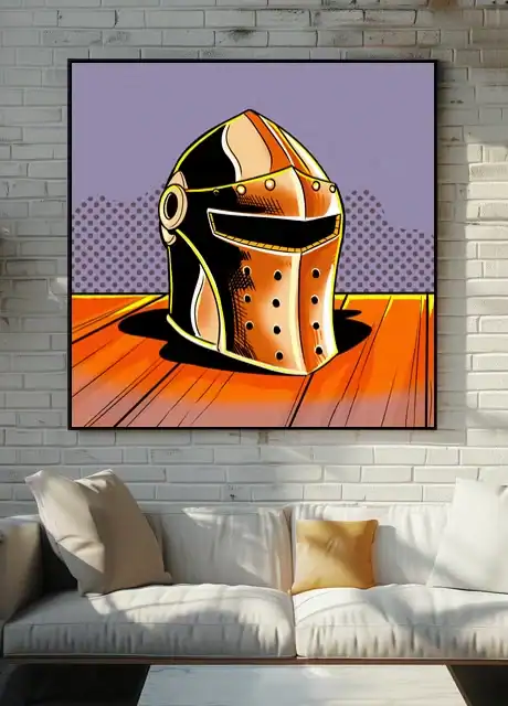 A copper-orange great helm dominates against bold purple with halftone dots. This common helmet art trading card canvas print captures Fabricio Vainer’s retro comic styling. White highlights create metallic sheen across the riveted faceplate.