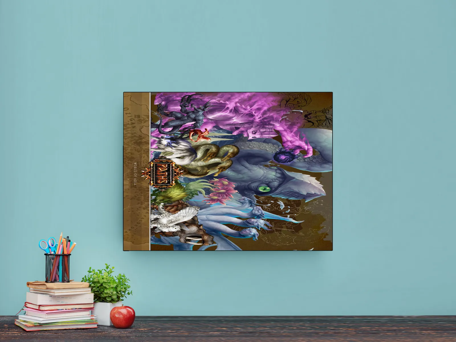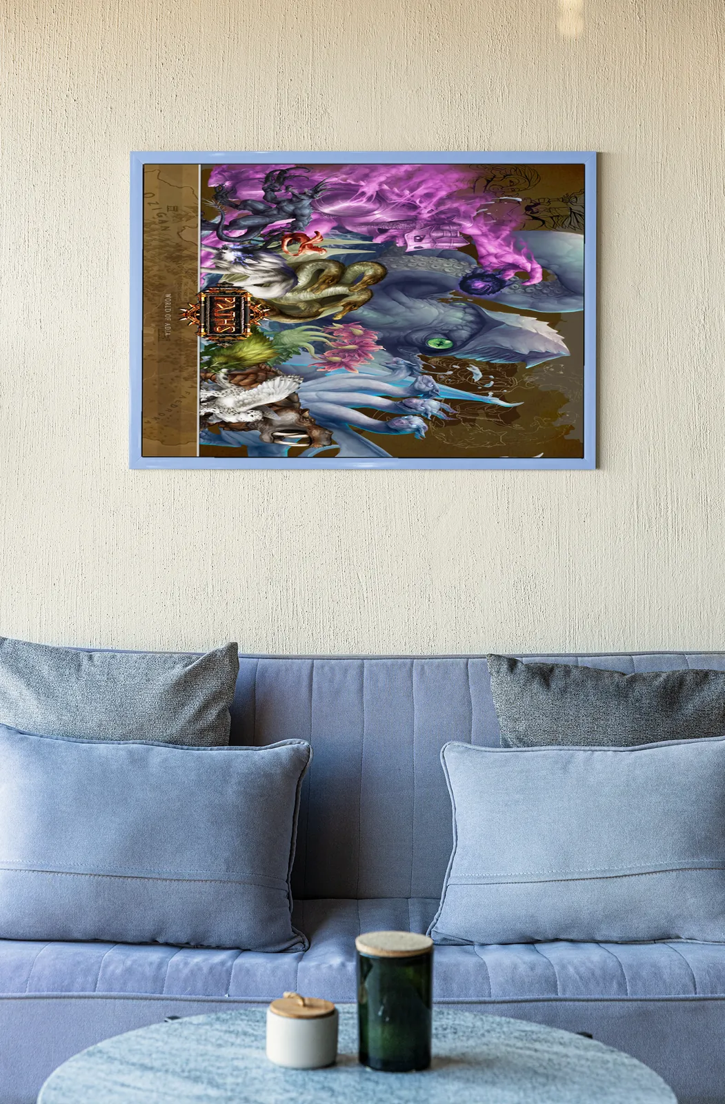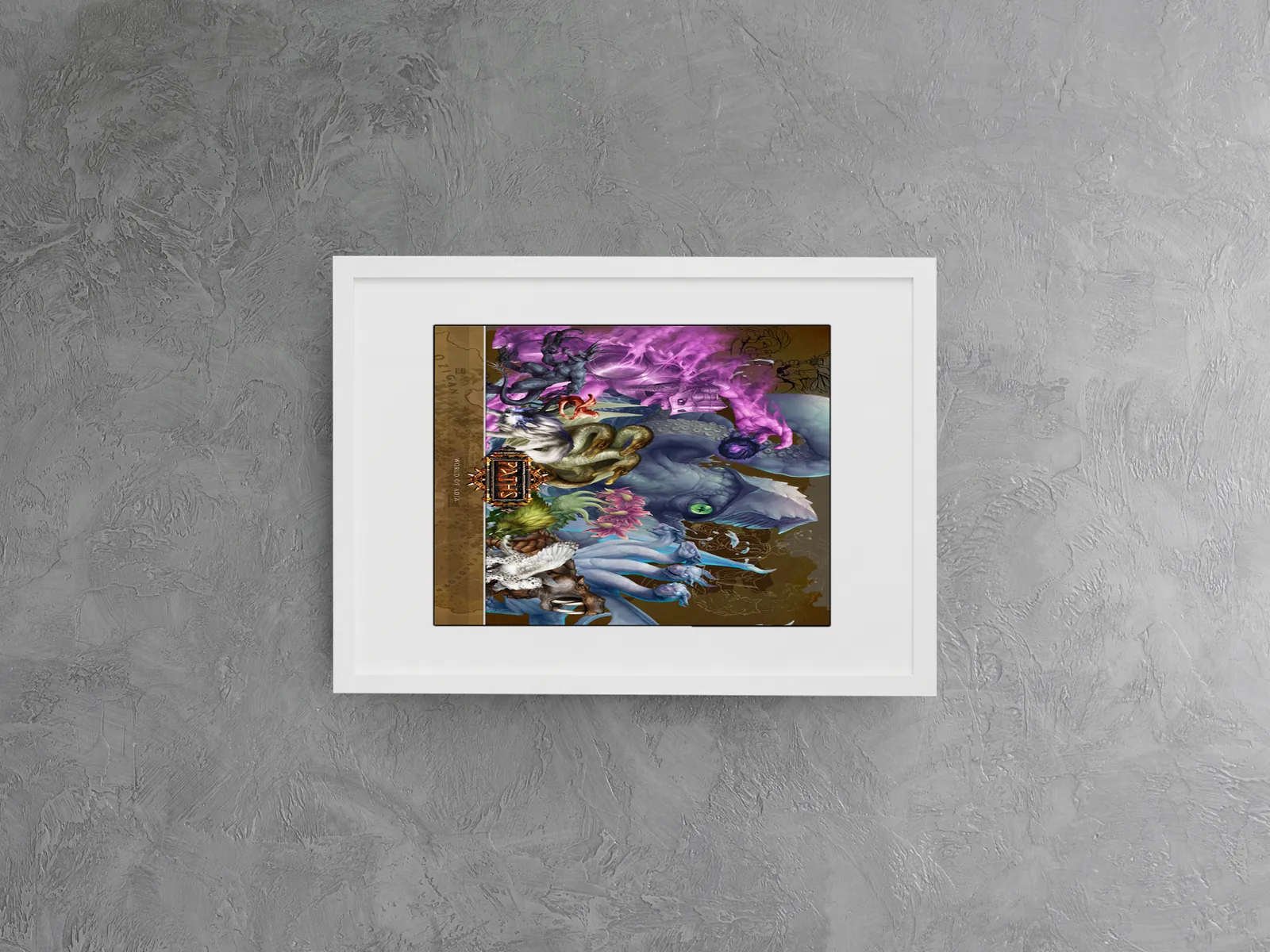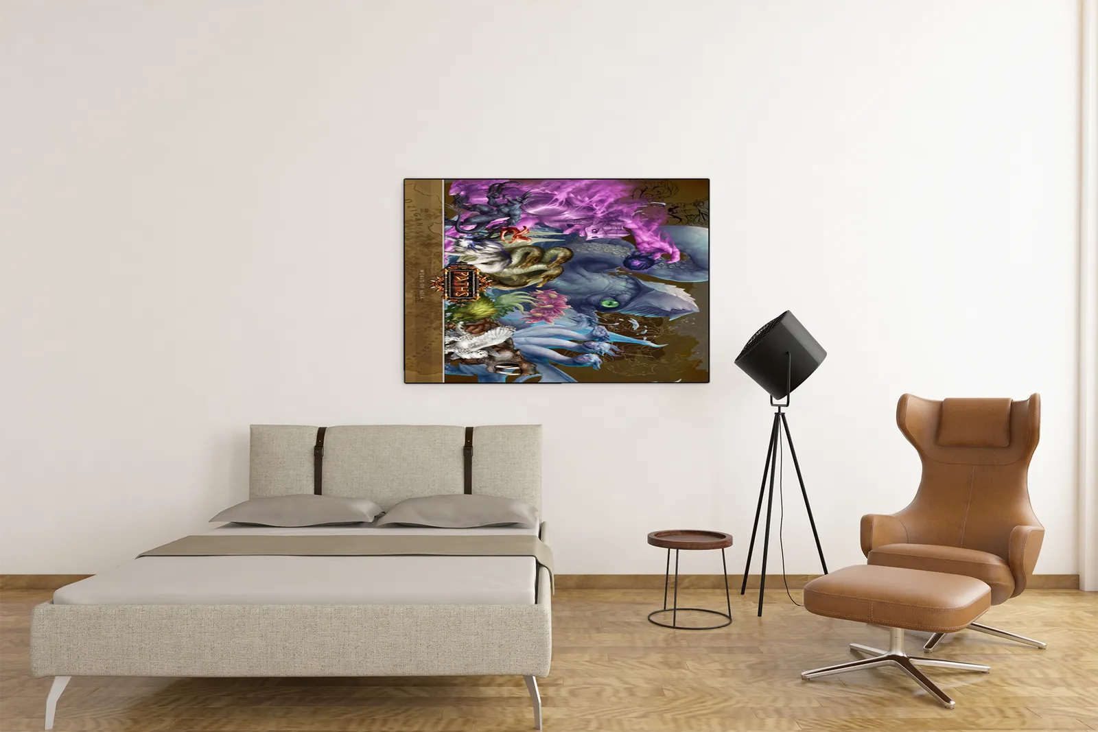 Finally, this illustration on canvas is produced for immersive display and long-term durability. Therefore, layered forms, subtle lighting, and fine detail remain clear at larger sizes. Above all, Core Creatures bestiary ensemble illustration on canvas functions as collectible wall art and a visual reference for fans who appreciate monster design and world-building.