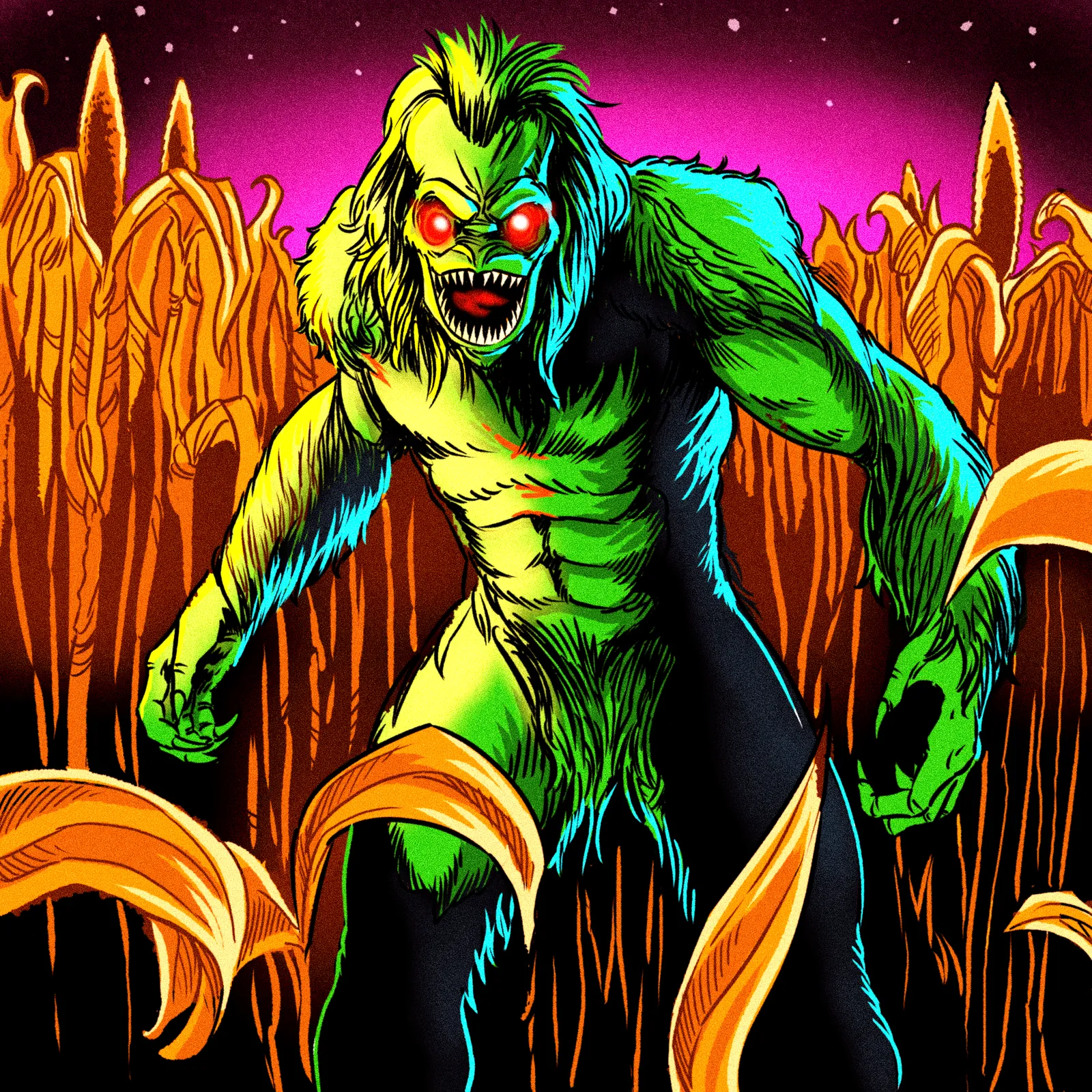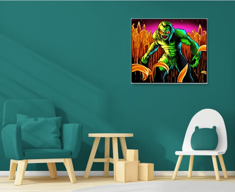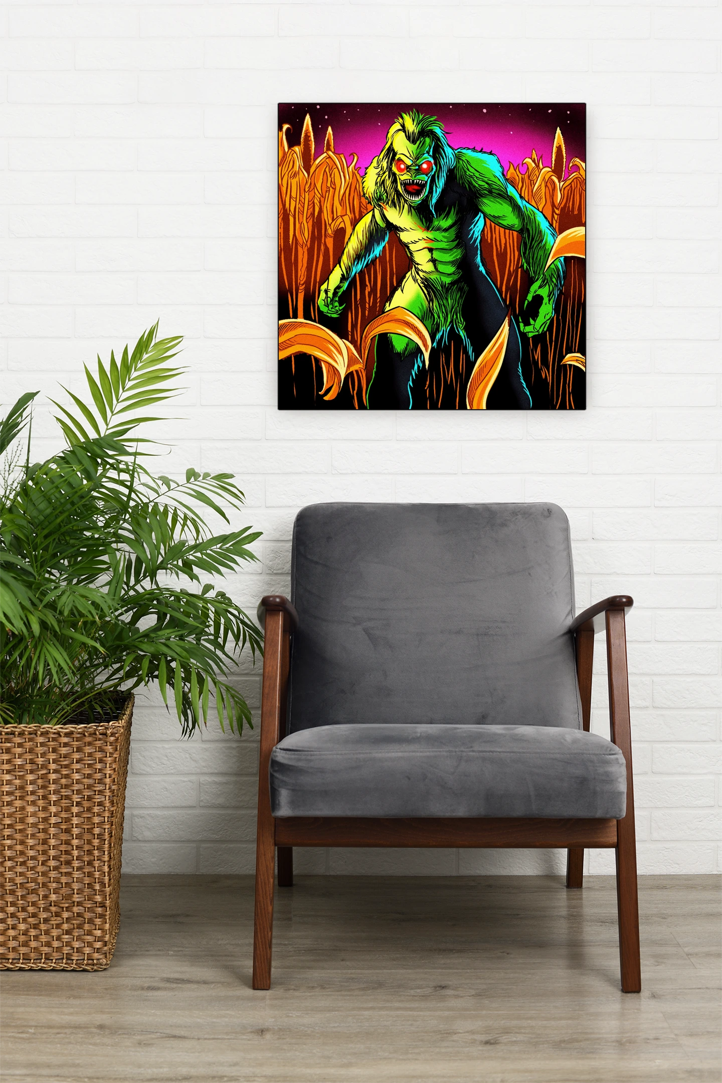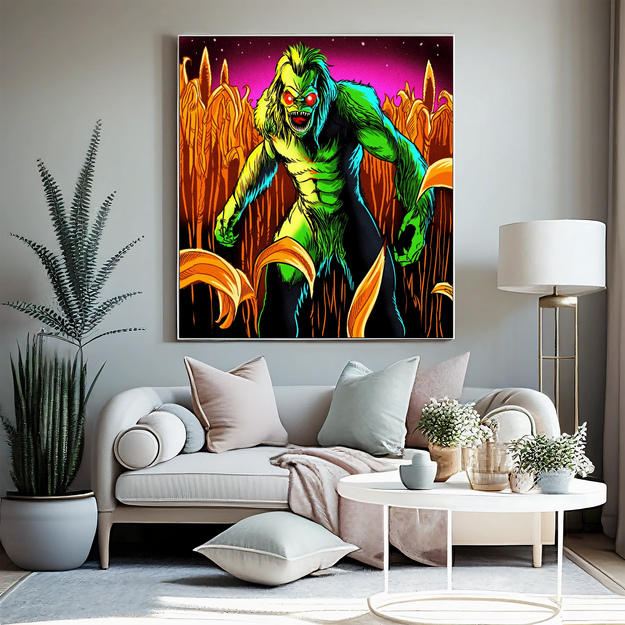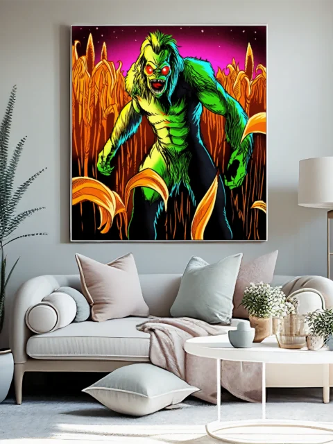 A shaggy green beast grins with fangs bared in a moonlit cornfield. This corn creeper art trading card art canvas print captures Fabricio Vainer’s vintage horror comic style. Notably, glowing red eyes pierce through the wild lime-green fur.