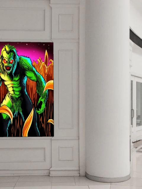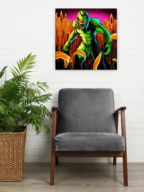 On the wall, the neon-bright palette holds intensity that small formats lose entirely. Ward TCG collectors and retro horror enthusiasts both claim this creature art. The corn creeper art trading card art canvas print delivers campy menace at gallery scale.
