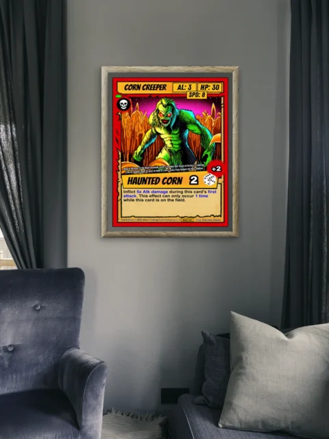 At room scale, the comic book outlines and cel-shaded coloring read with bold clarity. Ward TCG collectors recognize the campy horror tone and aggressive pose. This corn creeper trading card canvas print delivers the full card experience at wall scale.