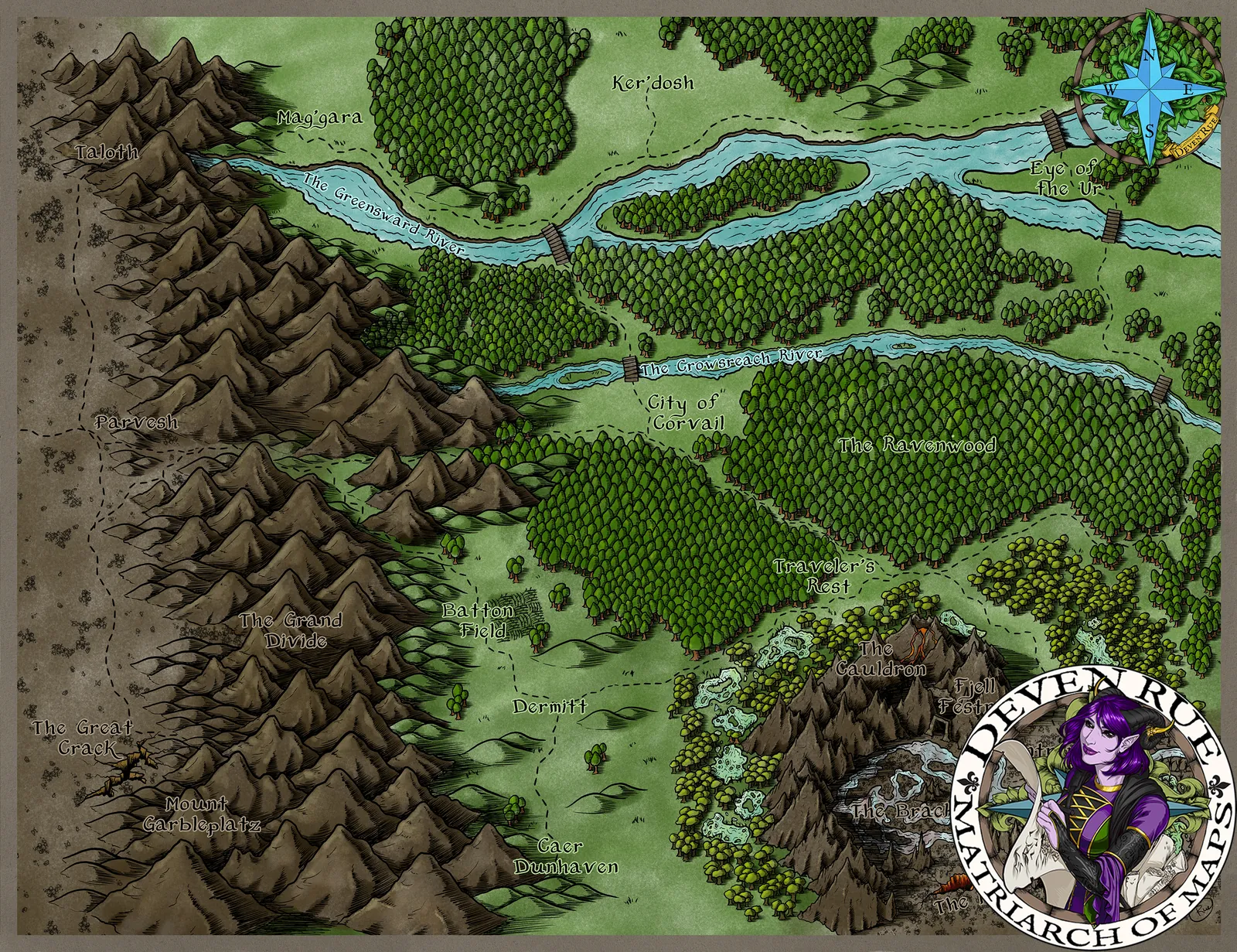 Corvail Map illustrates a richly detailed fantasy region shaped by rivers, forests, and mountain borders that naturally define travel and conflict. Moreover, settlements and landmarks are placed with intention, suggesting trade routes, guarded crossings, and dangerous wilds. This composition makes Corvail Map fantasy regional canvas art an effective tool for long-term storytelling and campaign planning.