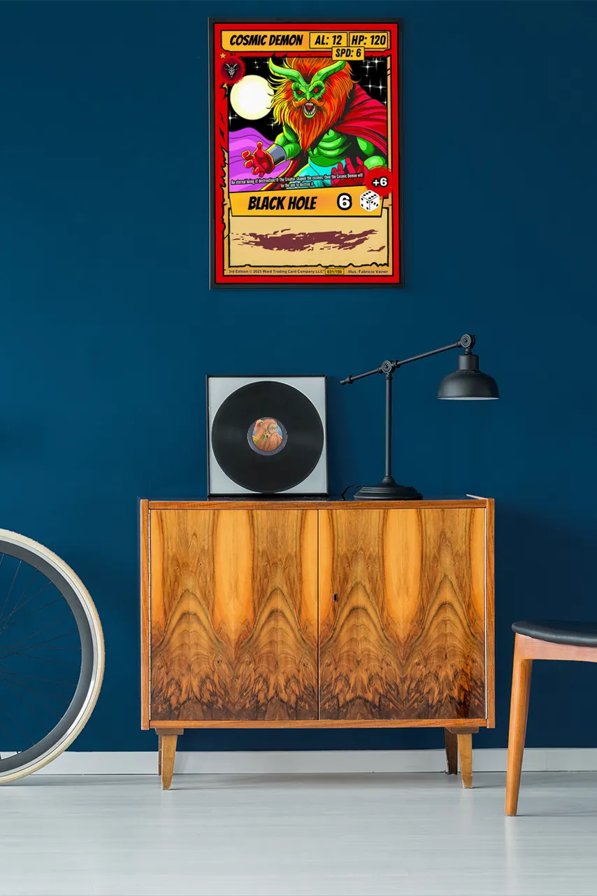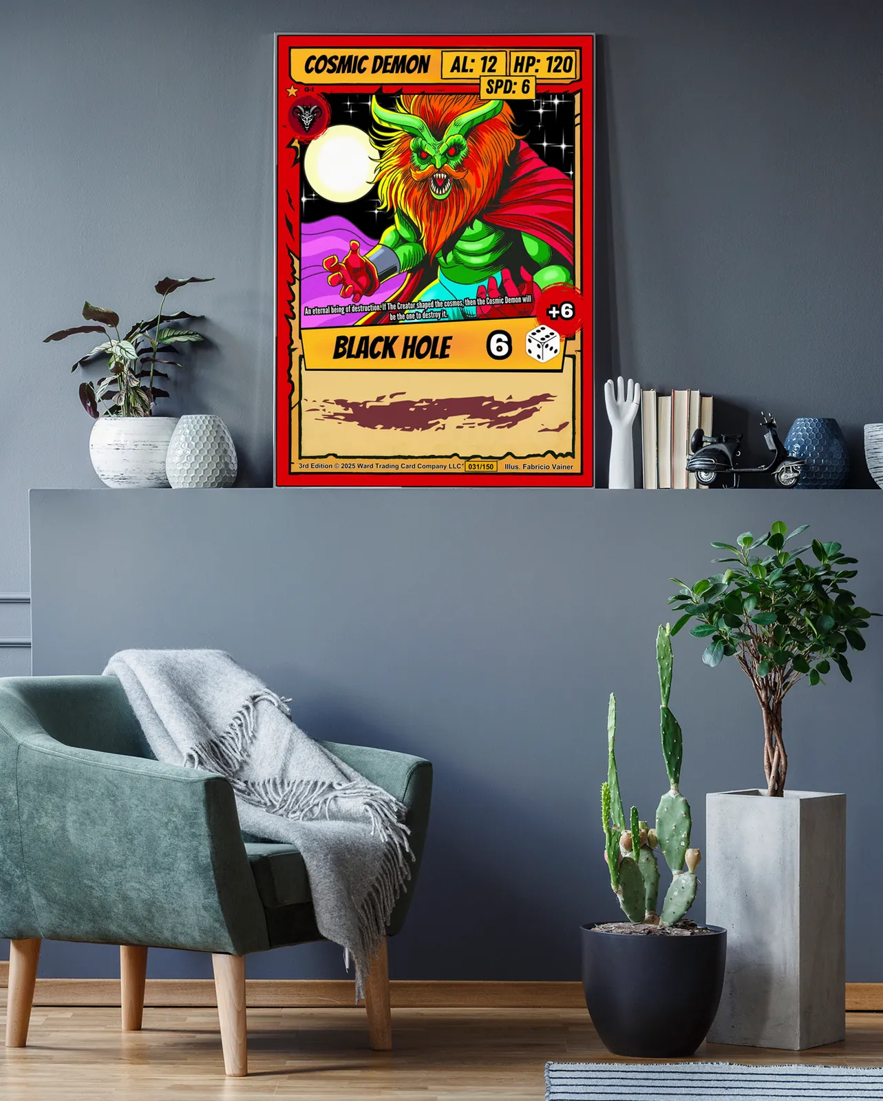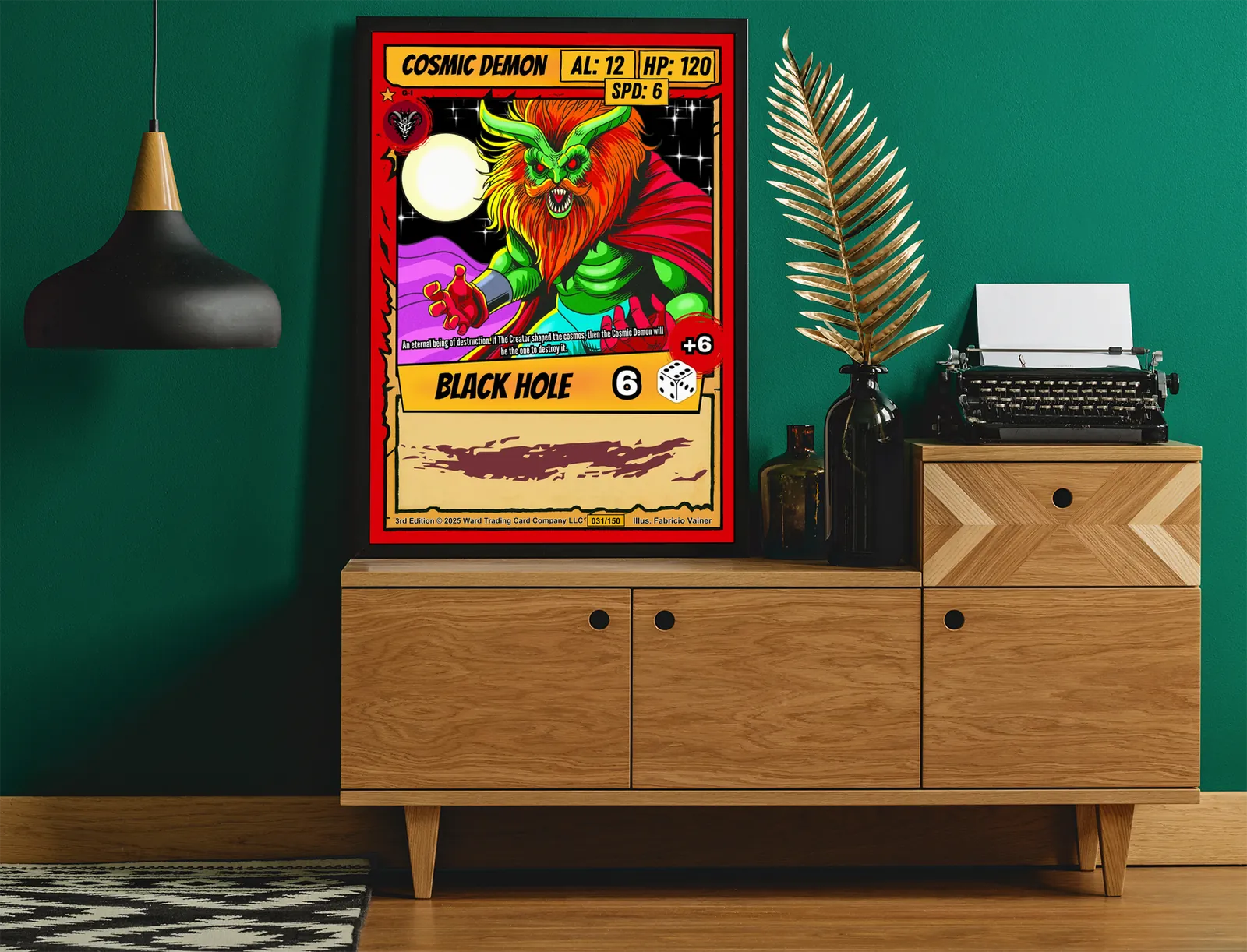 At room scale, the horror-style title font and high-saturation color palette command immediate attention. Ward TCG collectors recognize the Fabricio Vainer illustration style and card number 031/150 from the 3rd Edition set. This cosmic demon trading card canvas print delivers the complete card experience without handling the original.