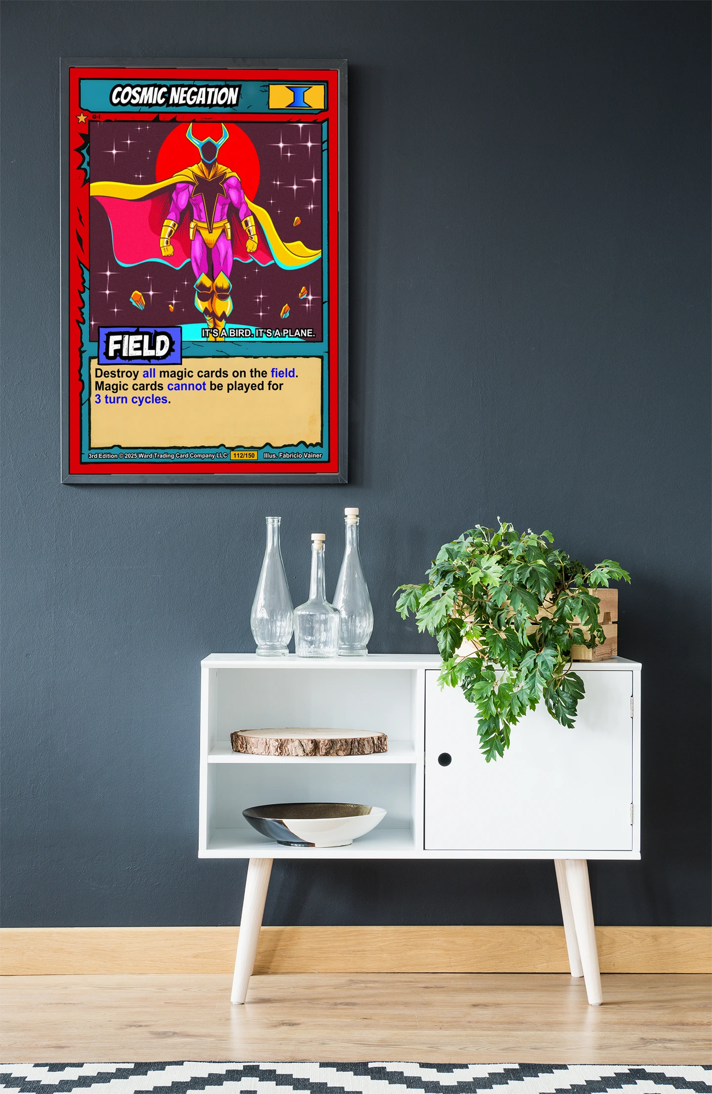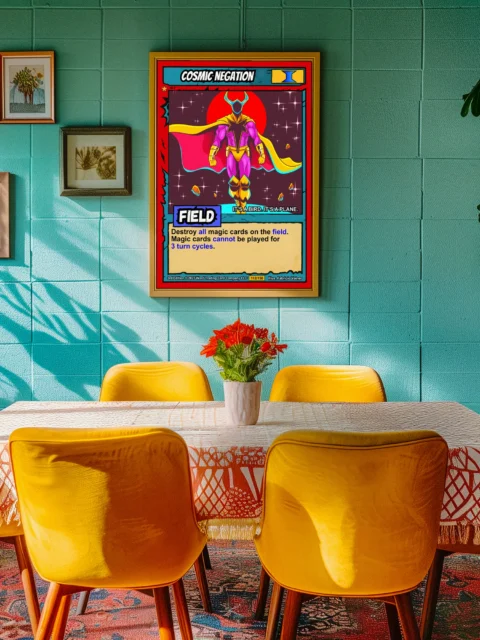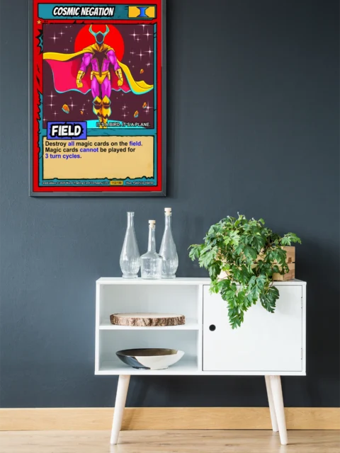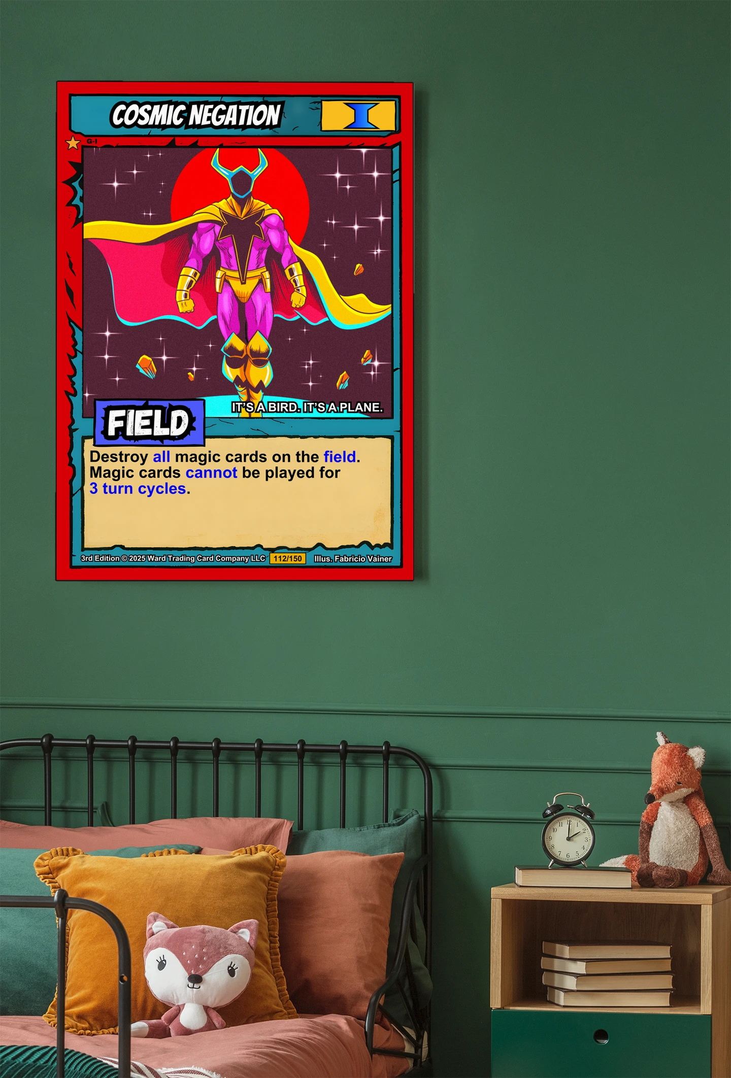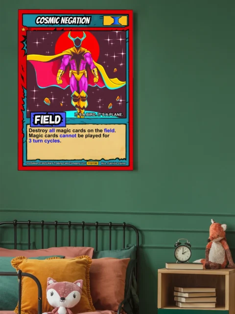 Campaign sessions gain energy when players see their Field cards displayed prominently. TCG collectors appreciate having their favorite mechanics represented in their gaming space. Moreover, this cosmic negation trading card canvas print brings Ward’s strategic depth into view.