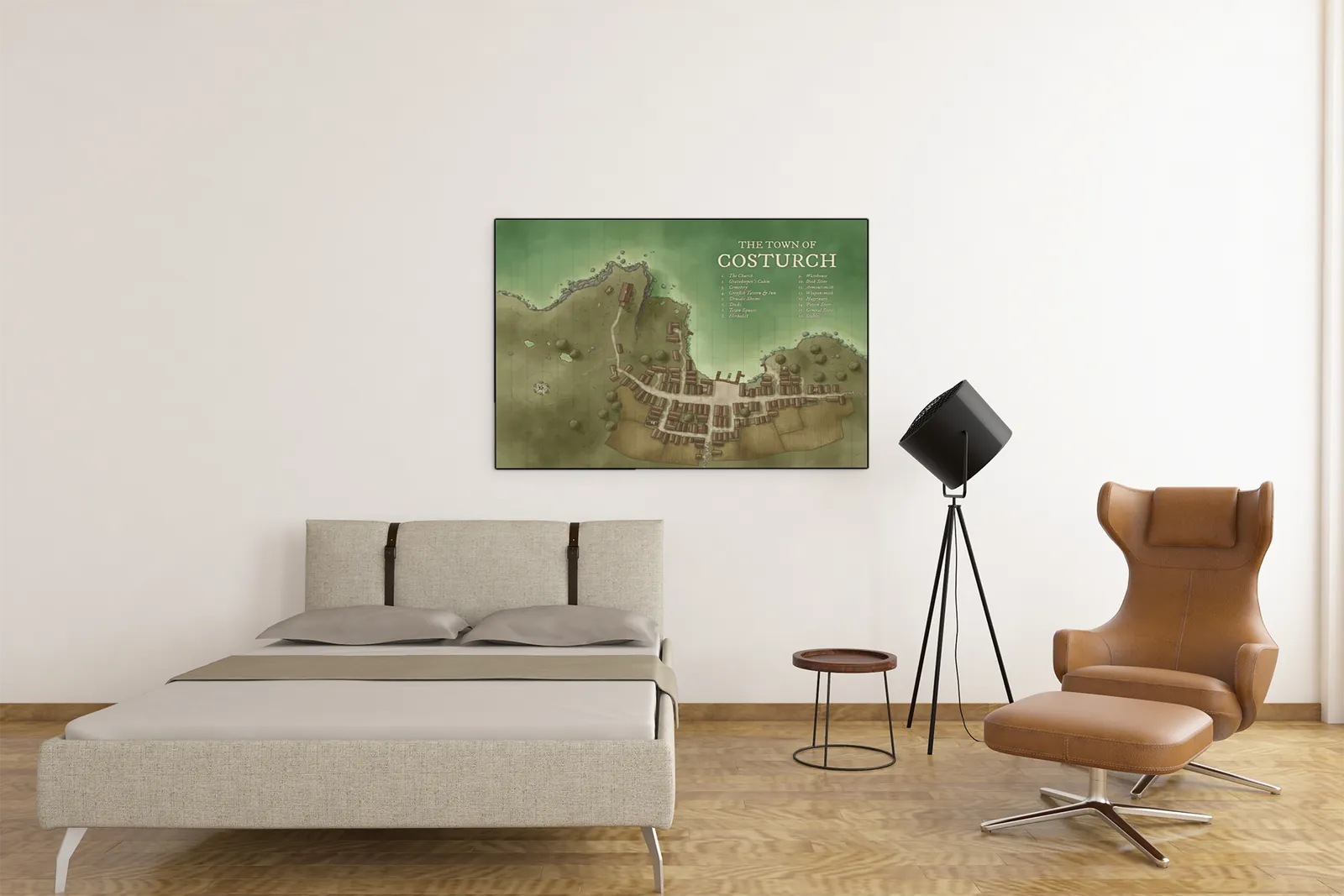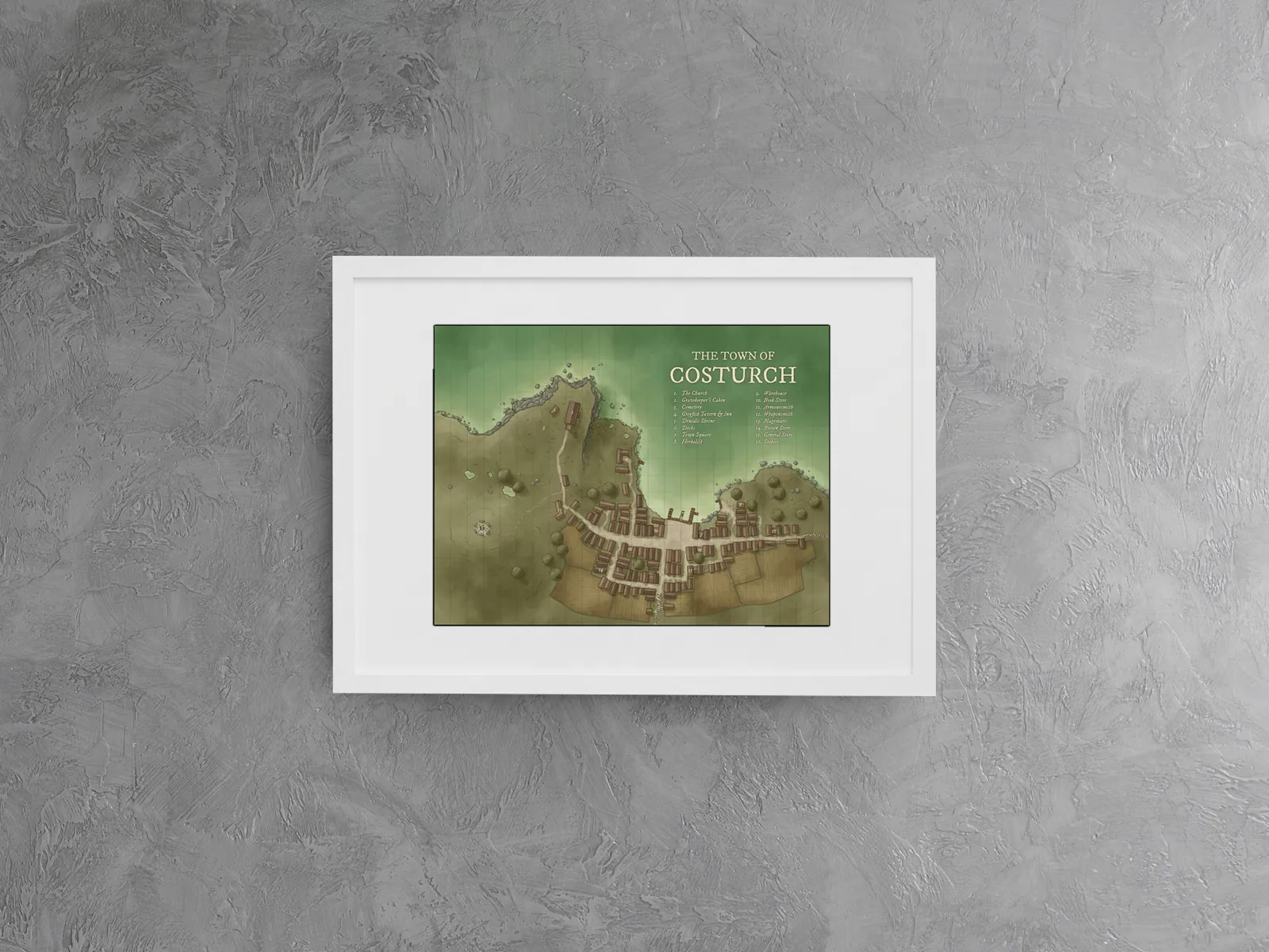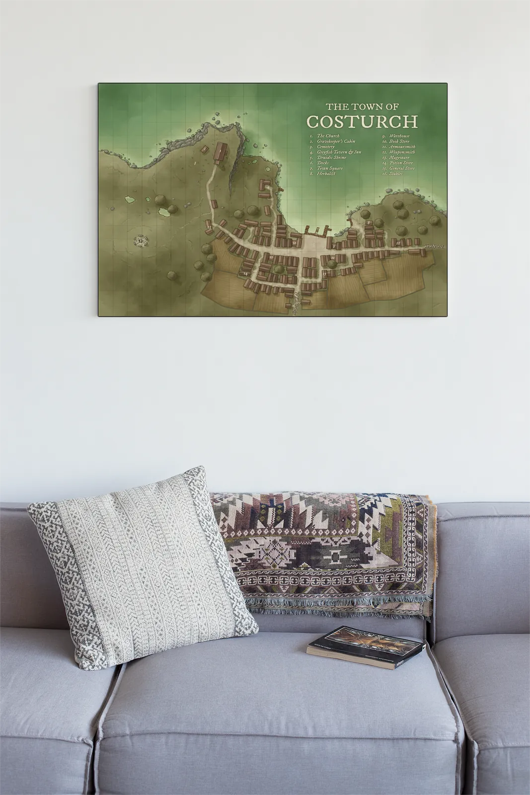 Moreover, Daniels Maps captures Costurch with clarity and restraint. In particular, individual structures, paths, and points of interest are easy to distinguish without crowding the layout. Consequently, the map supports smooth play at the table, allowing Dungeon Masters to track movement, locations, and encounters without confusion. In turn, it works equally well as a narrative reference or visual centerpiece.