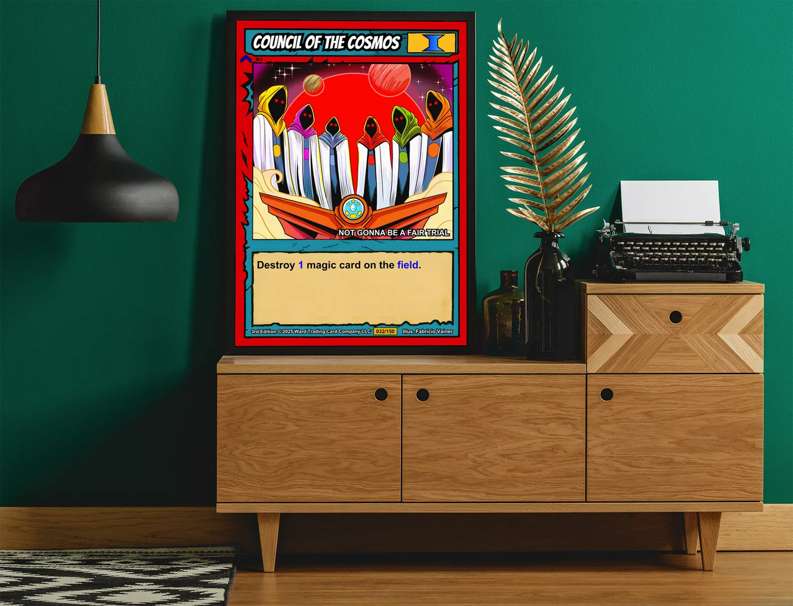 This piece anchors a game room wall above shelving or deck storage. Additionally, it pairs well with other cosmic-themed Ward cards in a gallery row.