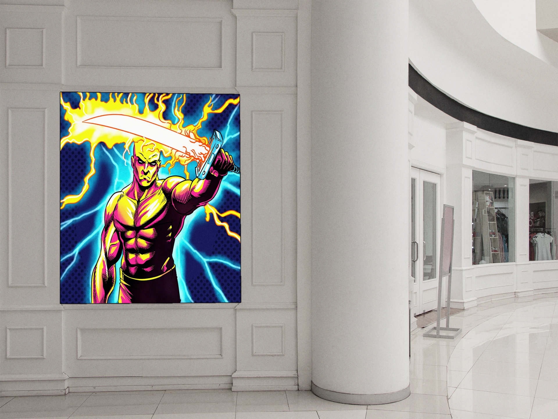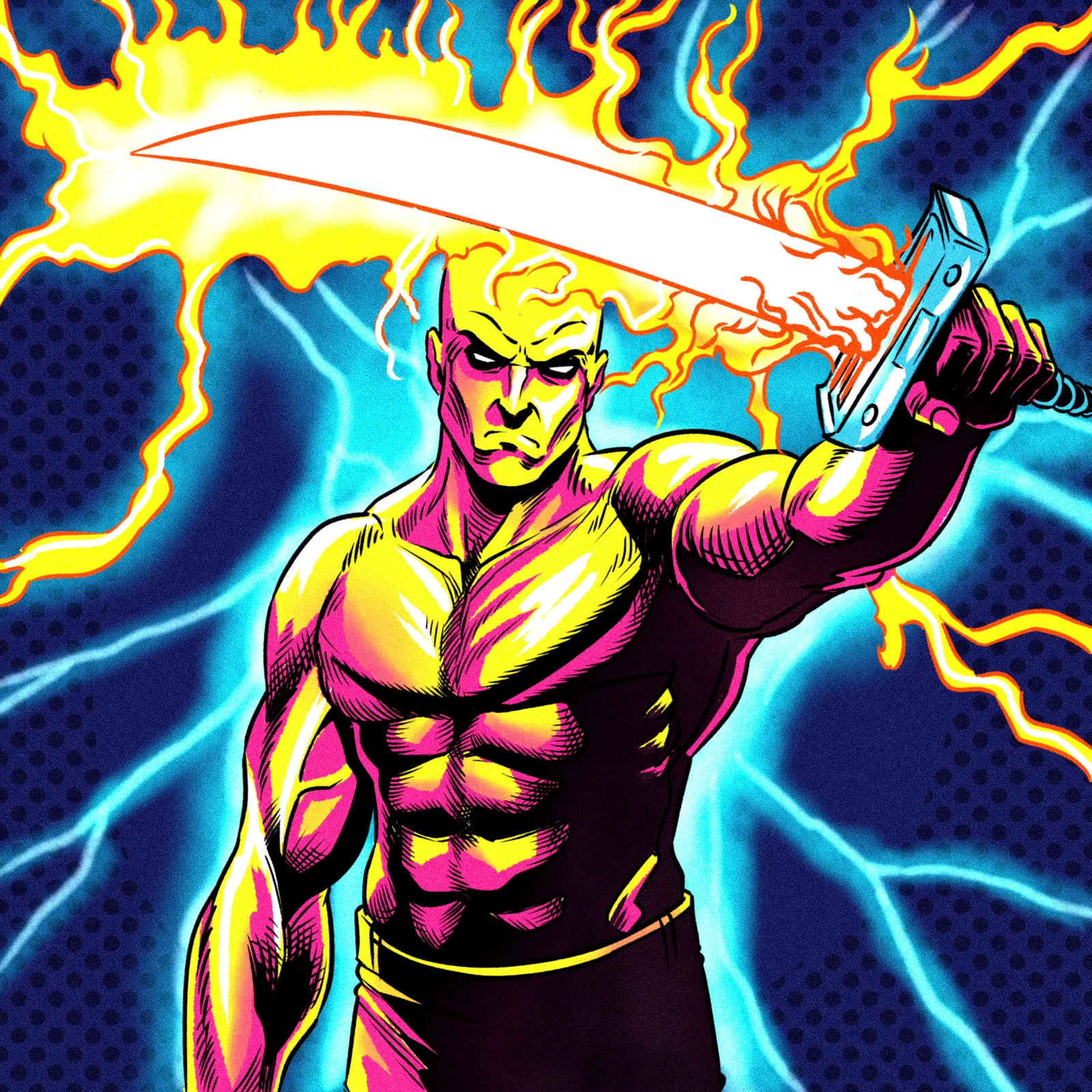 Additionally, halftone dots texture the deep blue background in classic 1980s comic book style. Bold black outlines define exaggerated musculature with cross-hatching in shadow areas. Moreover, orange-yellow fire wraps around both the white blade and the figure’s flaming head aura.