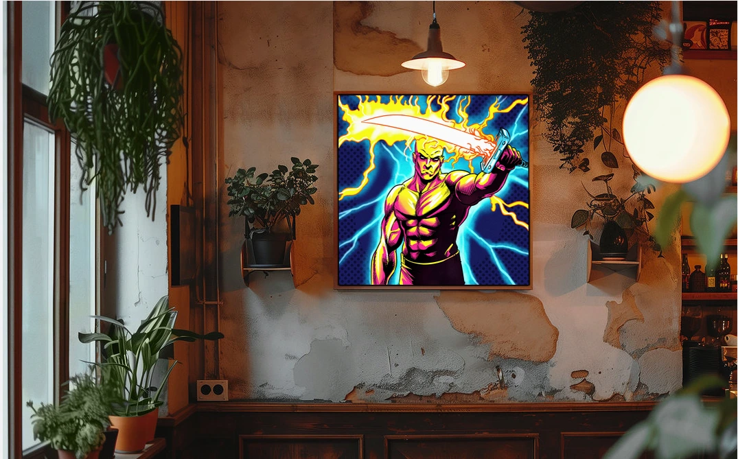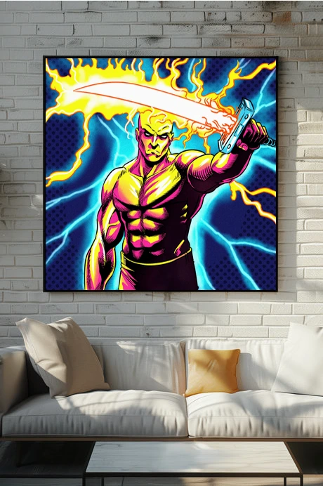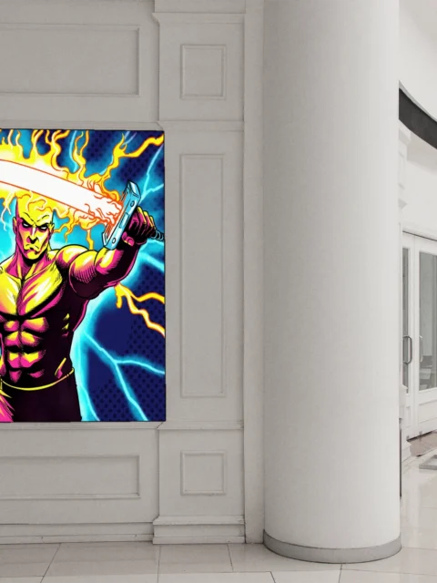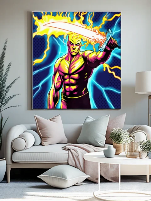 The aggressive heroic pose suits game rooms where bold linework and saturated color reinforce competitive energy. Additionally, the 1980s illustration style appeals to collectors displaying vintage comic book aesthetics.