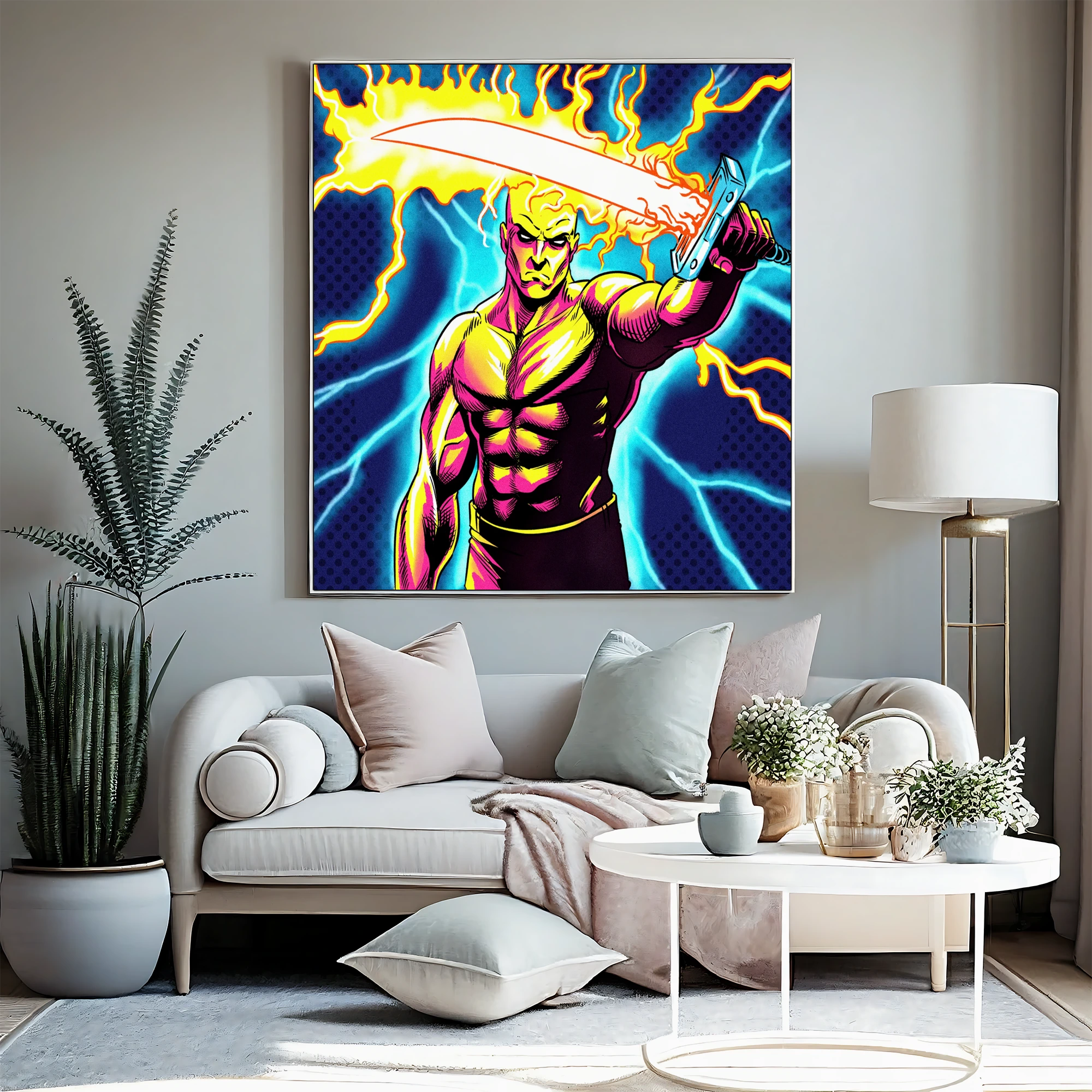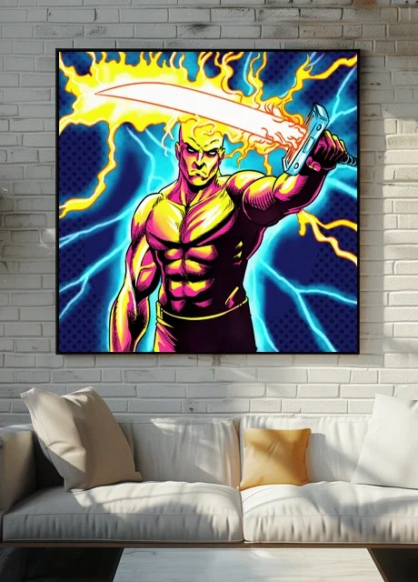 A bald warrior grimaces while gripping a flame-engulfed sword diagonally across frame. This creators gift art trading card art canvas print reproduces Fabricio Vainer’s illustration at full scale. Notably, magenta and yellow skin tones contrast sharply against cyan lightning strikes.