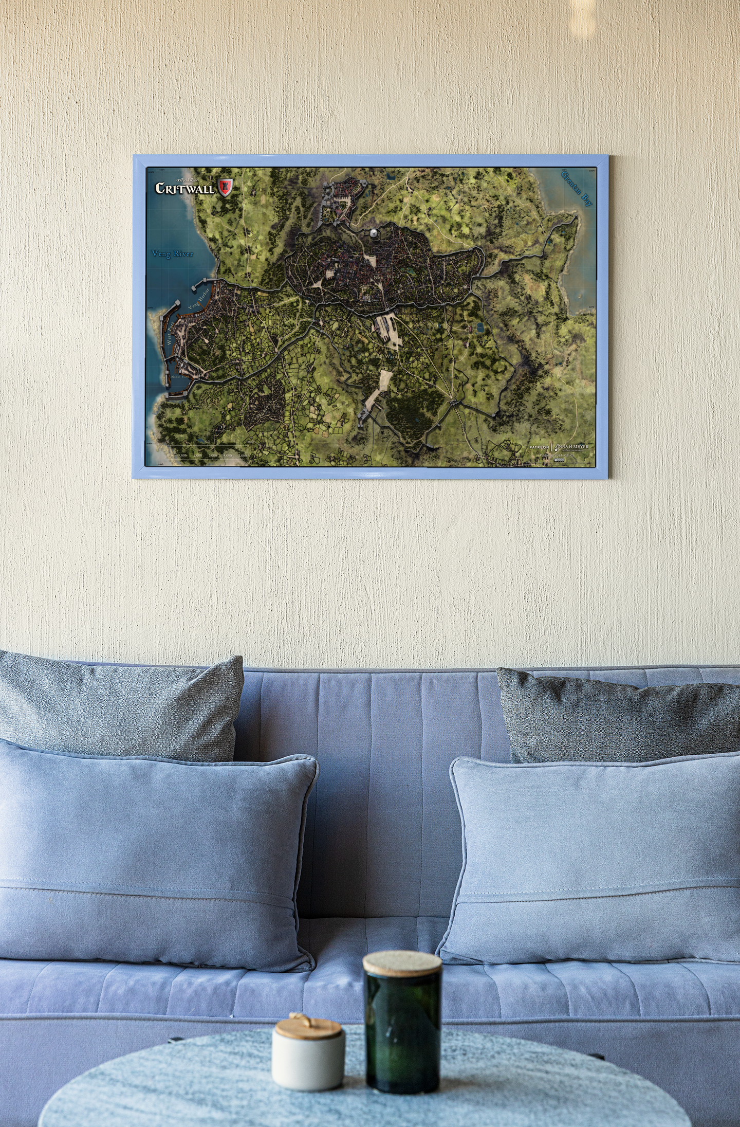 The Critwall City Fantasy Map reveals a fortified settlement shaped by order, defense, and control. From the outset, stone walls enclose dense districts, while roads and corridors guide movement with intent. As a result, the city feels deliberate rather than sprawling. Every street suggests authority, trade, and the quiet tension of power held in balance.