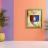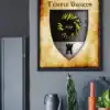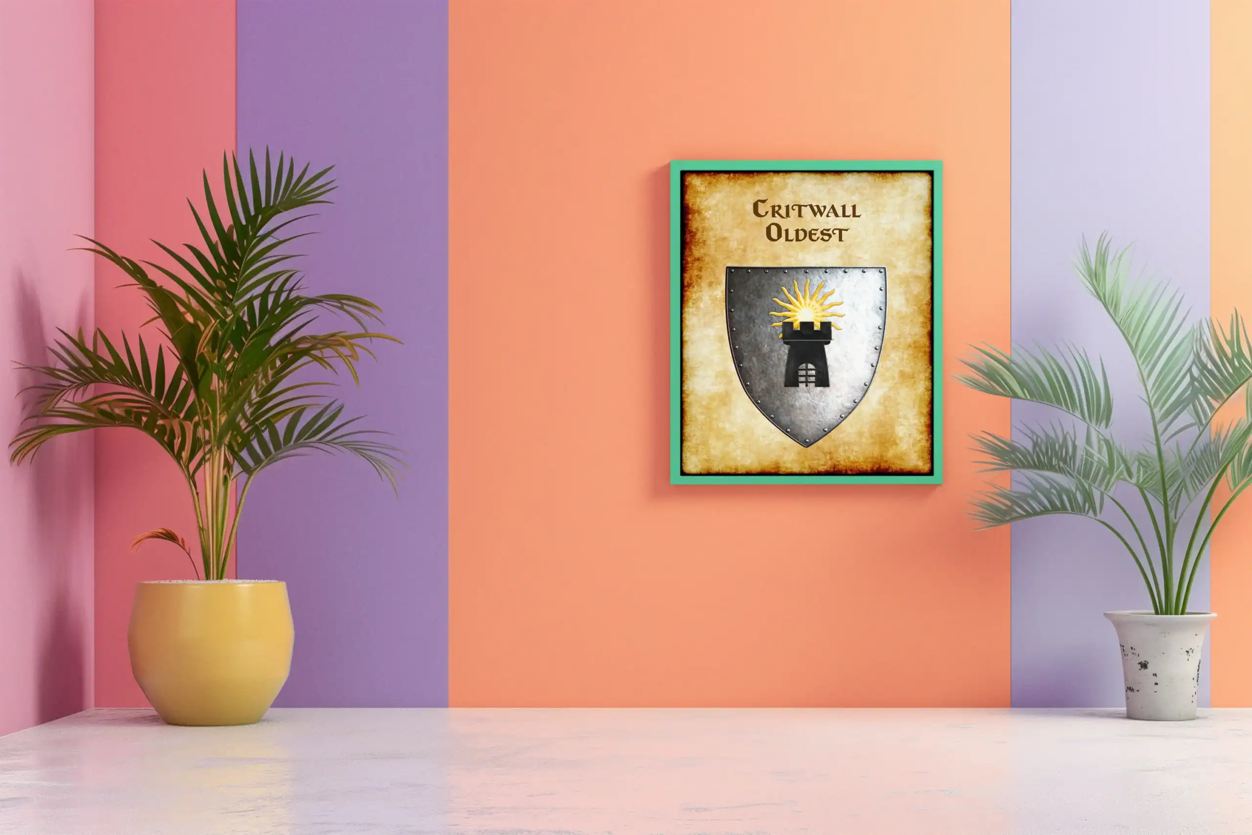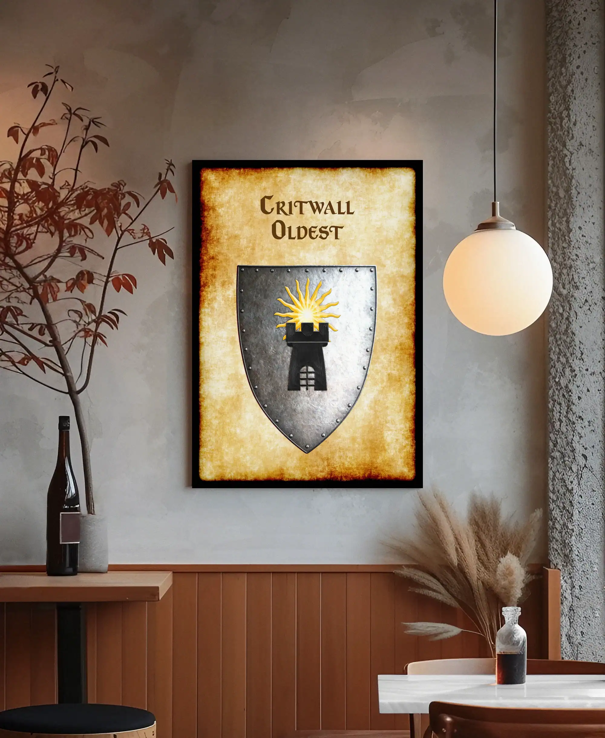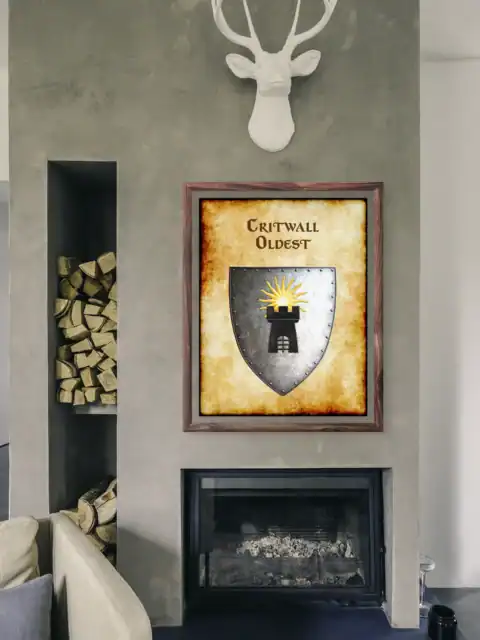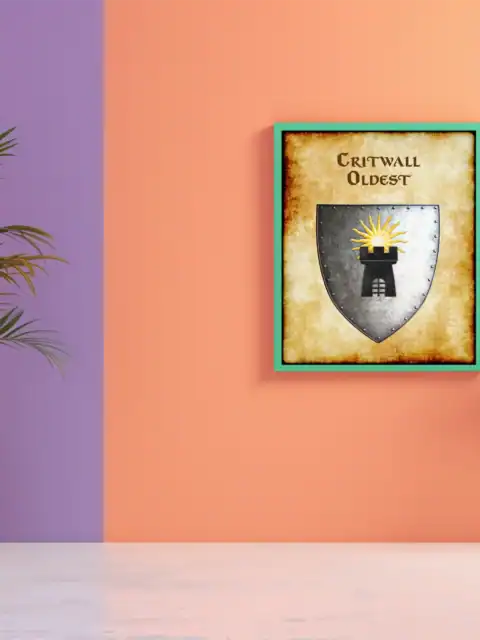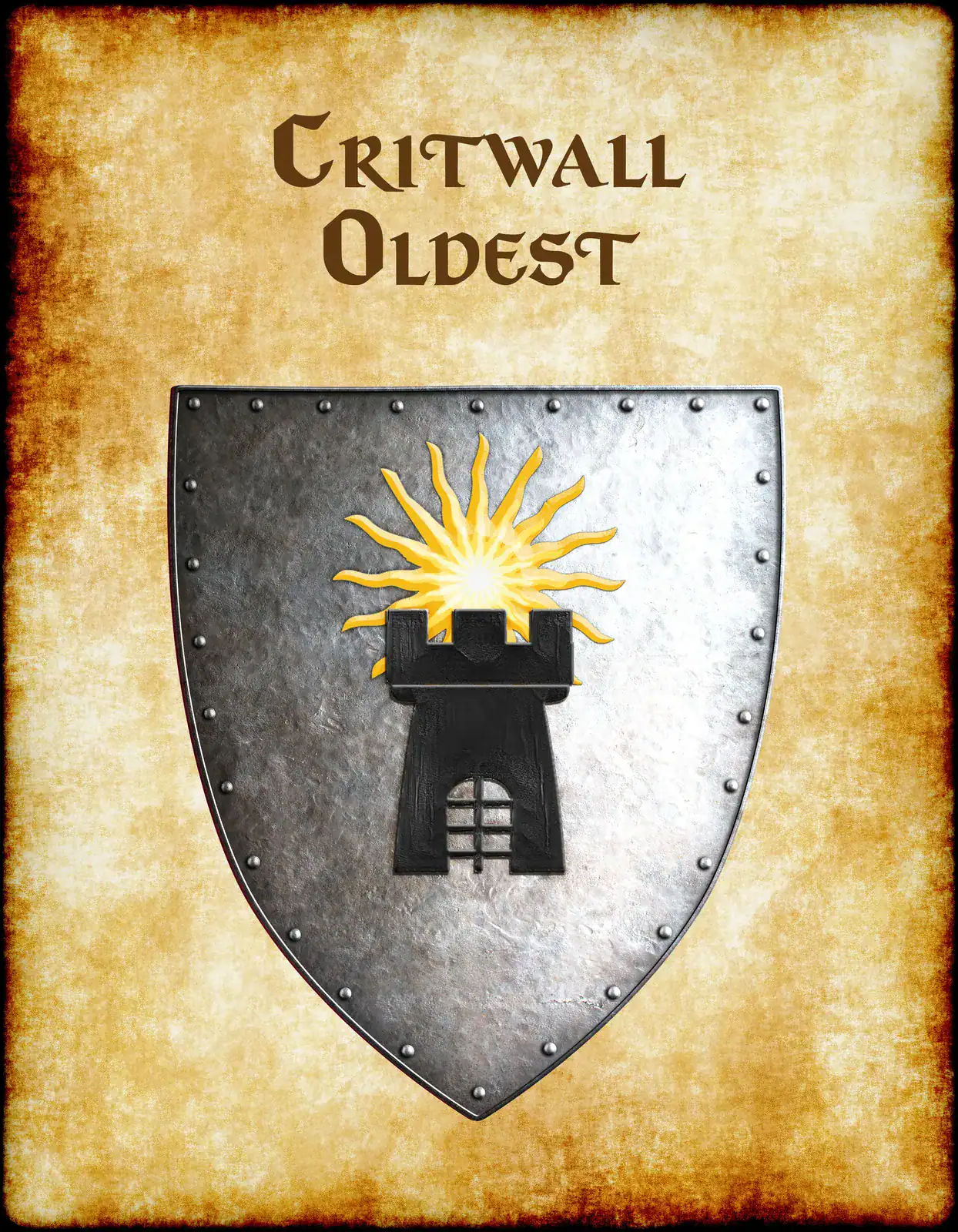 A black tower crowned with golden sun rays dominates this medieval heraldic shield. This critwall oldest Greyhawk heraldry canvas print captures the fortress realm’s ancient authority. Notably, weathered parchment borders frame the riveted silver-gray metal with authentic aging.
