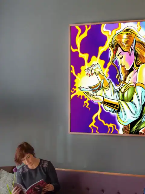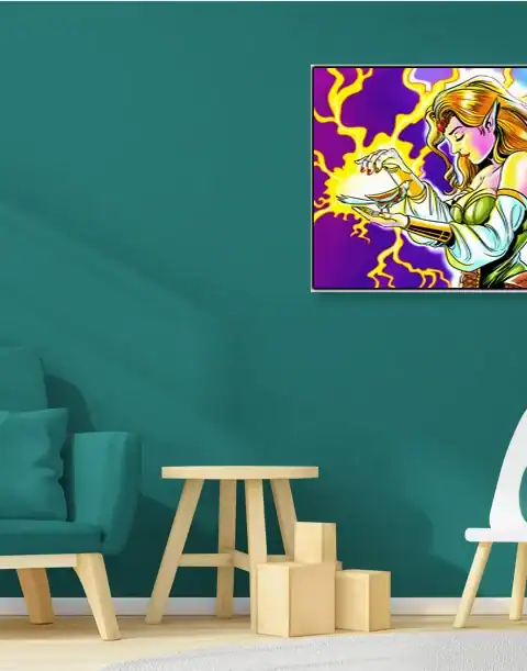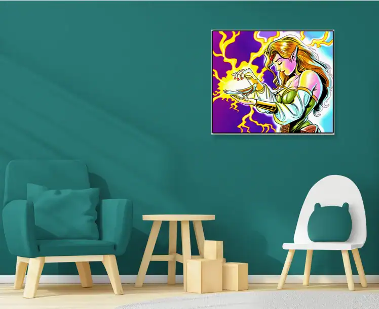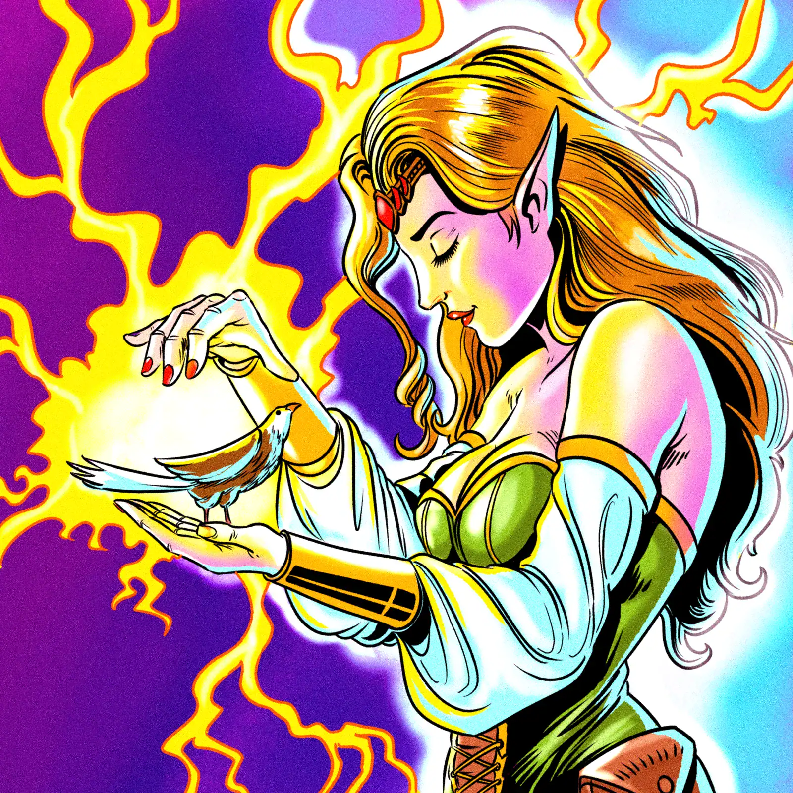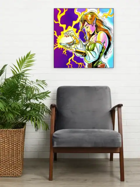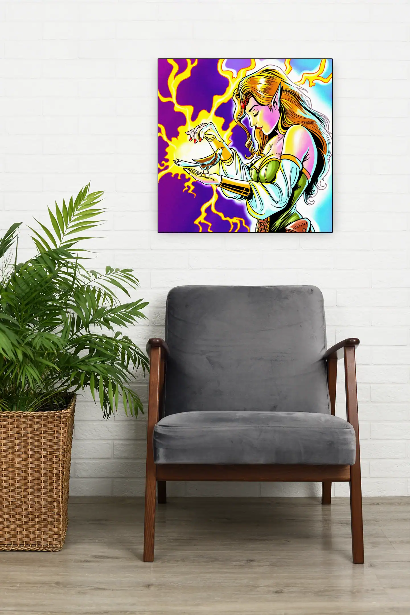 A golden-haired elf gently cradles a small brown bird on her finger. This cure minor wounds art trading card canvas print captures Fabricio Vainer’s signature 1990s comic style. Purple lightning crackles dramatically around the healing scene, notably highlighting her flowing sleeves.