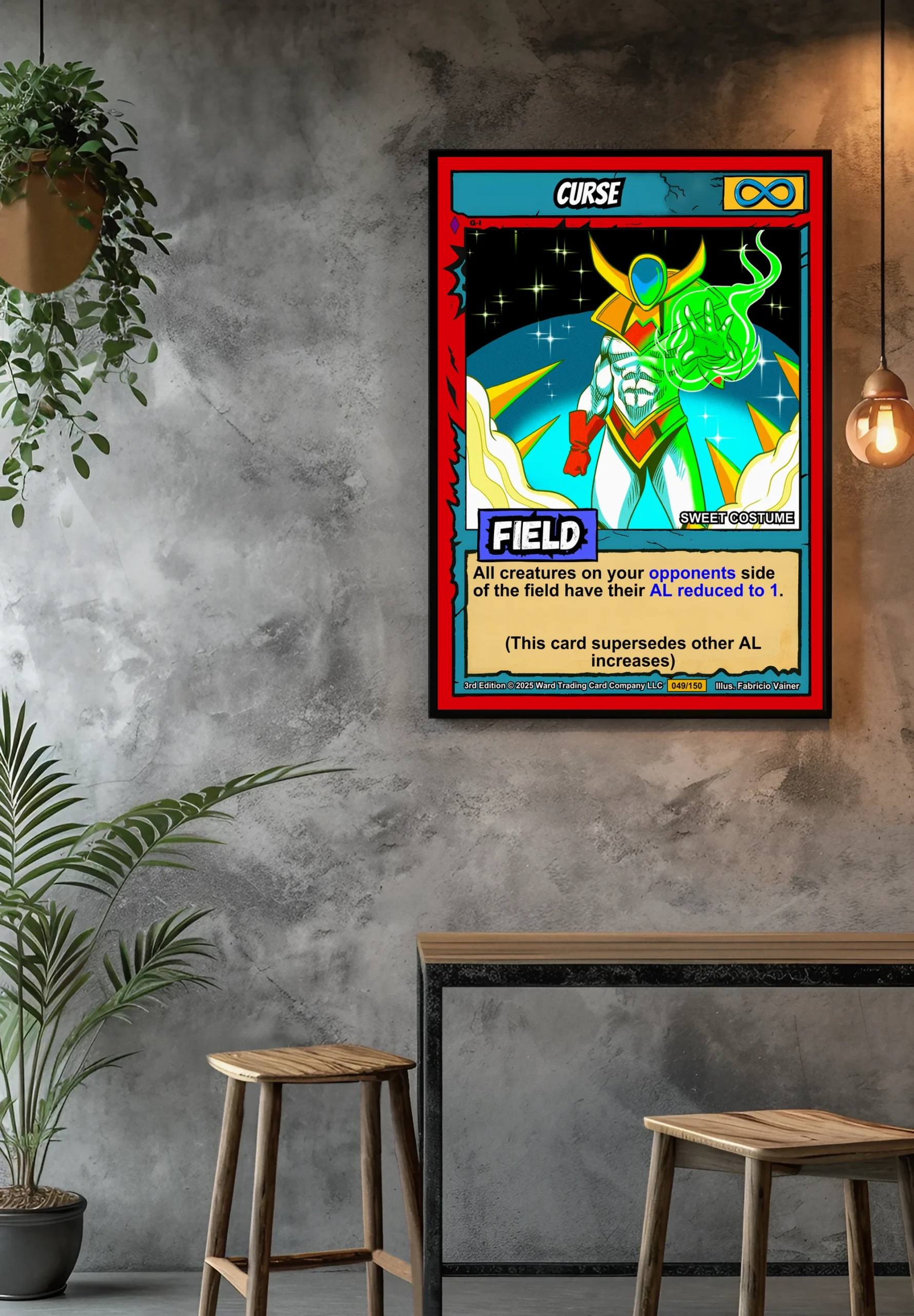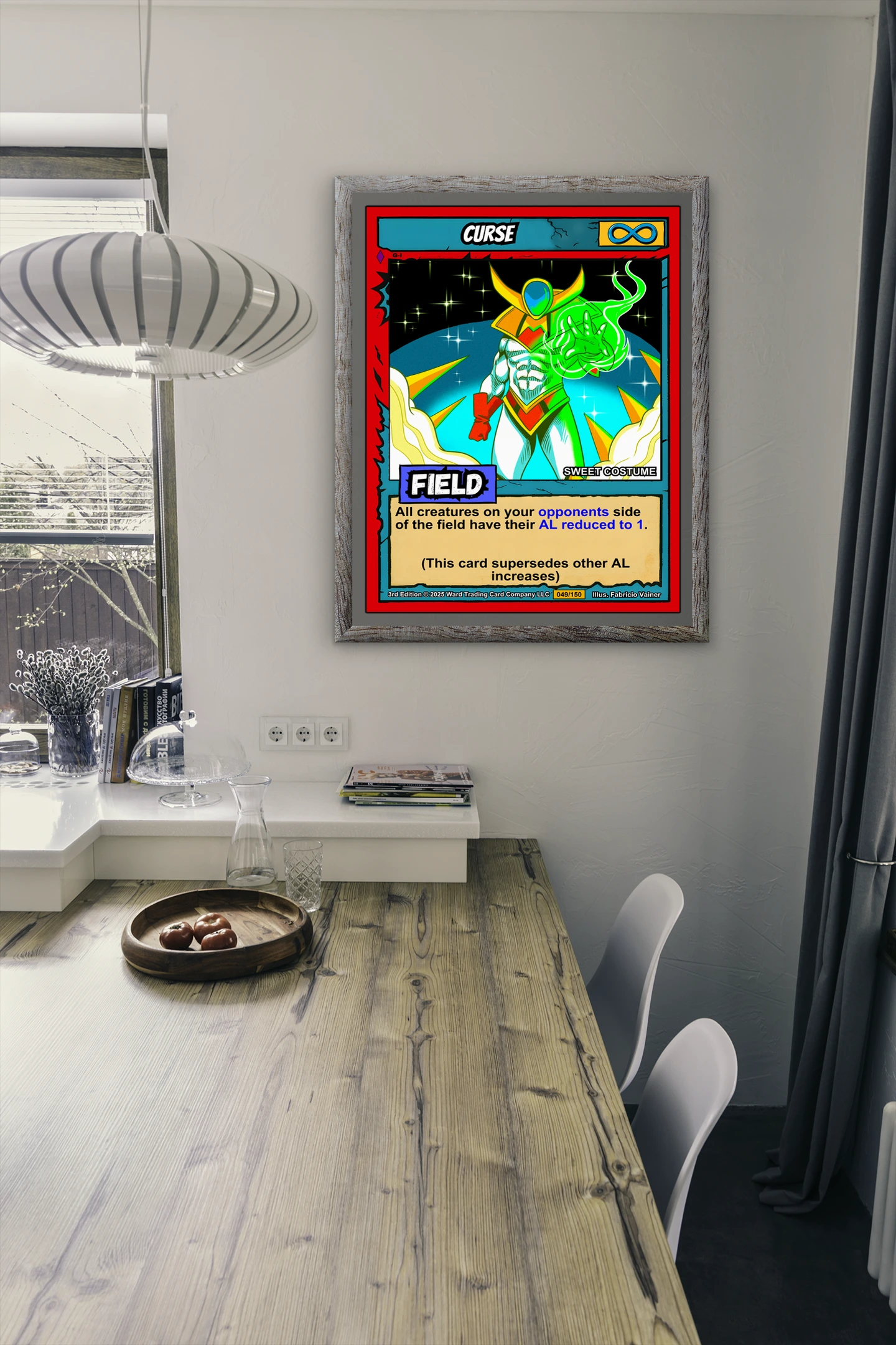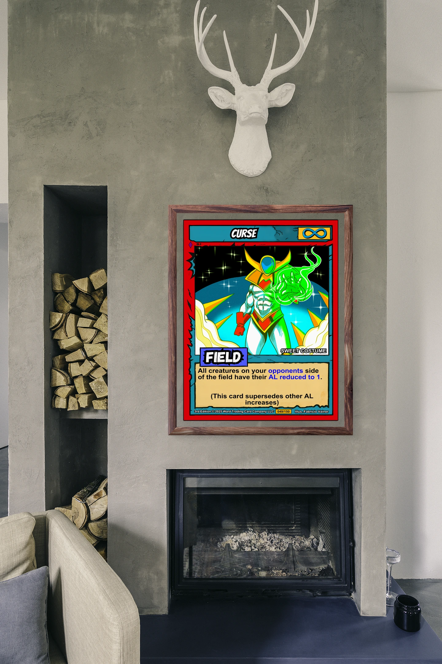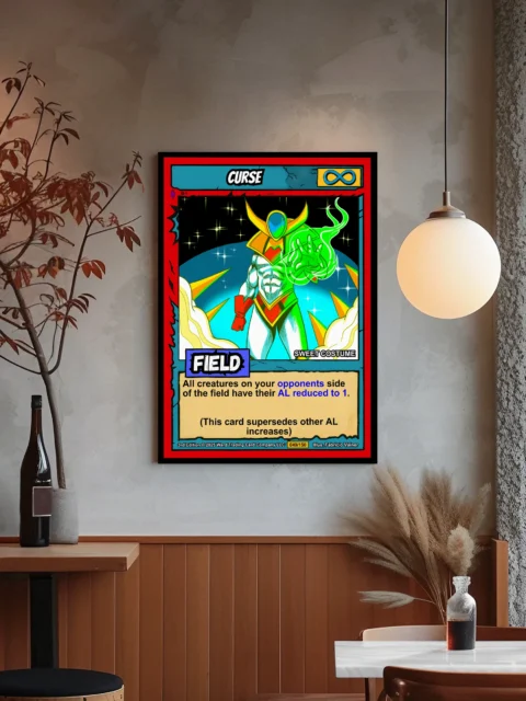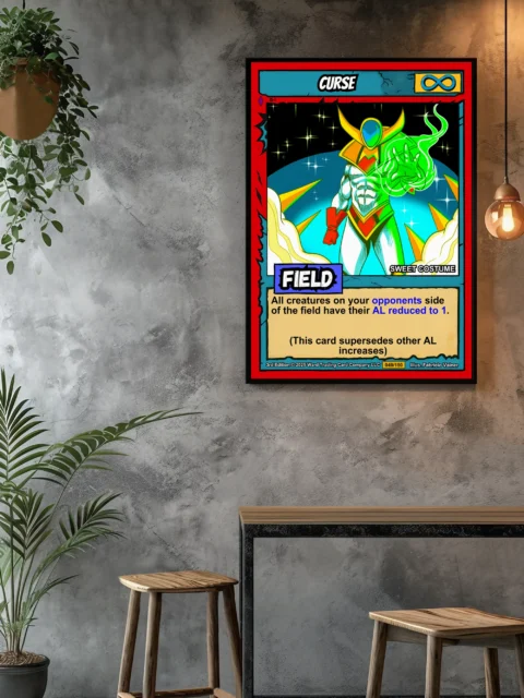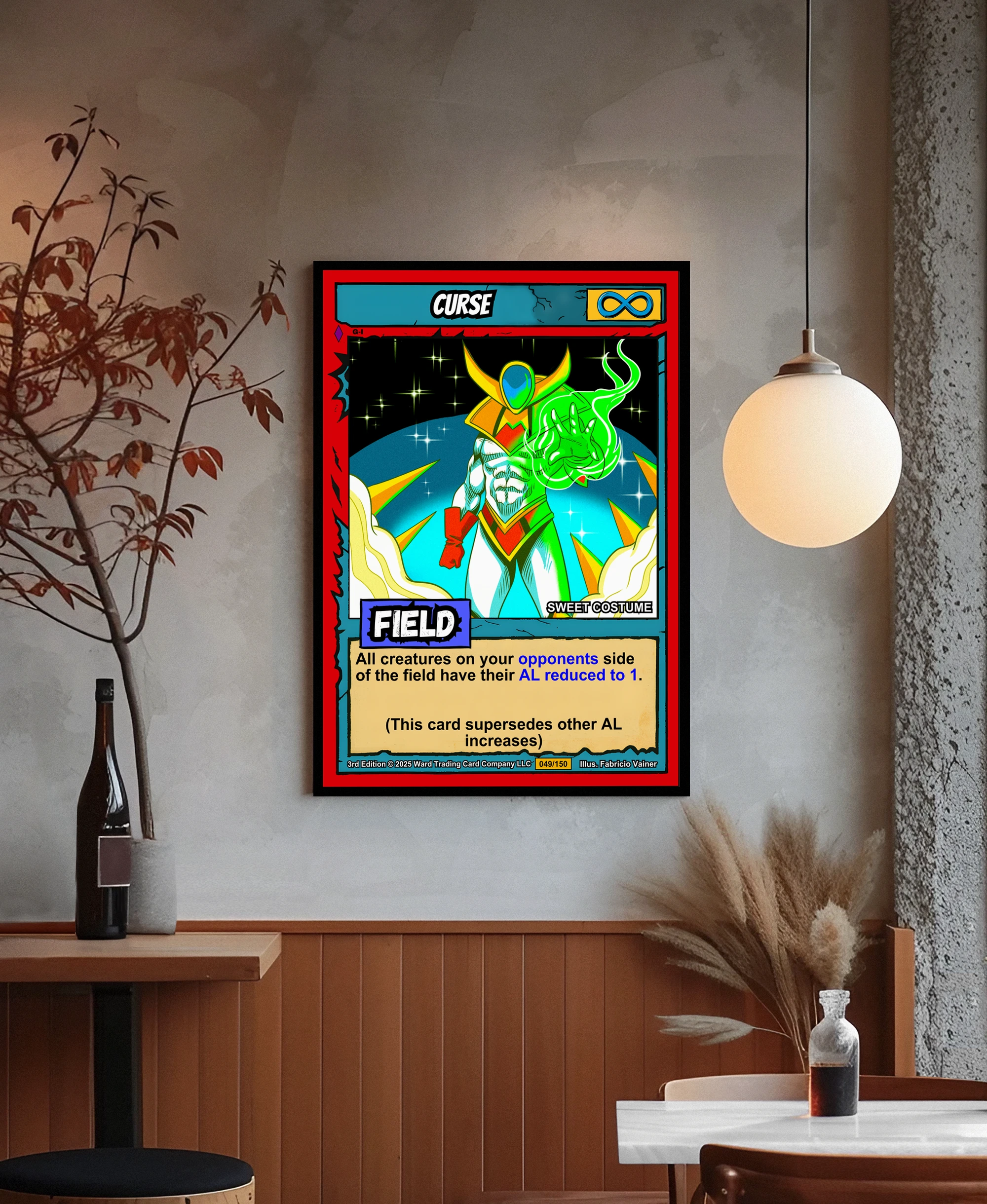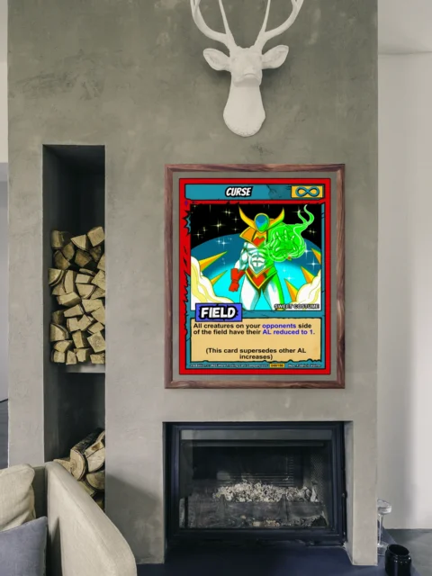 Dungeon masters display this when campaigns turn to otherworldly threats. TCG collectors appreciate Vainer’s bold cel-shading and retro comic styling. Particularly, this curse trading card canvas print commands respect among fantasy gamers.