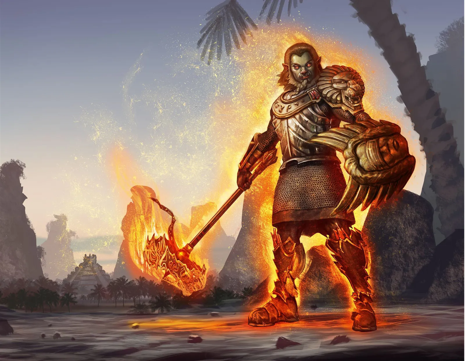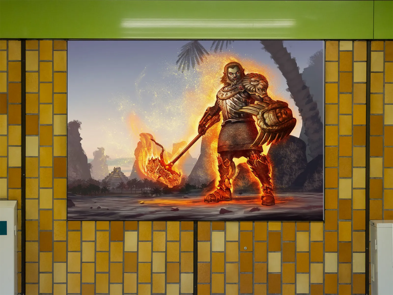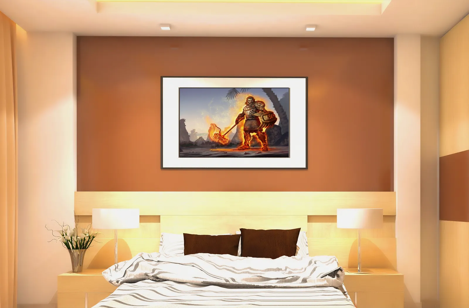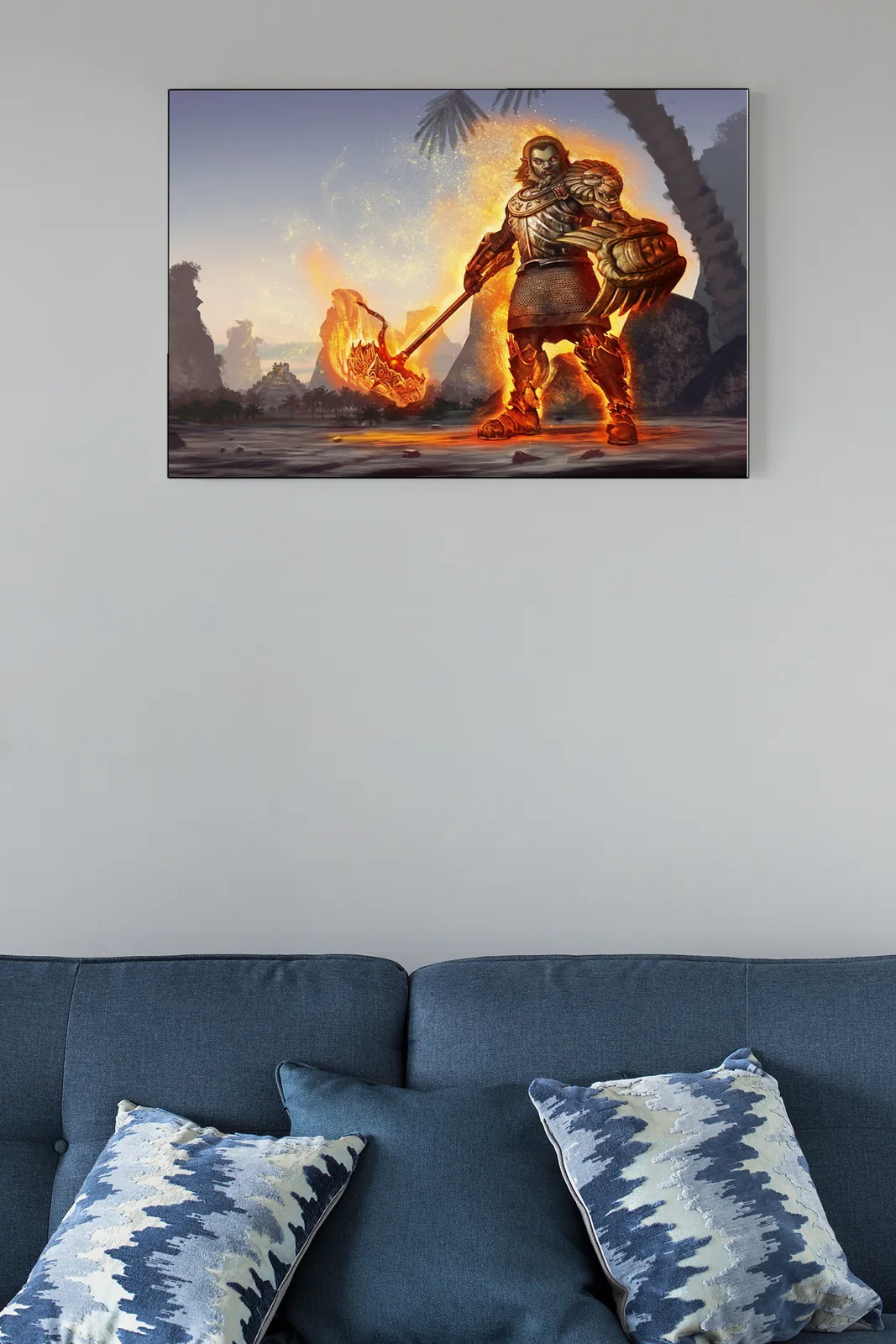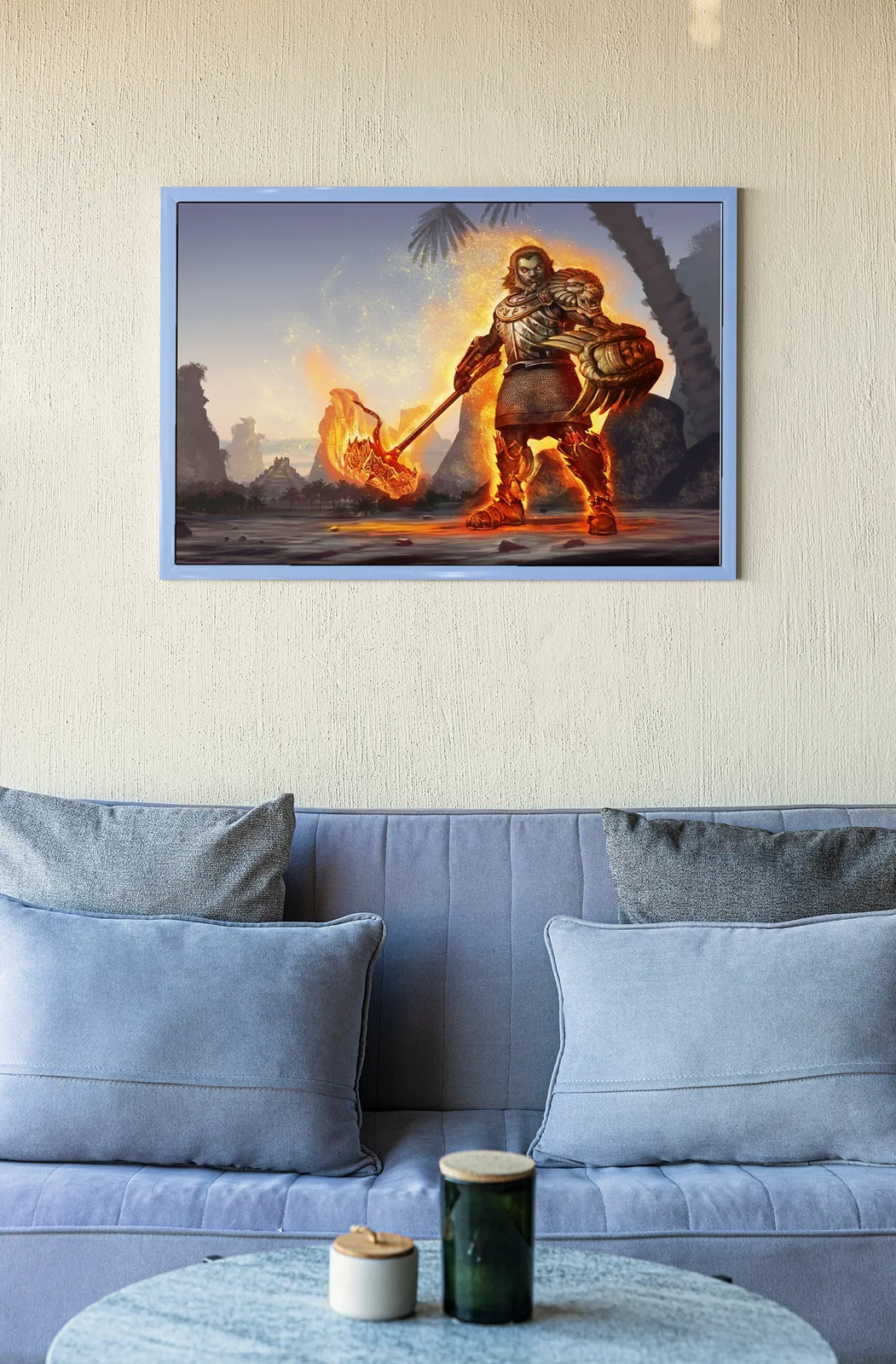 Danilkar Farbrance gallery canvas print depicts a towering warrior wreathed in fire, standing unbroken amid scorched stone and molten light. From the first moment, strength and resolve dominate the composition. As a result, the figure feels legendary rather than merely powerful.