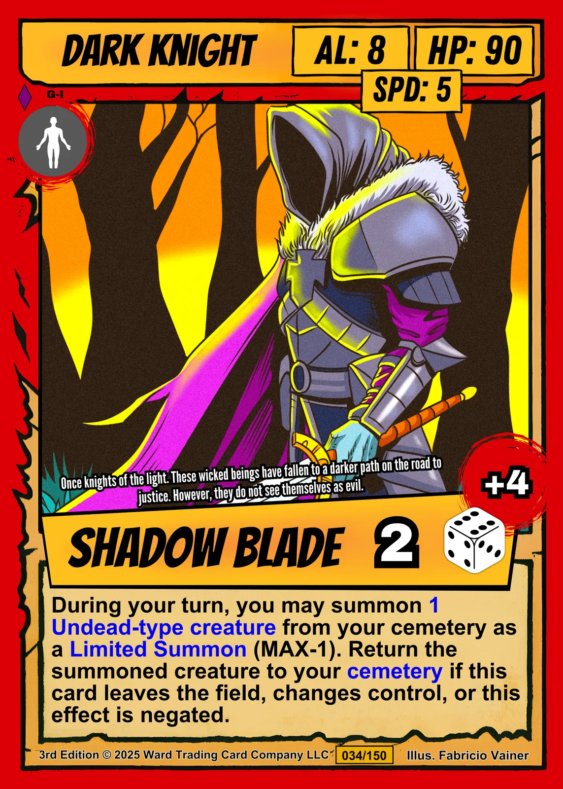 Equally, the gradient background shifts from deep amber to golden yellow behind skeletal trees. Purple plate armor contrasts sharply with the white fur-lined cloak. Moreover, red dice symbols and stat boxes frame the Shadow Blade ability text.