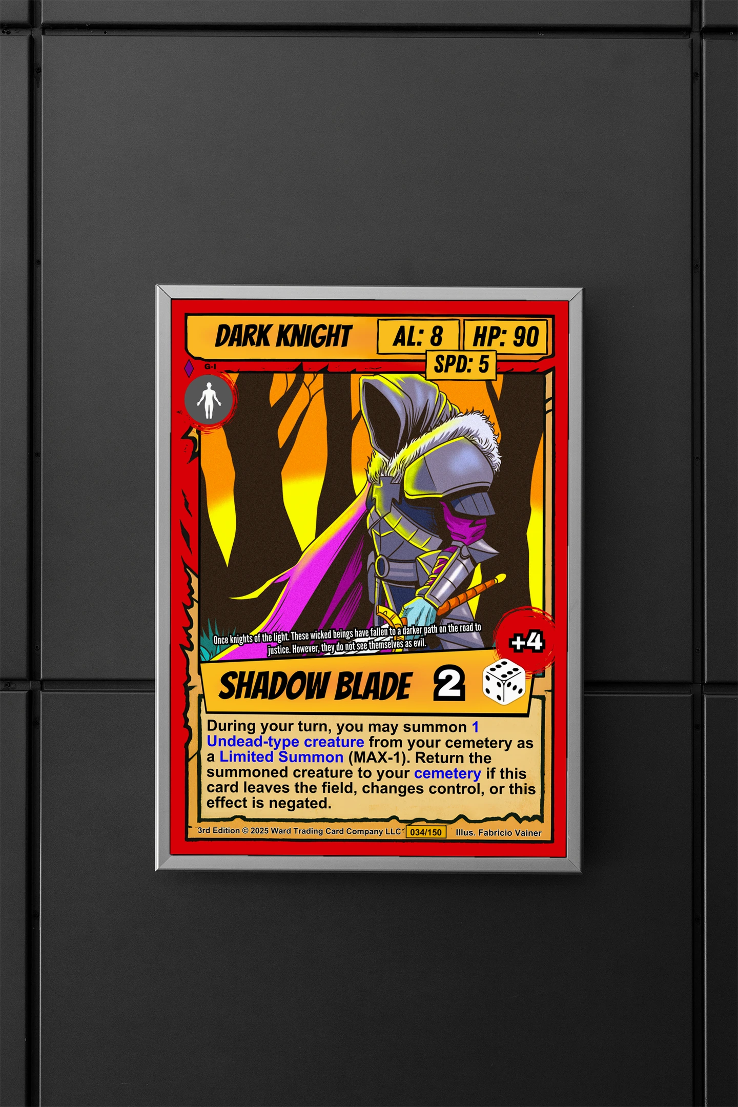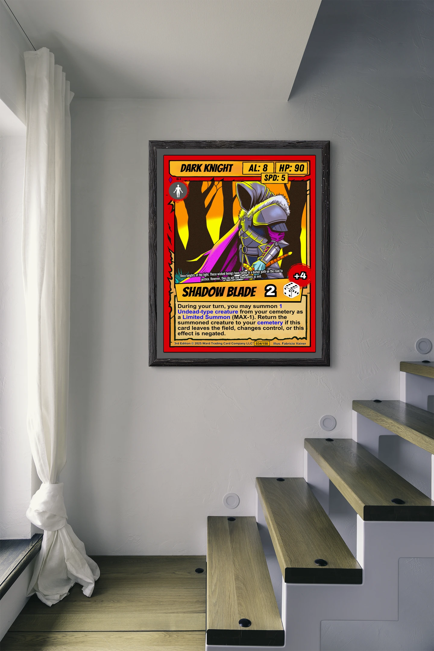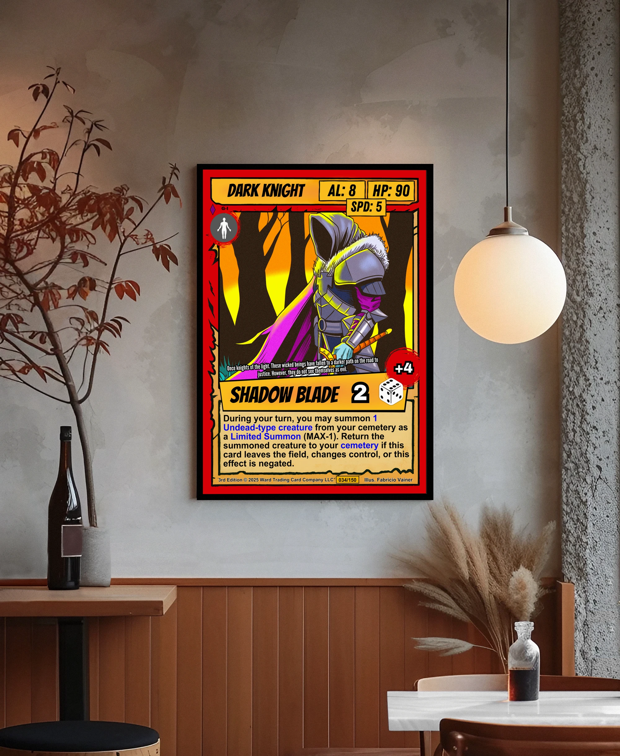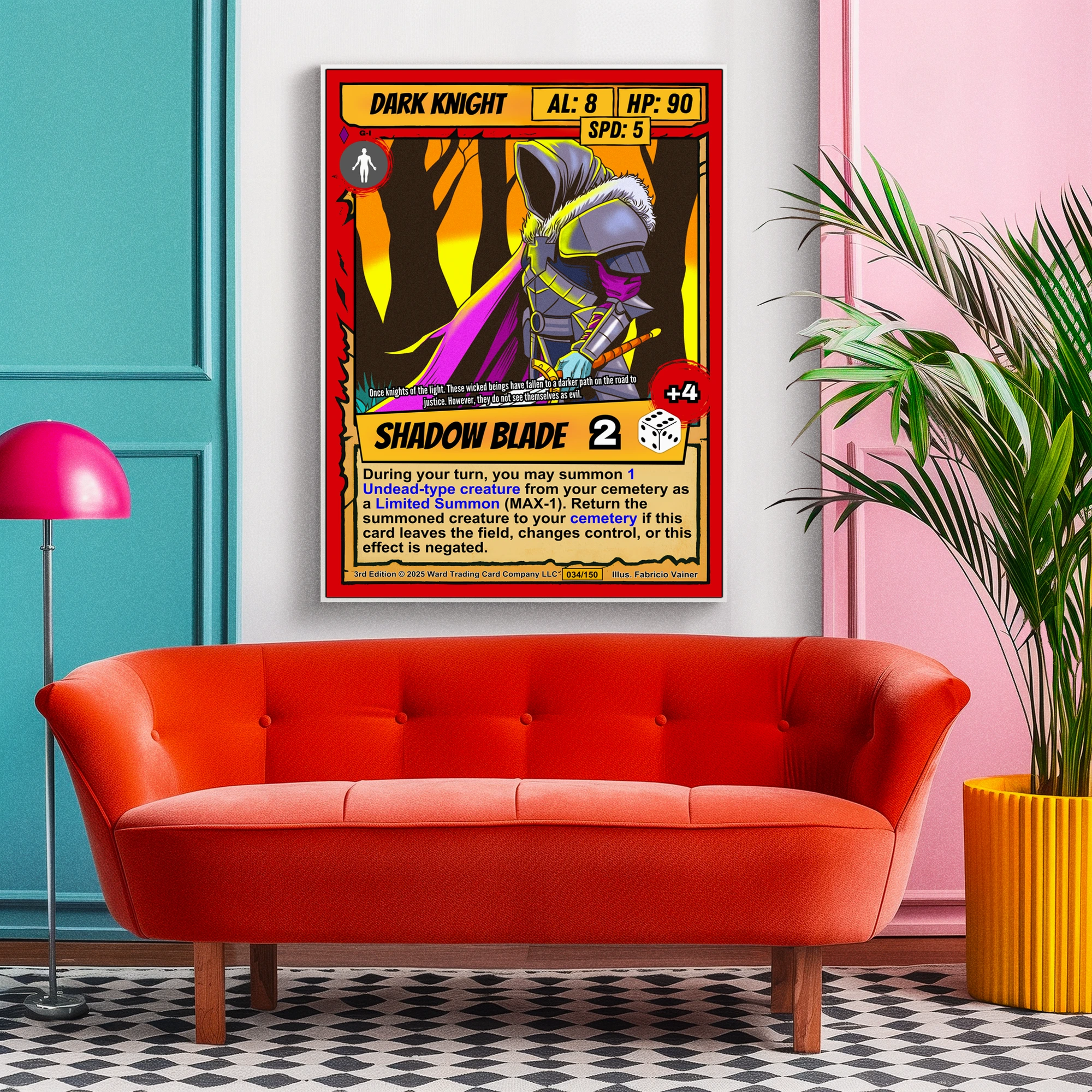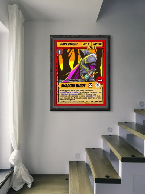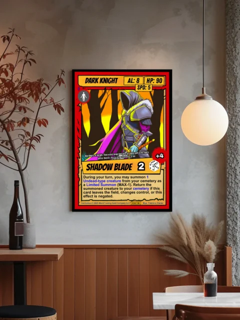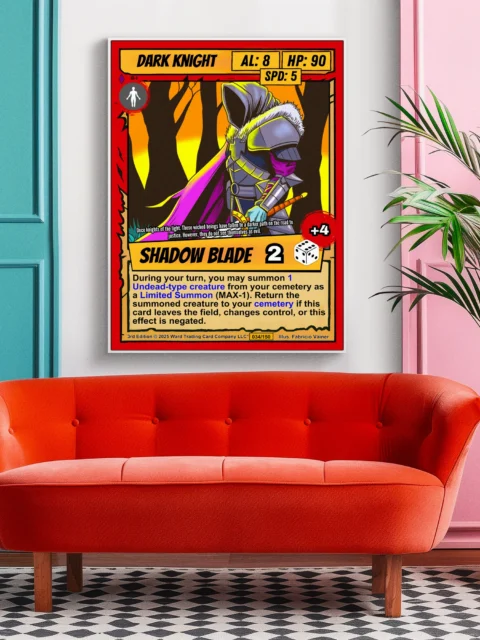DMs running dark fantasy campaigns find this knight perfect for villain reveals. TCG collectors appreciate Ward’s retro comic aesthetic and strategic gameplay depth. Particularly, this dark knight trading card canvas print commands respect in dedicated tabletop spaces.
