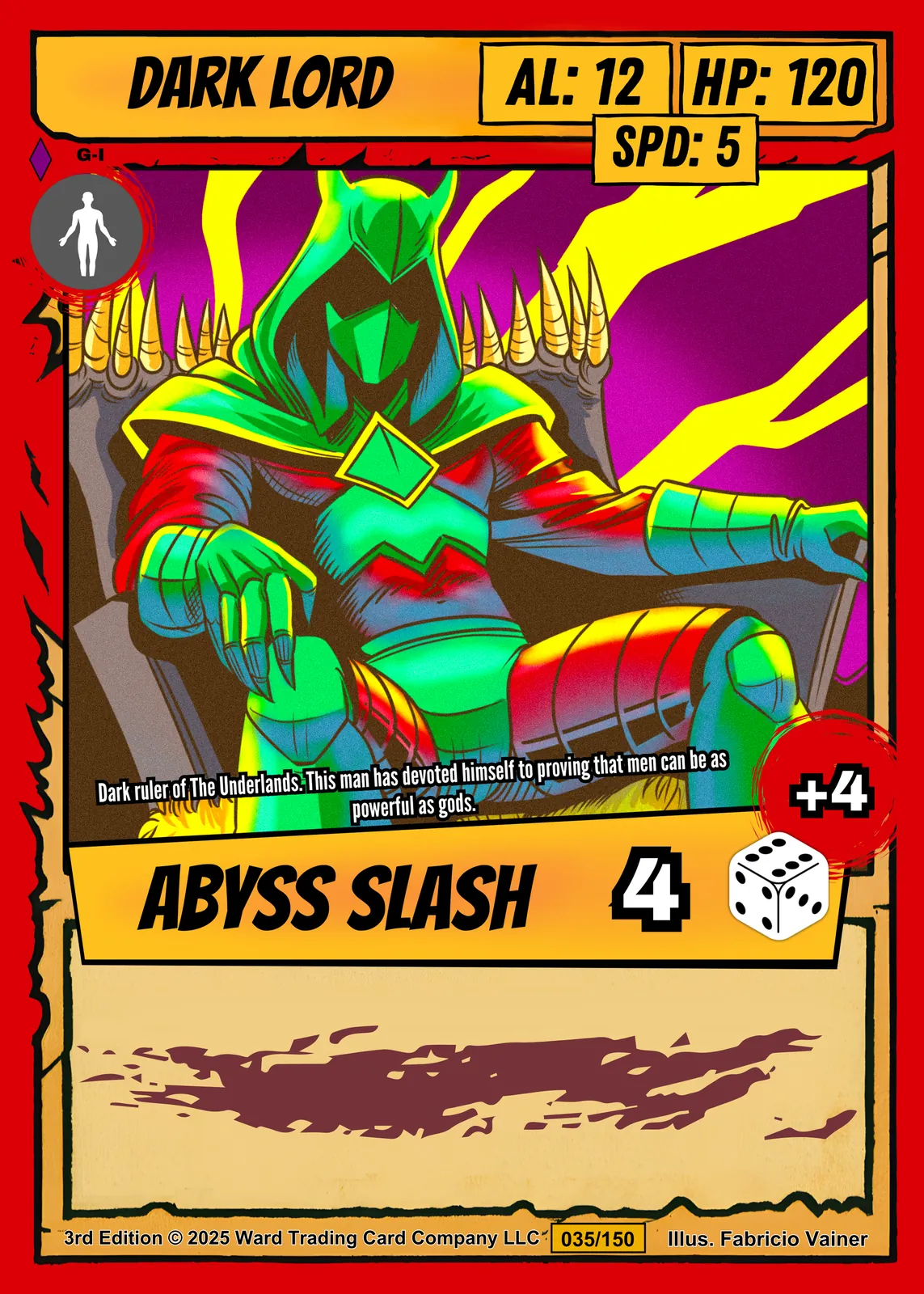 An armored figure commands from a stone throne beneath crackling lightning. This dark lord trading card canvas print captures Fabricio Vainer’s bold comic styling. Notably, neon greens and electric blues clash against deep purple shadows.