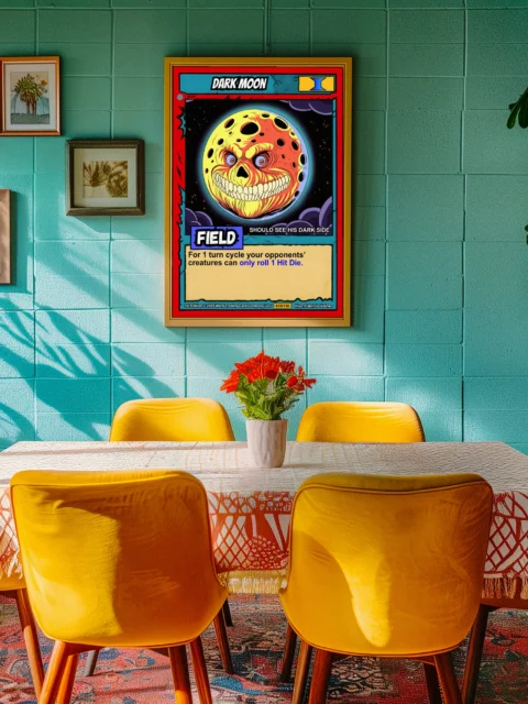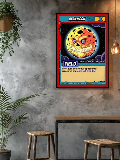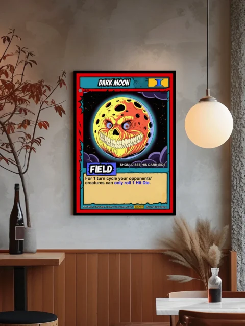 At room scale, the comic book linework and high-contrast colors create immediate visual impact. This dark moon trading card canvas print appeals to Ward TCG collectors seeking Gen 3 artwork. The sinister grin and surreal horror cartoon style dominate wall space with darkly humorous presence.