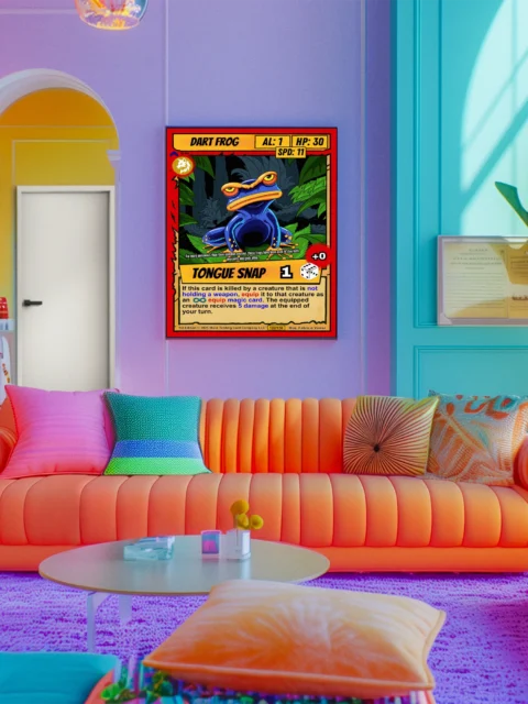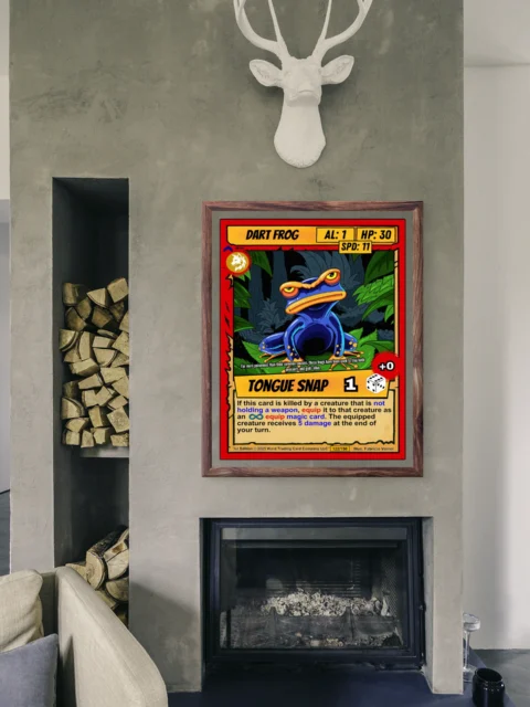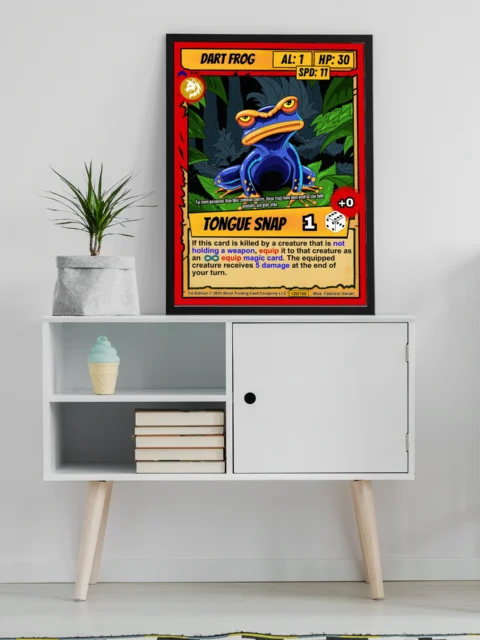 The heavy black outlines and flat color fills read clearly from across a room. Collectors of creature-based card games recognize the cel-shaded cartoon style immediately. This dart frog trading card canvas print works for fans who want their amphibian cards at wall scale.