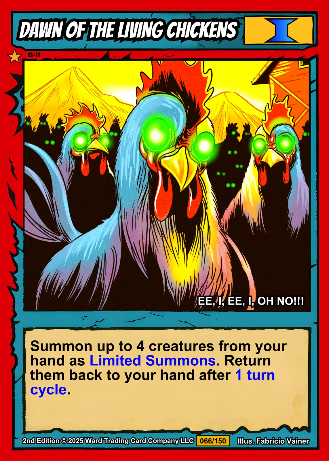Furthermore, the turquoise title banner contrasts sharply with the dark silhouettes behind each chicken. The tan game text box anchors the bottom composition with classic TCG formatting. Indeed, Vainer’s cel-shaded style brings 90s comic book energy to undead farm animals.