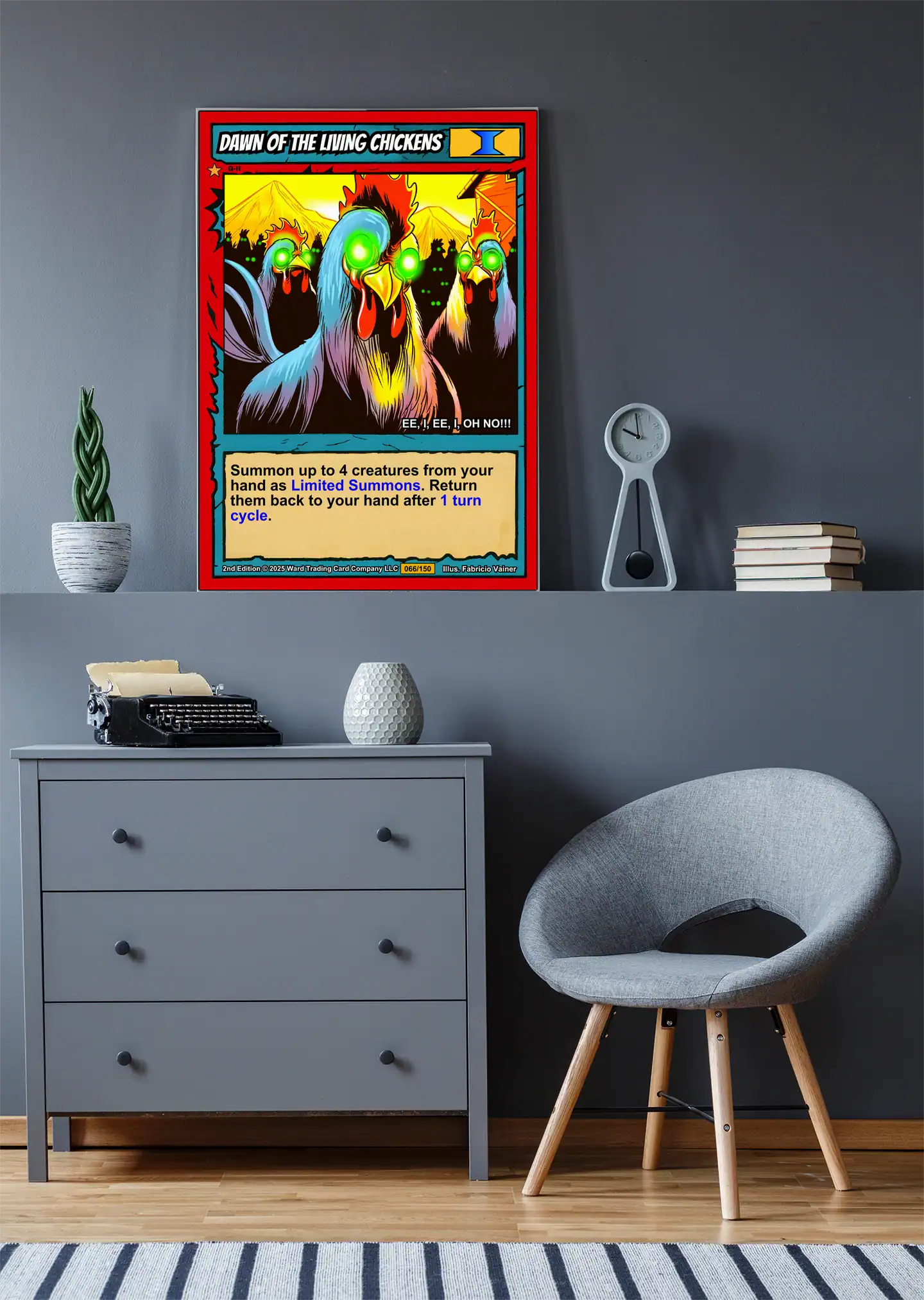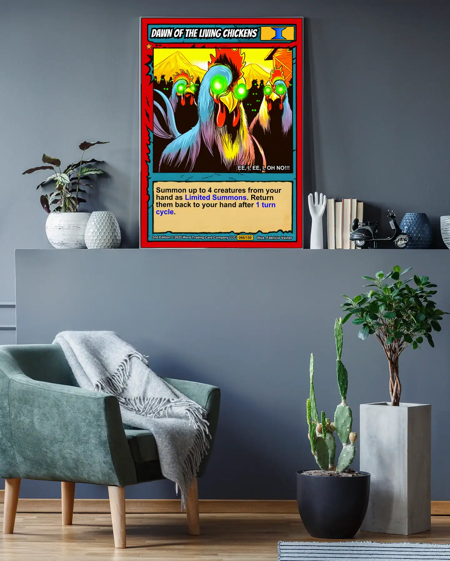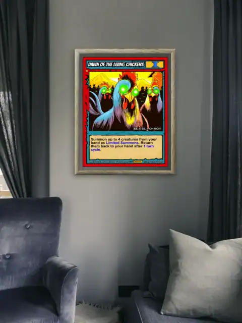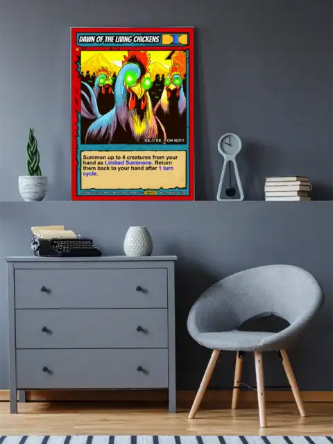 Horror fans need comedy relief between their serious monster collections. Collectors who appreciate campy takes on classic zombie tropes find perfect balance here. Moreover, this dawn of the living chickens trading card canvas print delivers Ward TCG’s playful spirit.