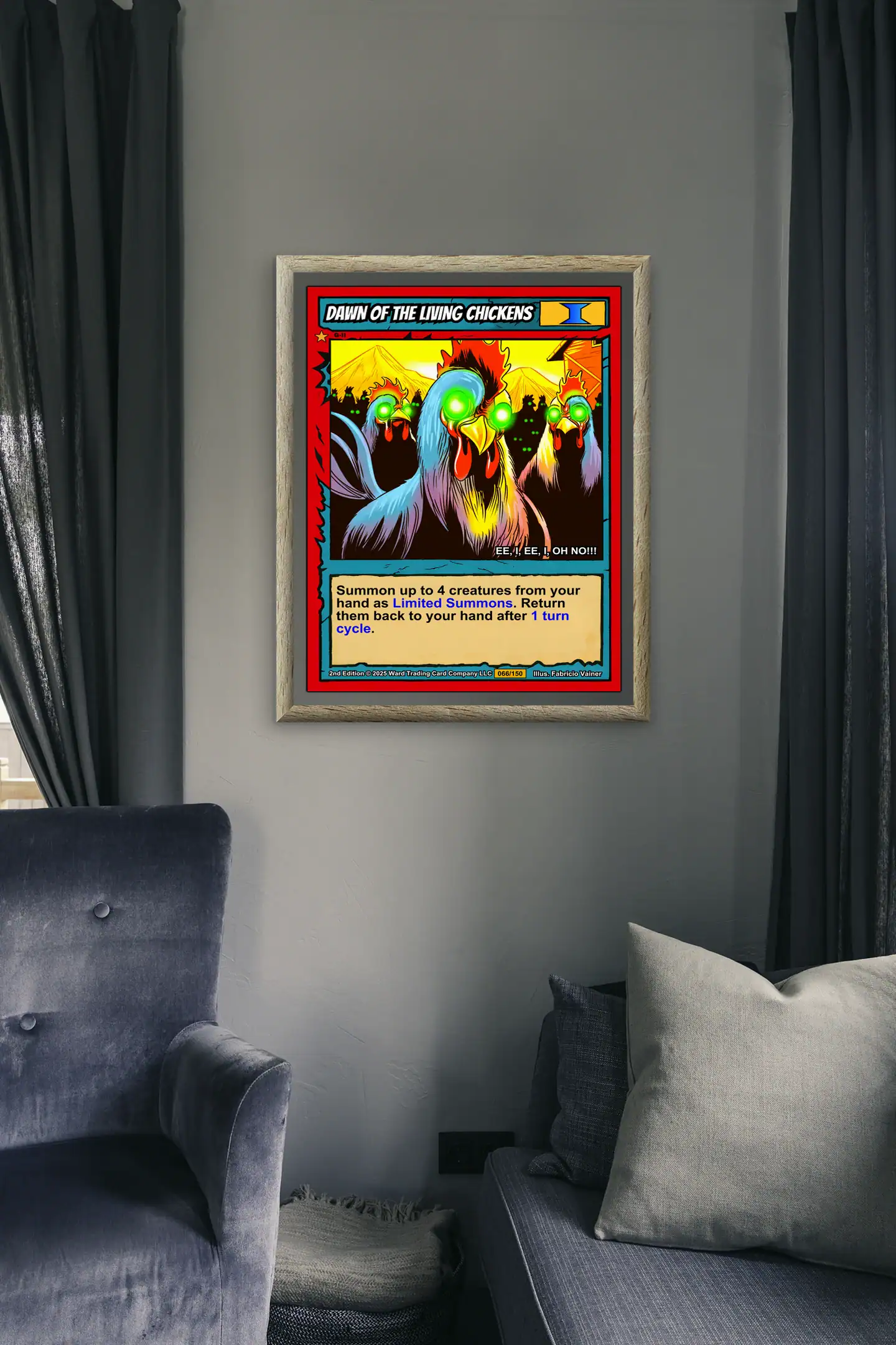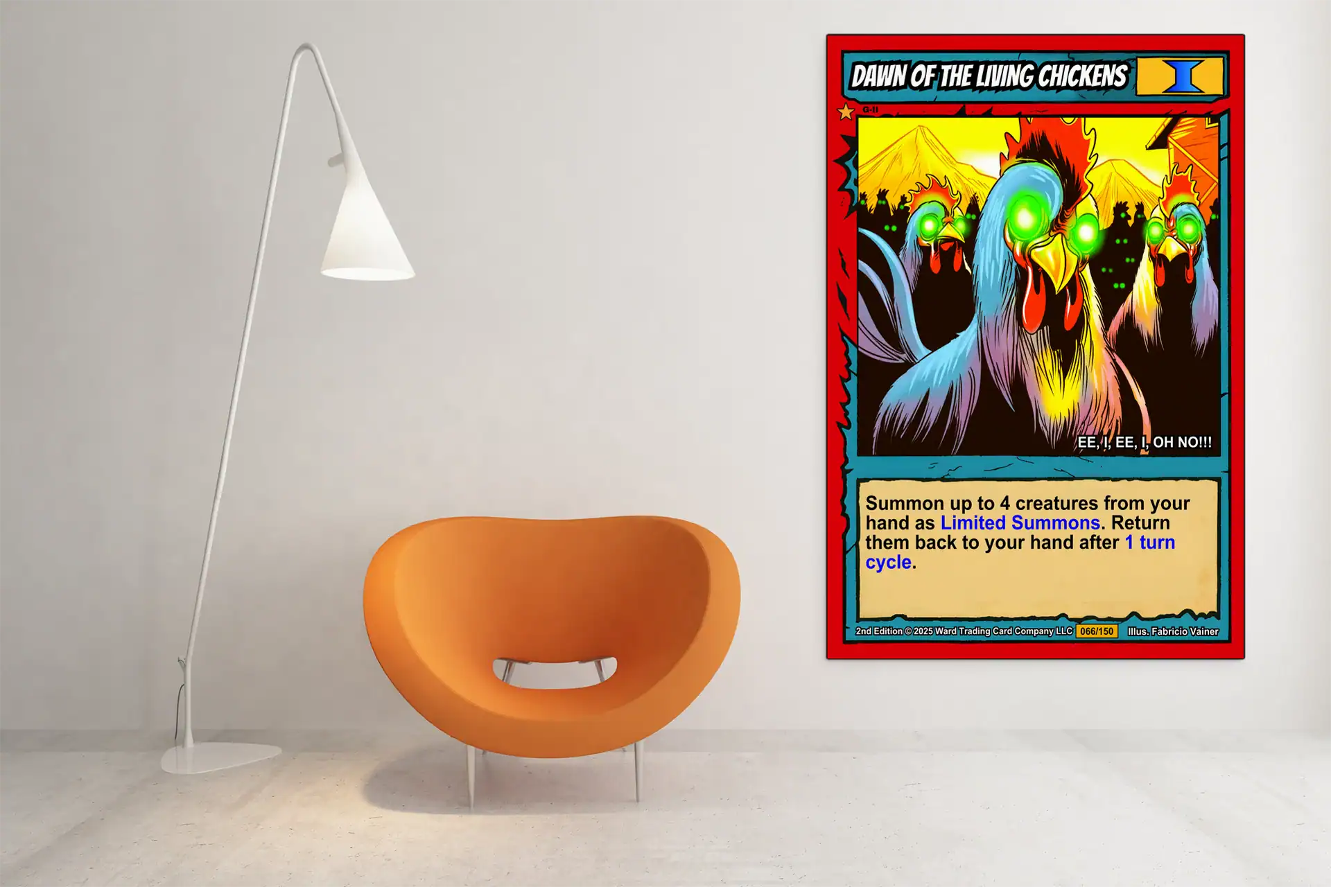 Three zombie chickens stare with glowing green eyes and bloodshot wattles. This dawn of the living chickens trading card canvas print captures Fabricio Vainer’s horror-comedy illustration. Notably, the bright red border frames pale undead poultry against yellow sky.