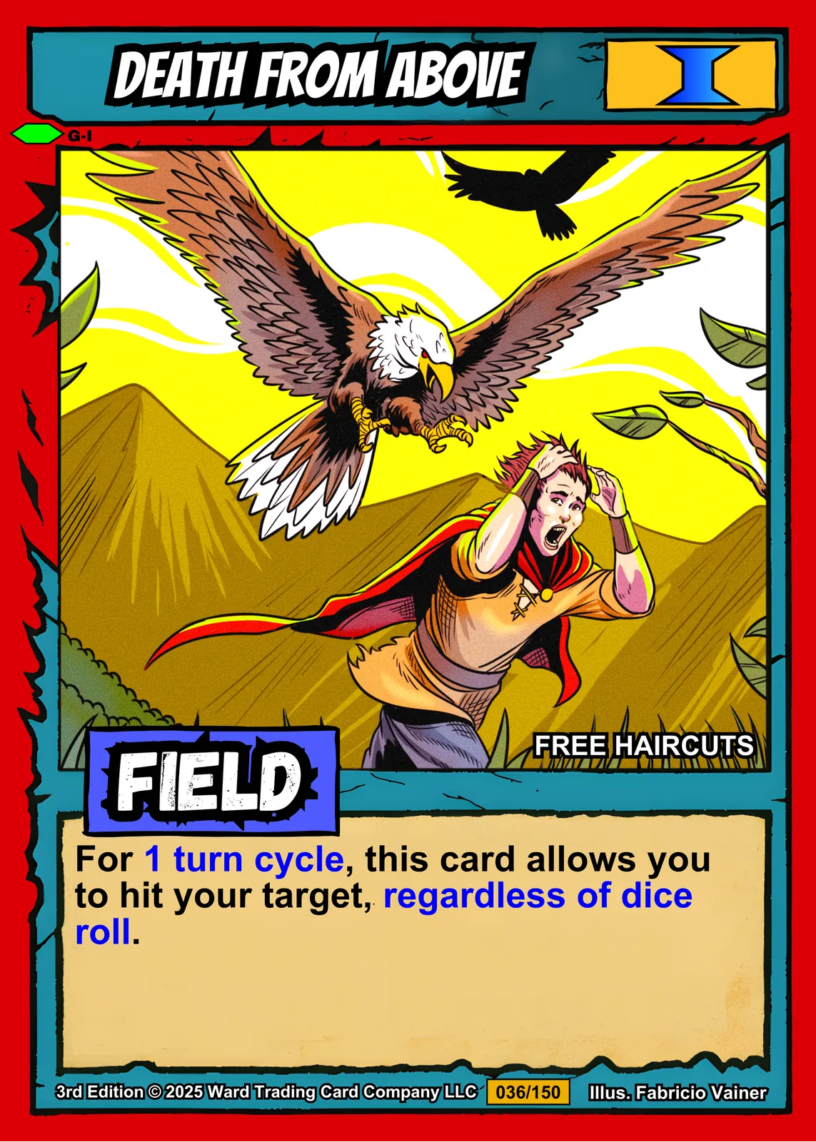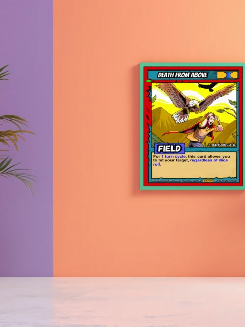 A massive eagle dives with talons extended toward a terrified warrior below. This death from above trading card canvas print captures Fabricio Vainer’s bold action illustration. The yellow radiating background notably amplifies the dramatic aerial assault scene.