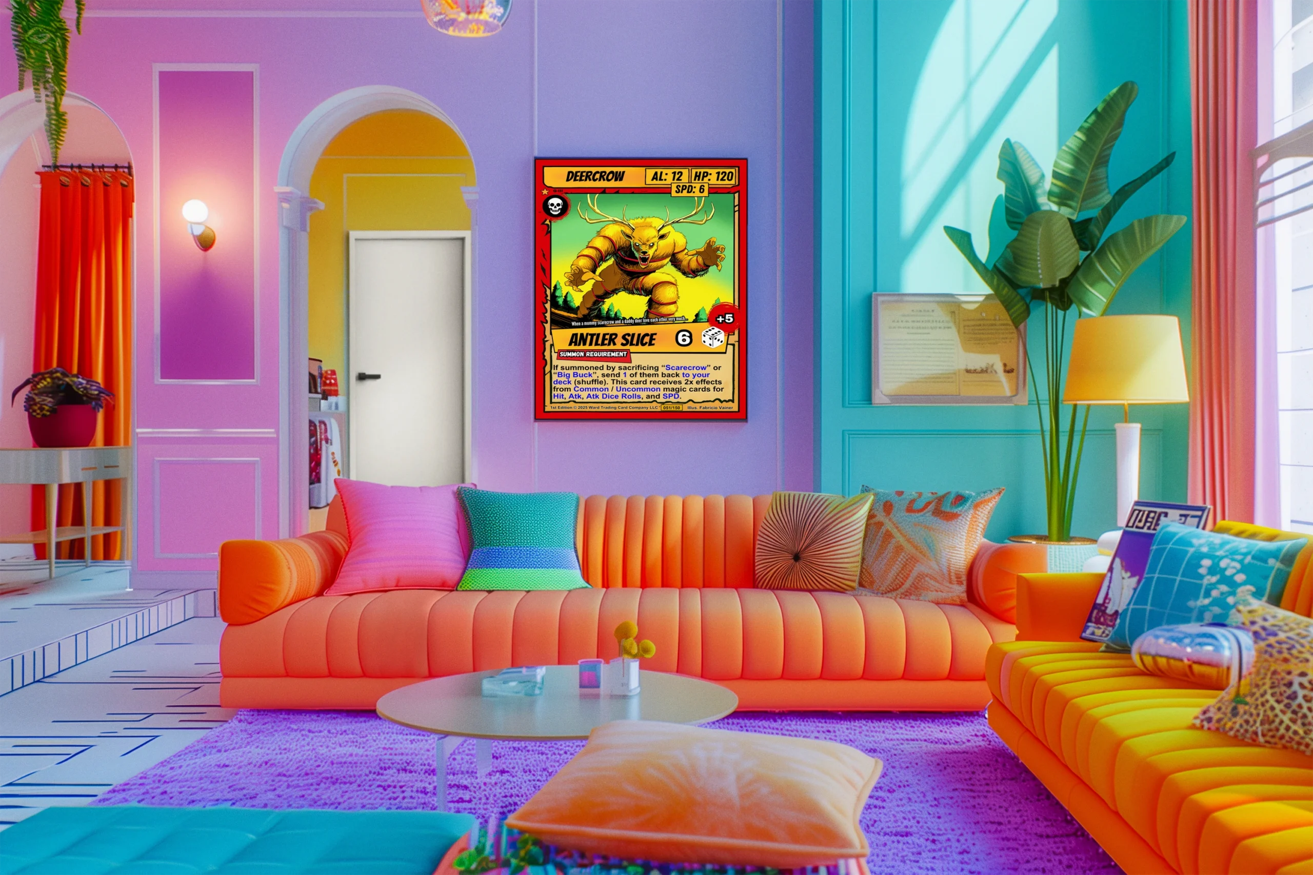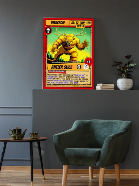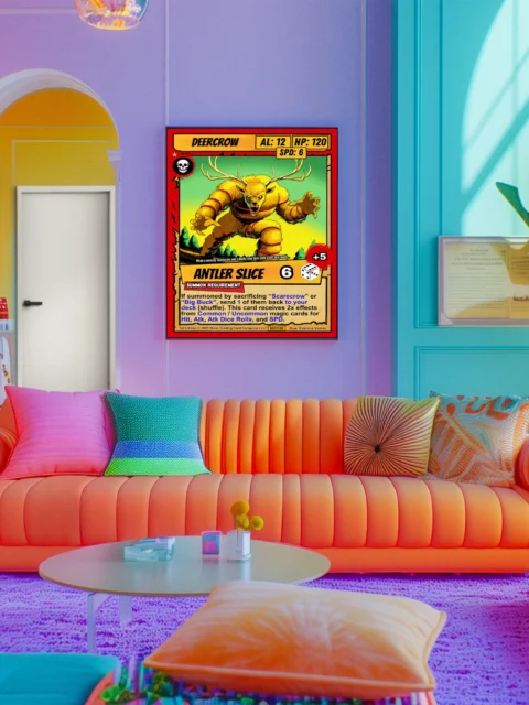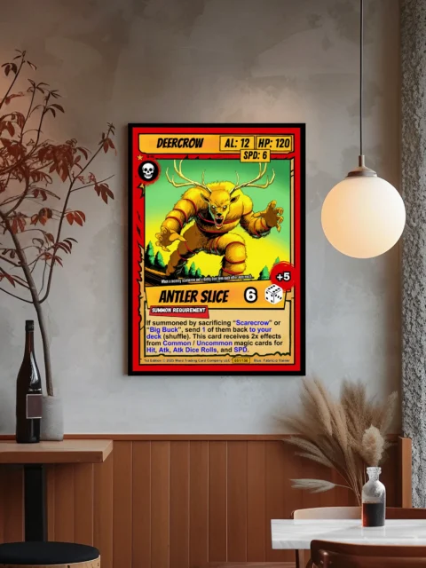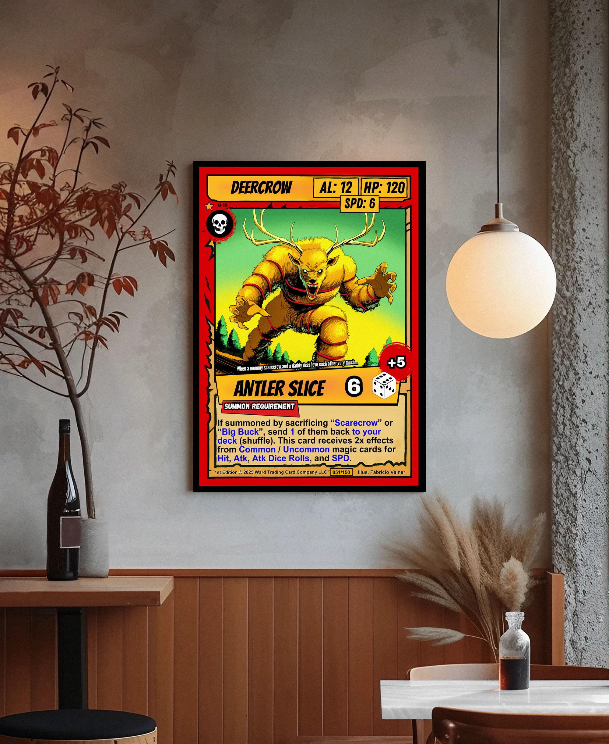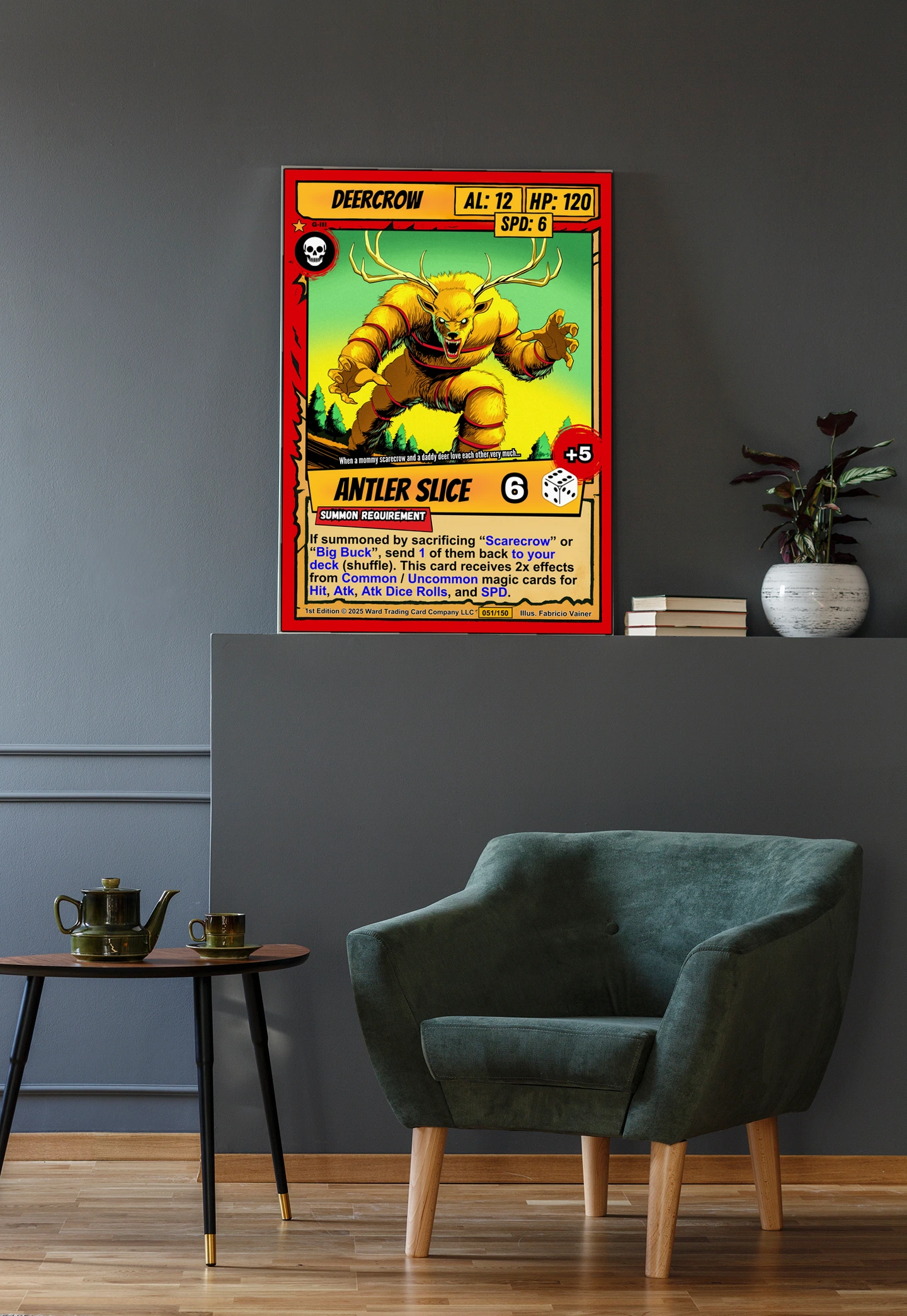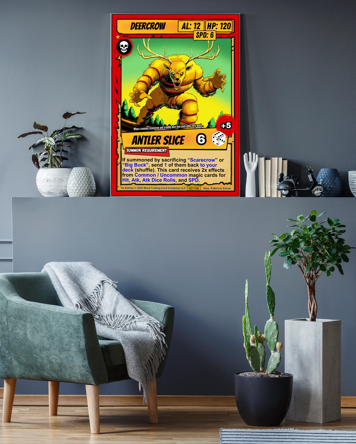 Deercrow Fantasy Wall Art from Ward TCG: A golden-furred beast with antlers and fangs snarls from within red rope bindings on card 051/150.