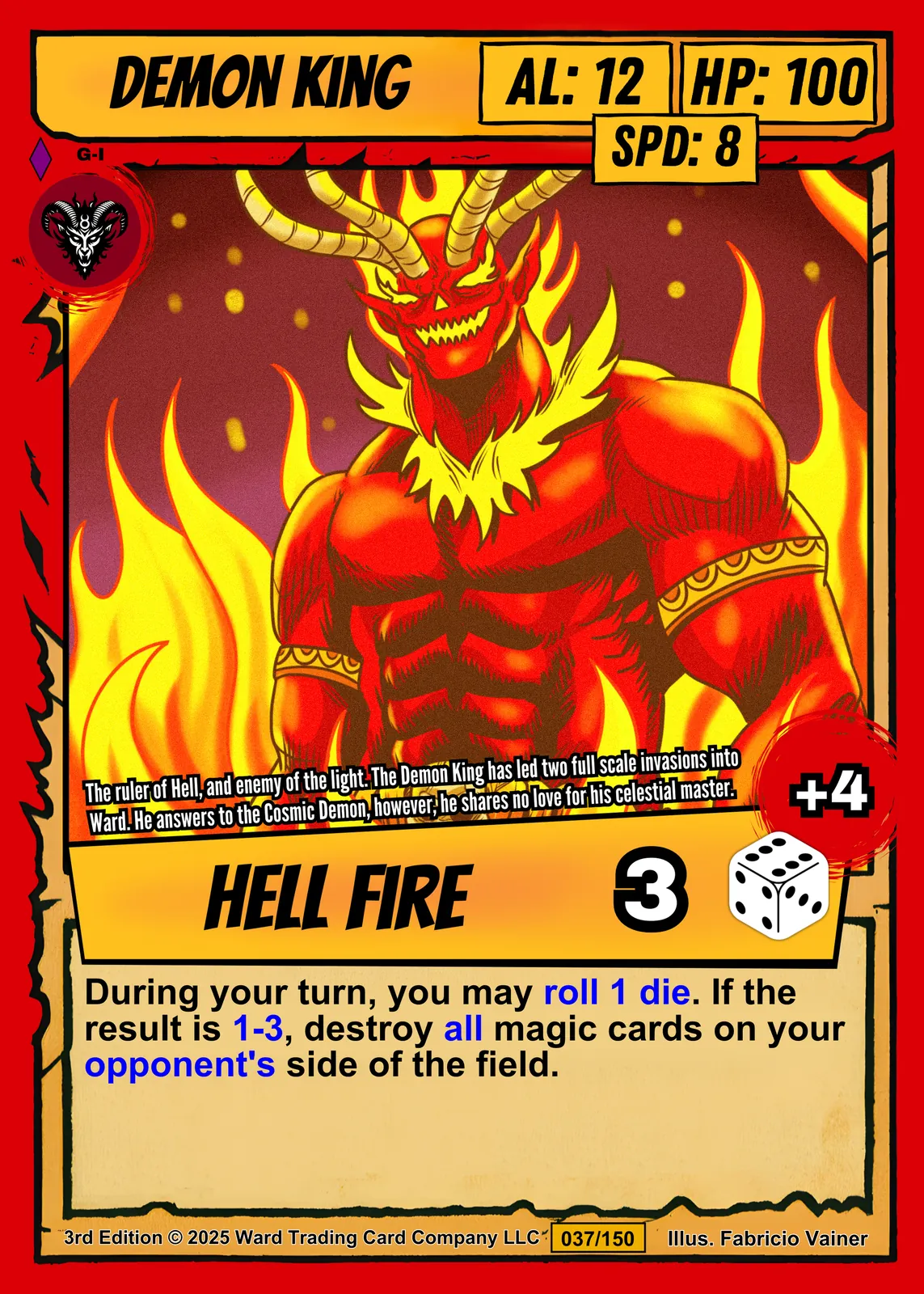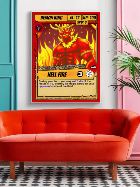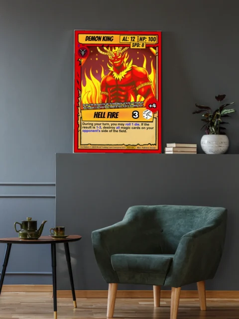The ability name ‘HELL FIRE’ appears in stylized yellow gradient text above a dice icon. Bold comic book linework and cel-shaded coloring create high contrast at room scale. This demon king trading card canvas print speaks to collectors who value Ward TCG’s original character designs.