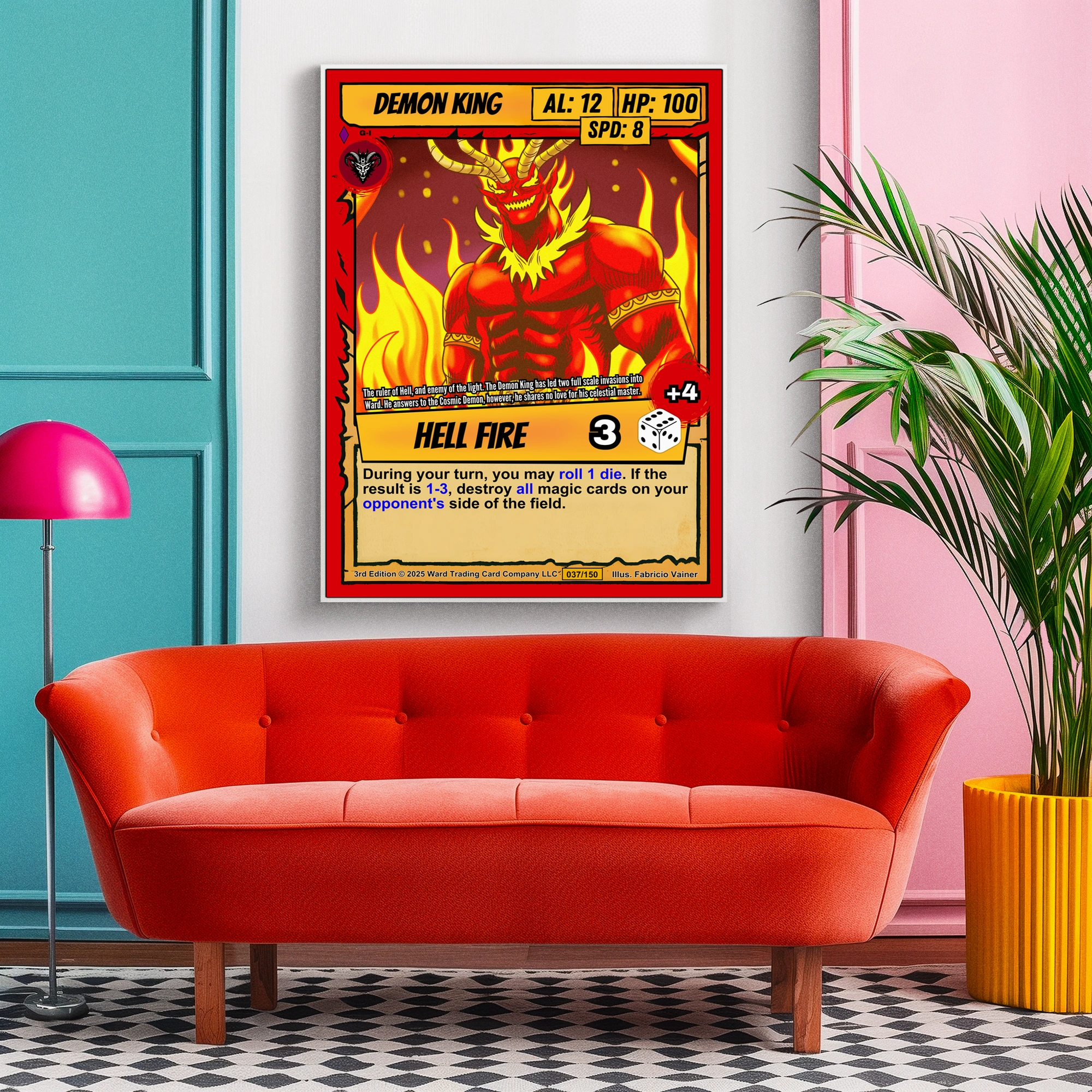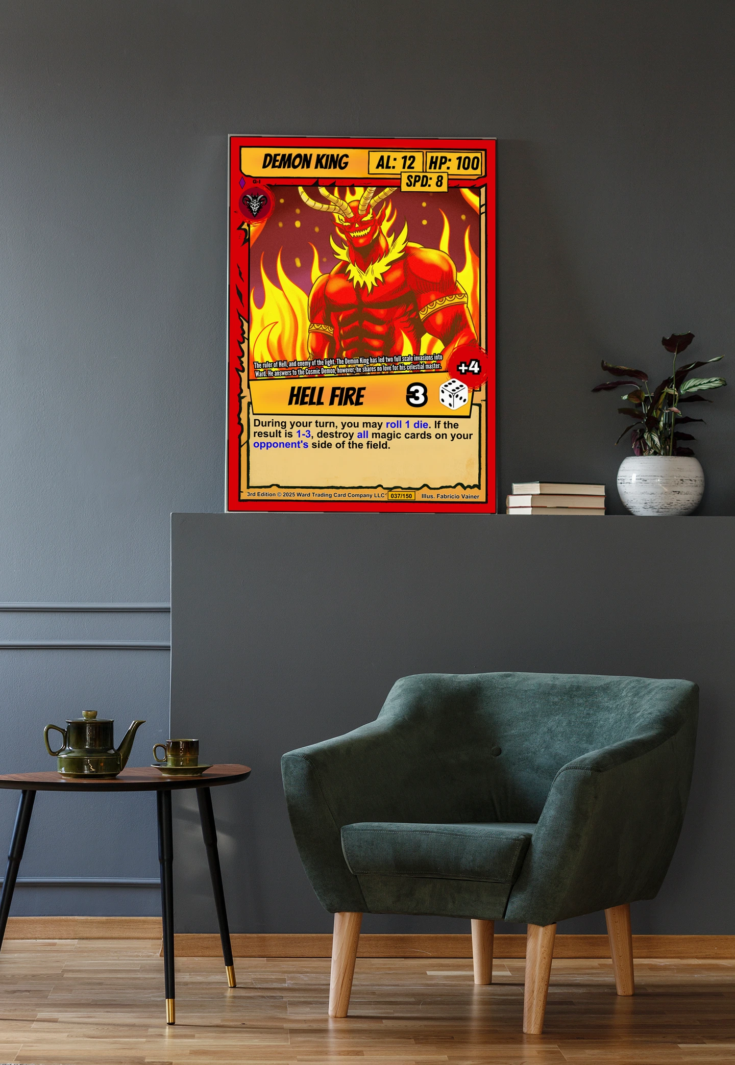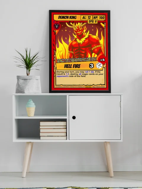 This piece anchors a Ward TCG collection wall or game room display. Indeed, the fiery palette and menacing expression command attention in dedicated hobby spaces.