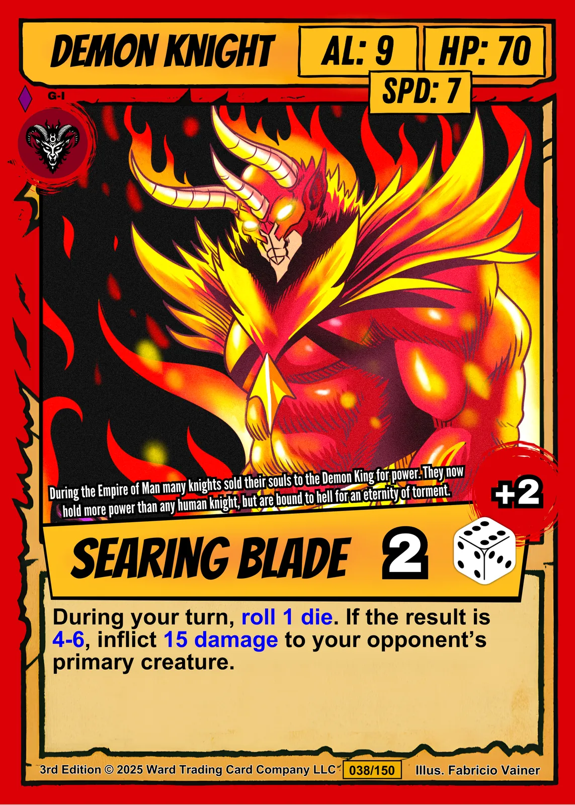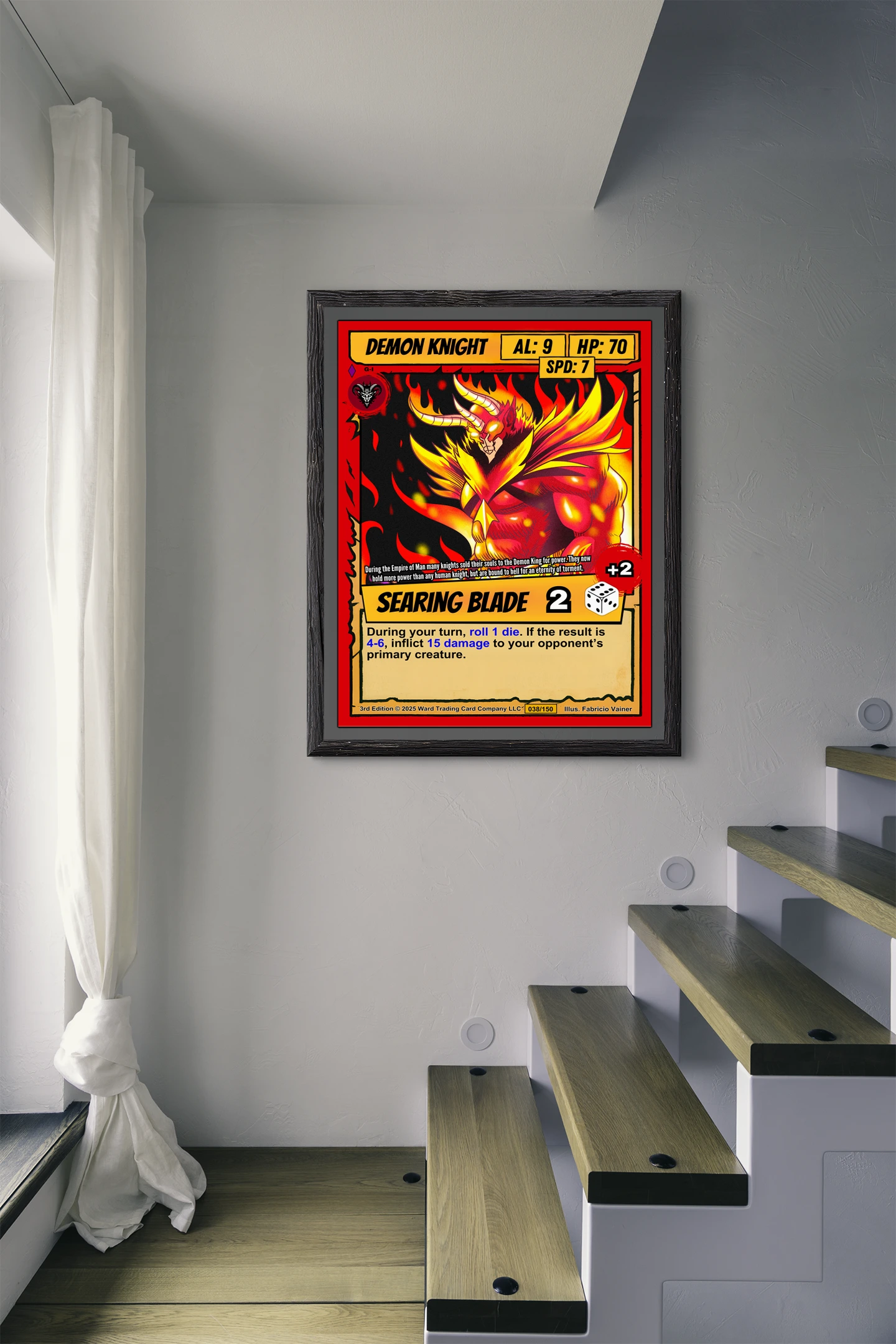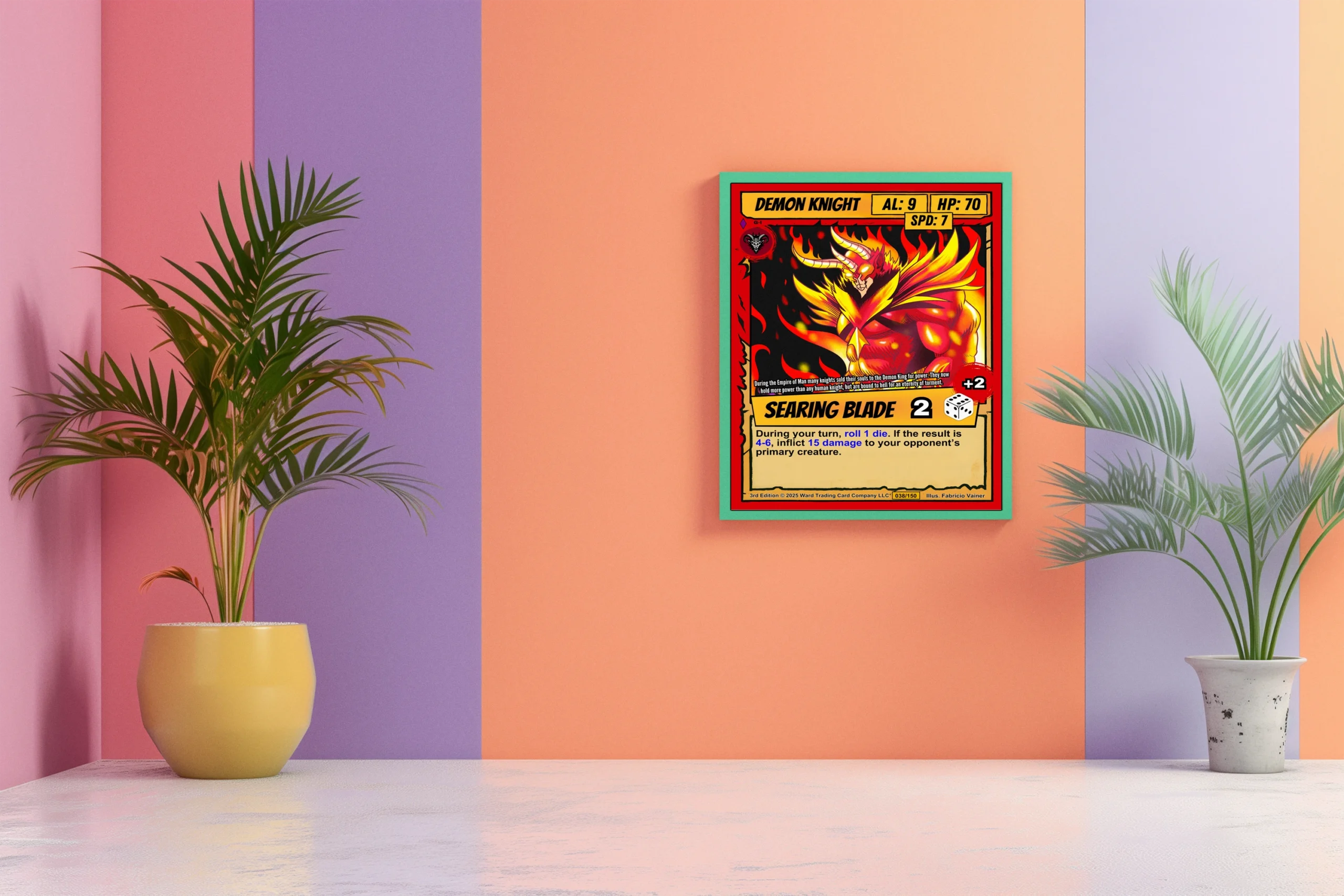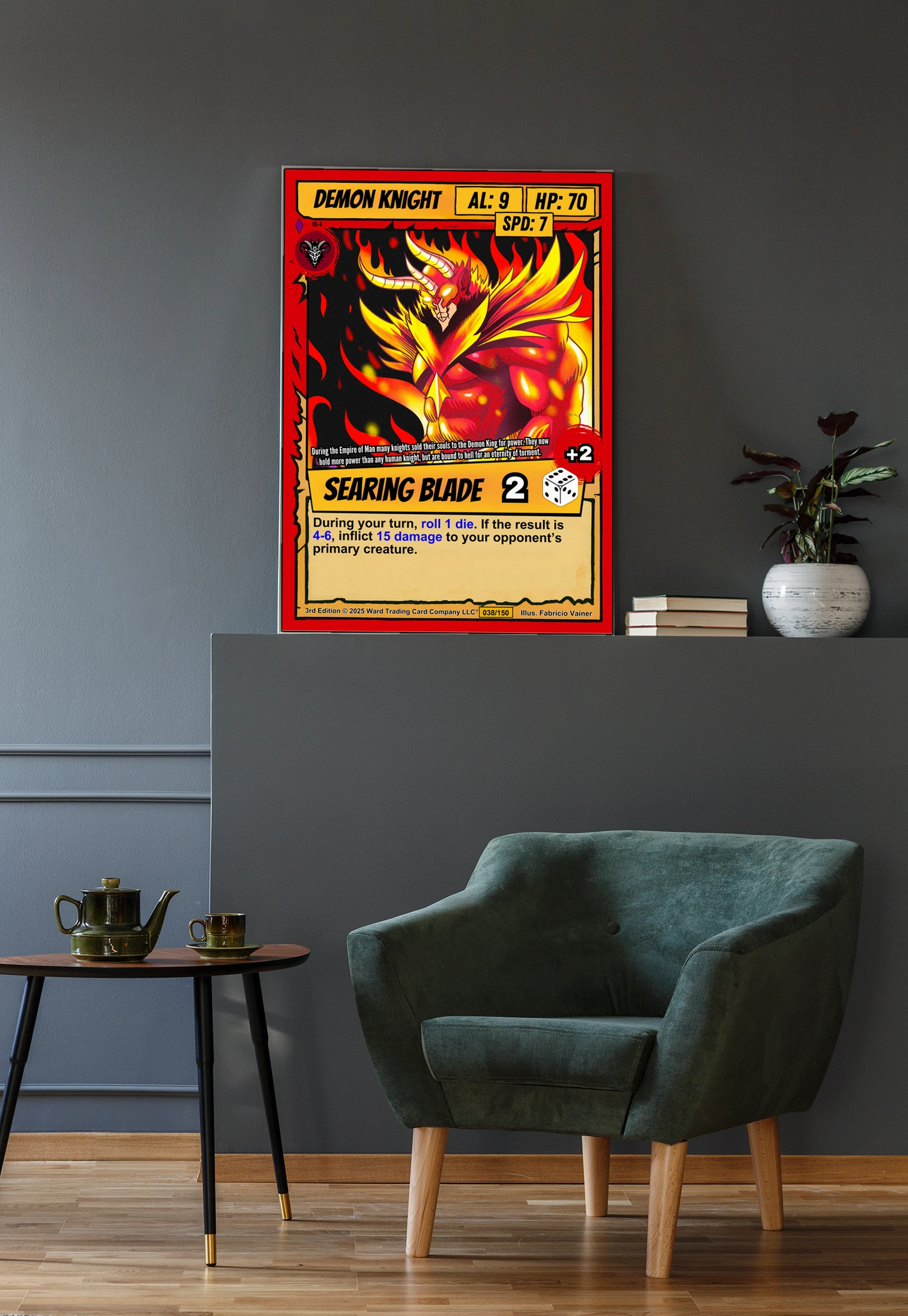 A muscular demonic figure erupts in flame across the card face. This demon knight trading card canvas print reproduces the full Ward TCG layout at display scale. Glowing yellow eyes and curved horns anchor the fierce expression.